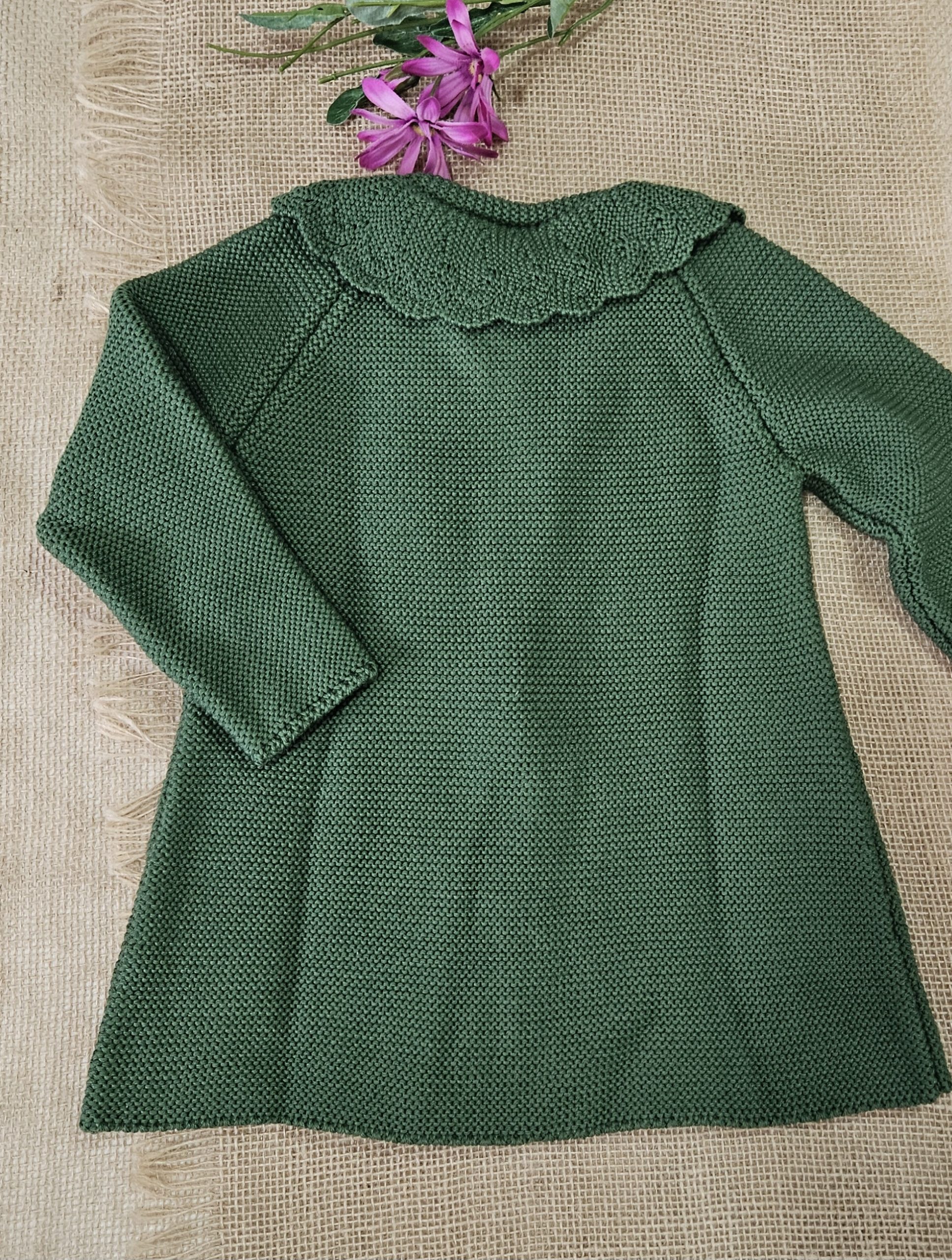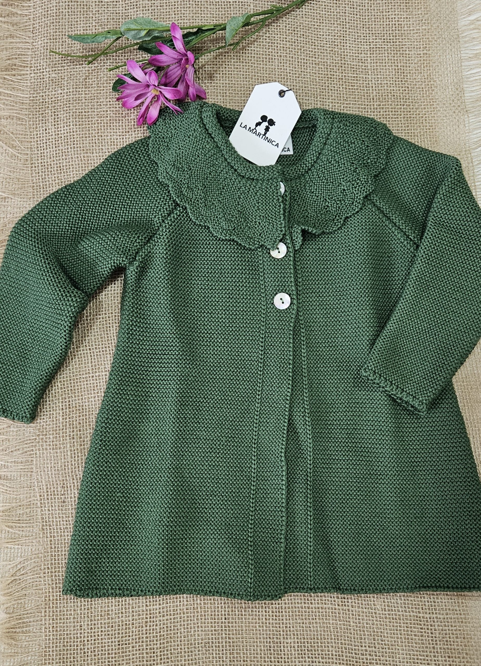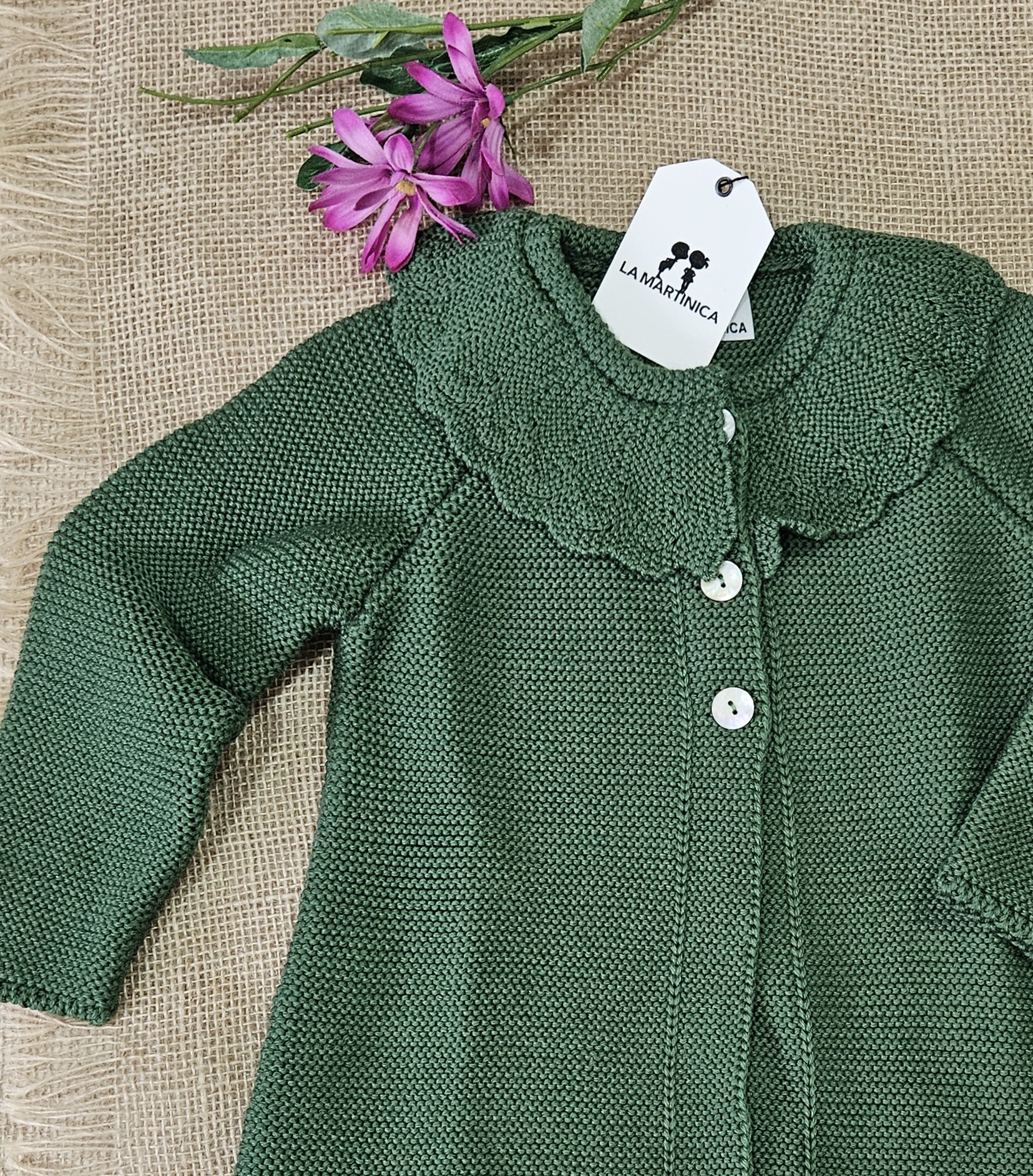 Abrigo punto para niña, cuello volante botones en parte delantera, Color Verde Musgo, ideal para completar con jesusitos y vestidos.