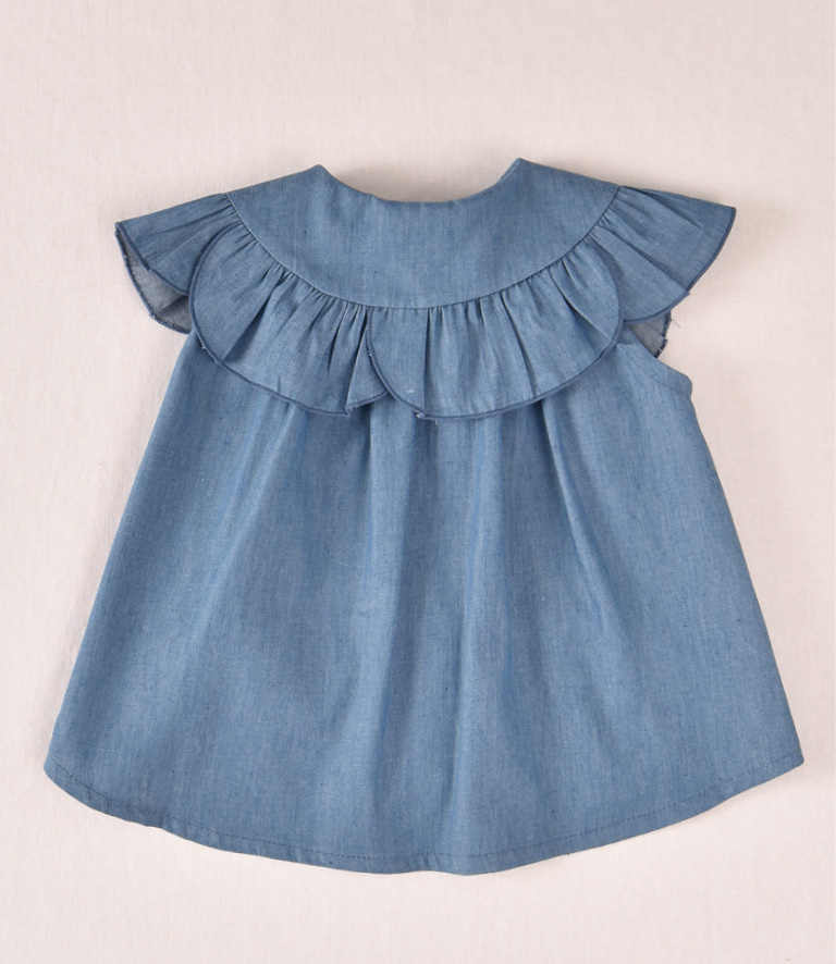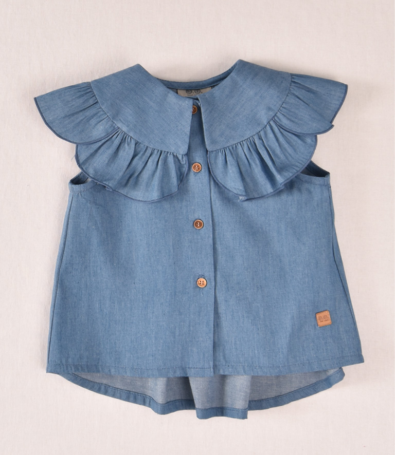 Blusa para niña  denim azul ,  manga corta adorno en parte museta de volante, José Varón Moda infantil.   ref 58034 Colección coordinada para hermanos. Primavera Verano 2026