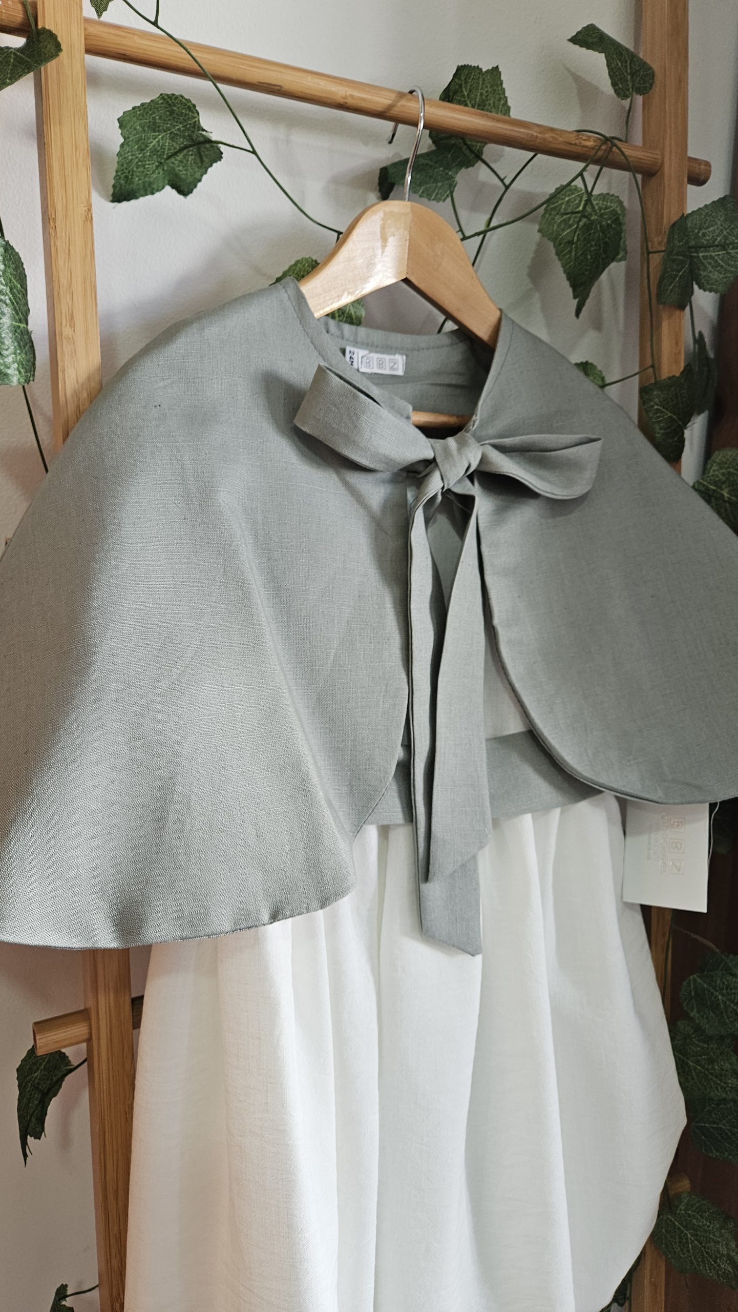 Capa para niña  color  verde Seco cierre lazada tela a juego con colección vestido niña con fajin a juego ideal para bodas y eventos.   45% Algodón, 55% lino.