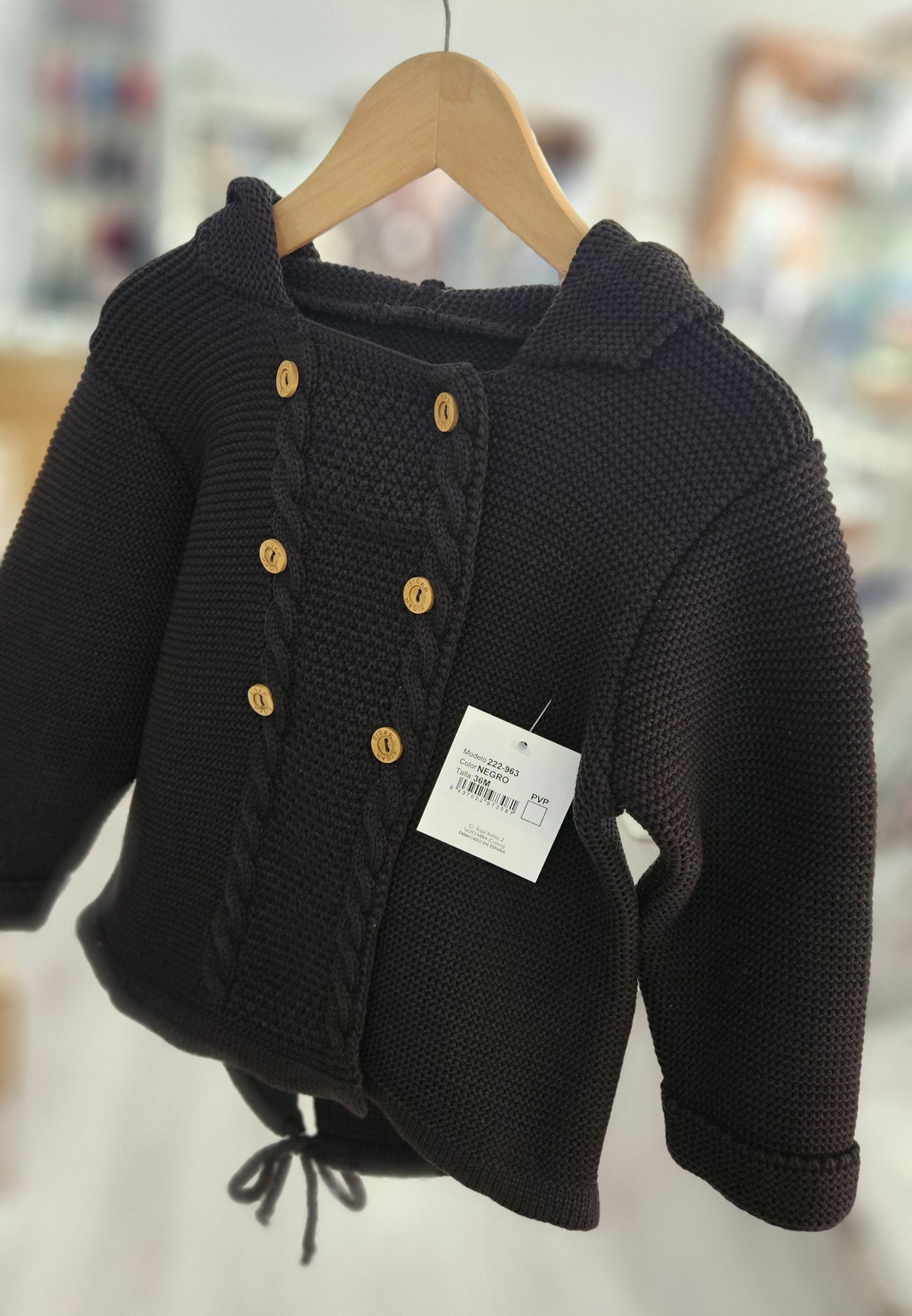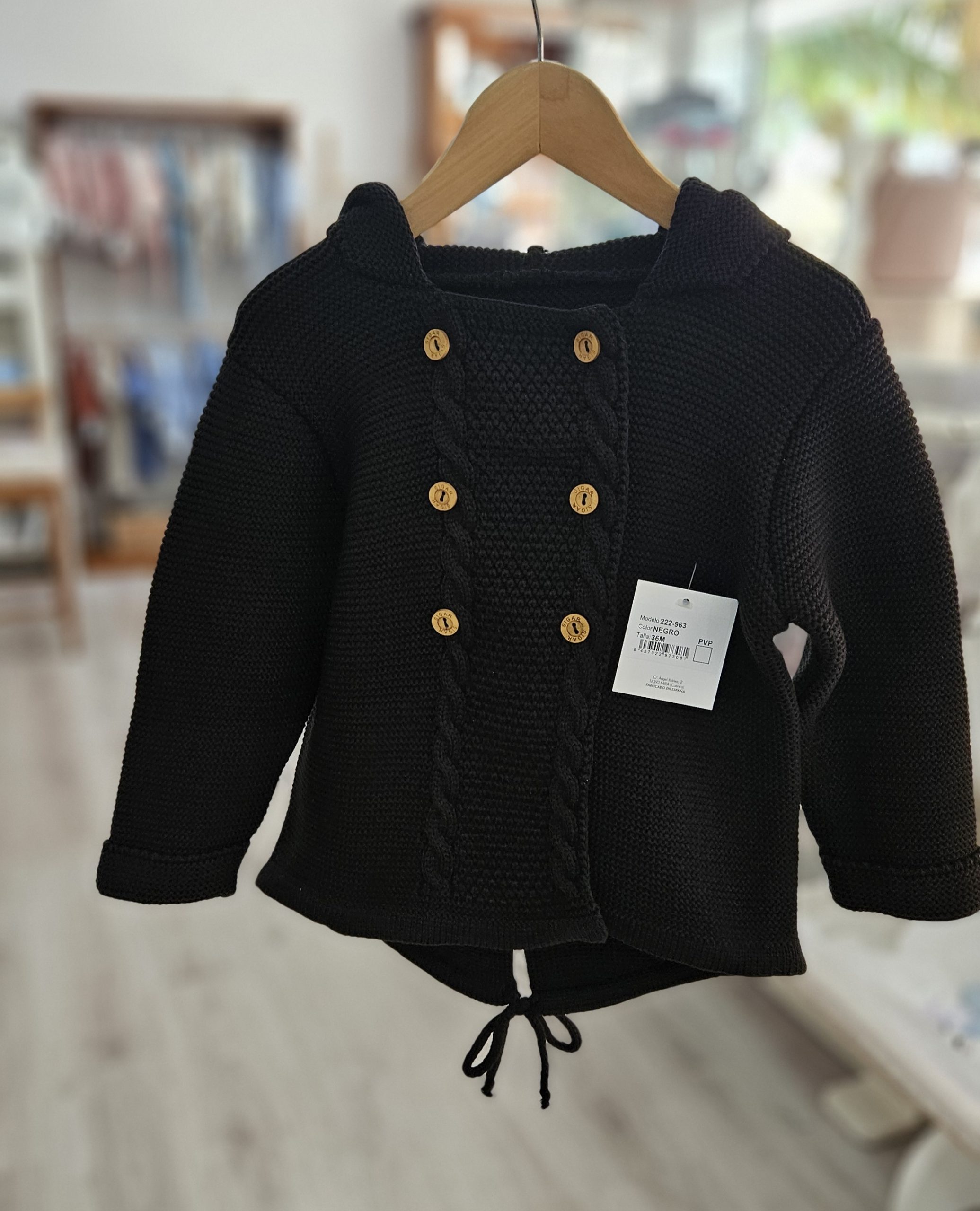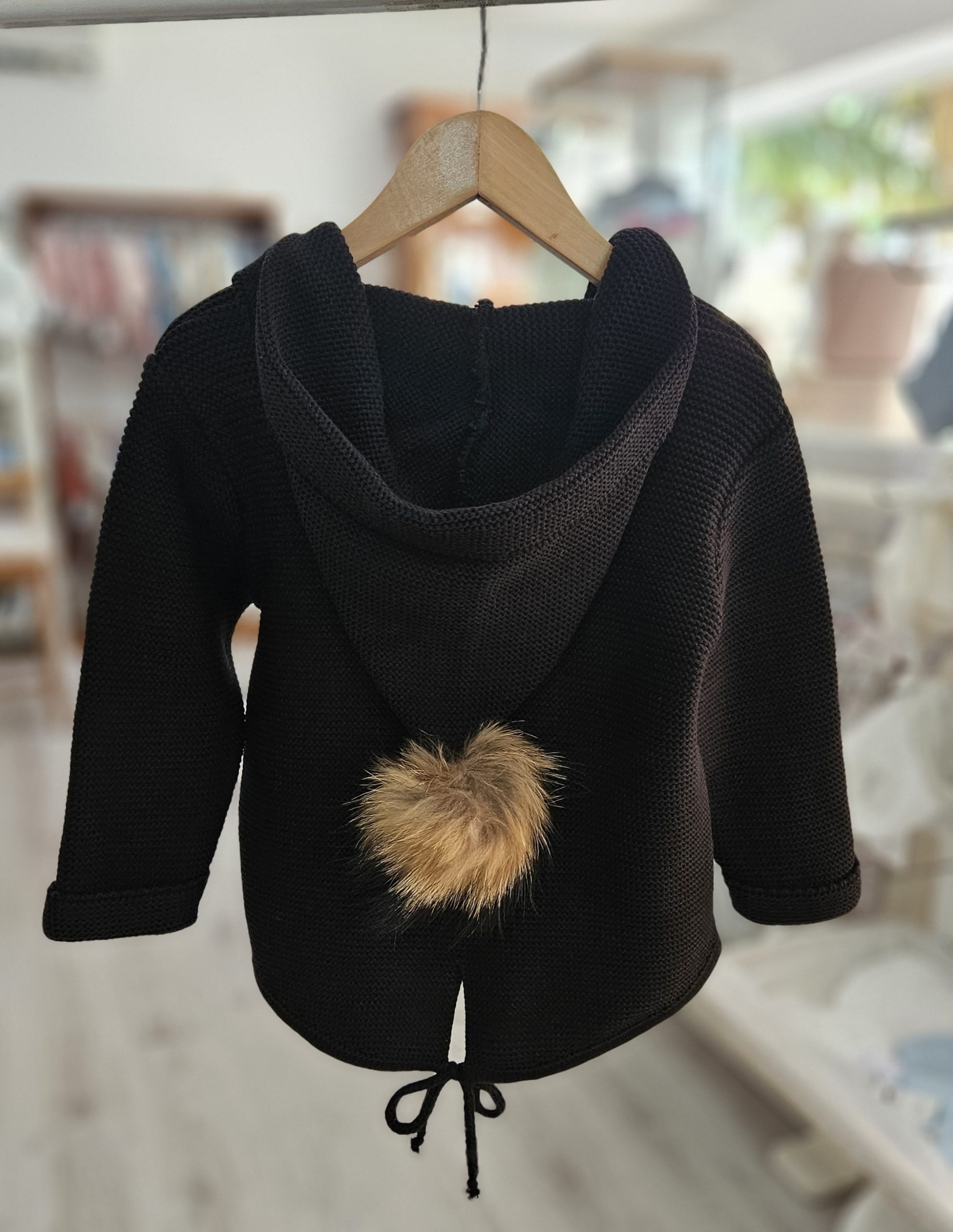 Chaqueta de punto con capucha unisex – color Negro pompón pelo natural. Composición 100% acriclico (Dralón) Diseño ligeramente más largo por la parte trasera, abotonado en parte delantera botones madera. Marca Sigar.