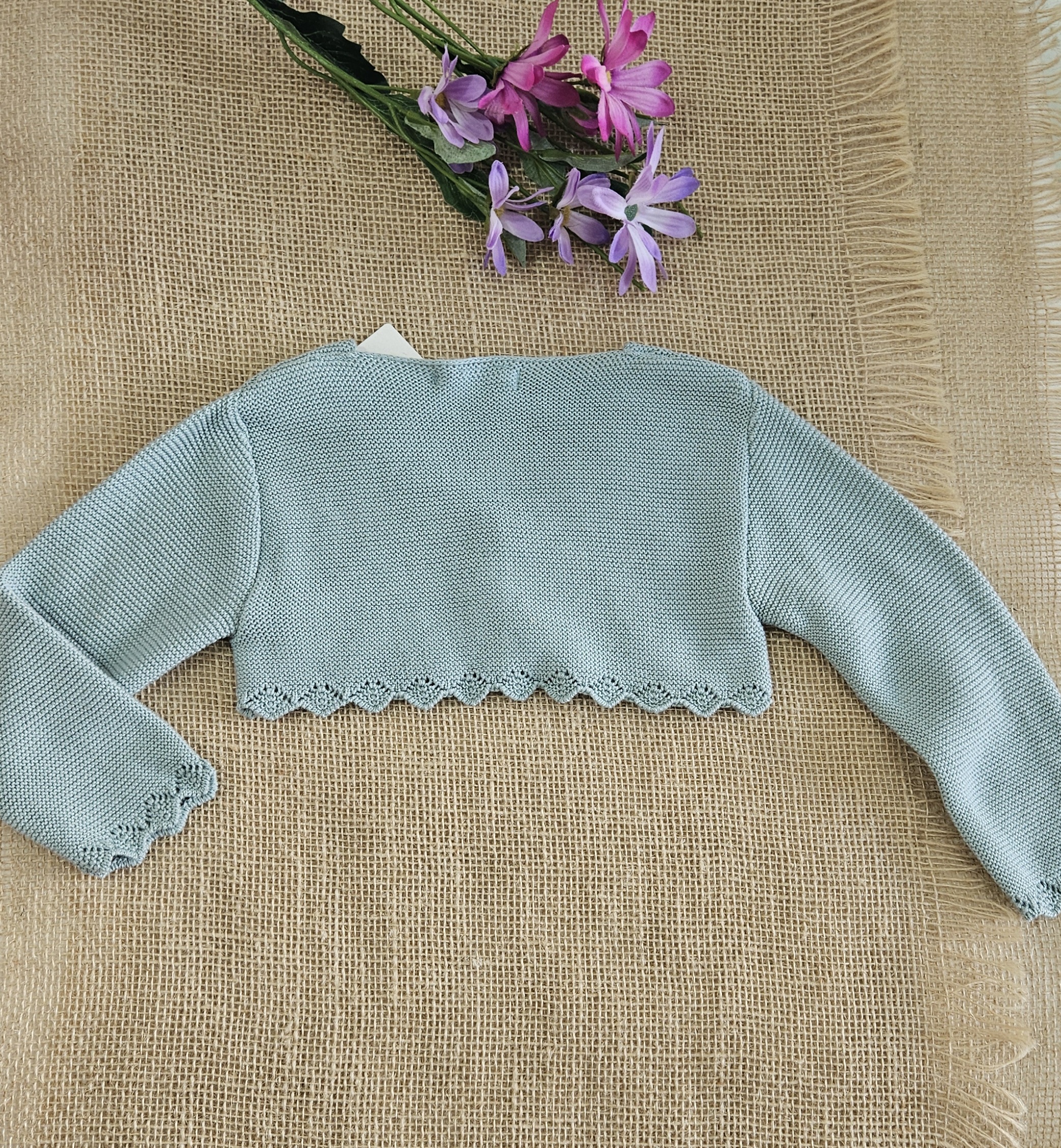 Chaqueta punto para bebé  ,  tipo bolero botón manga larga punto verano color Verde empolvado 50% algodón 50% modal