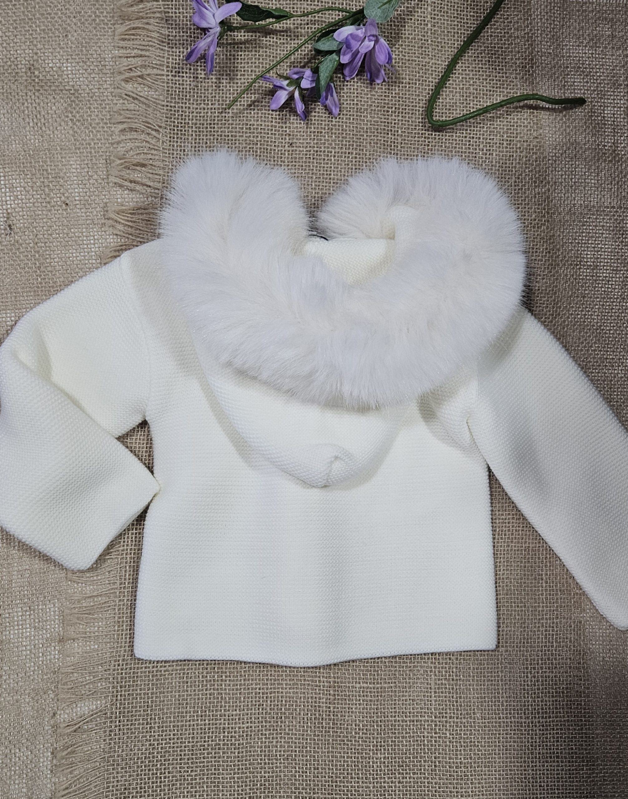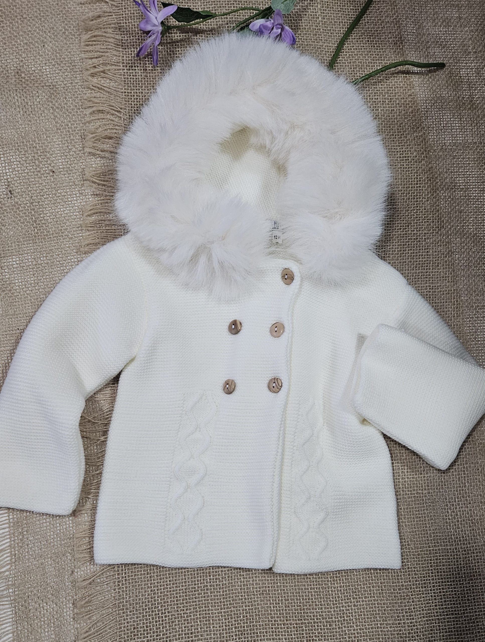 Chaqueta punto unisex abotonada delante con capucha terminación ribete pelo al tono. Ideal para combinar con diferentes colección para ésta temporada de Otoño Invierno.