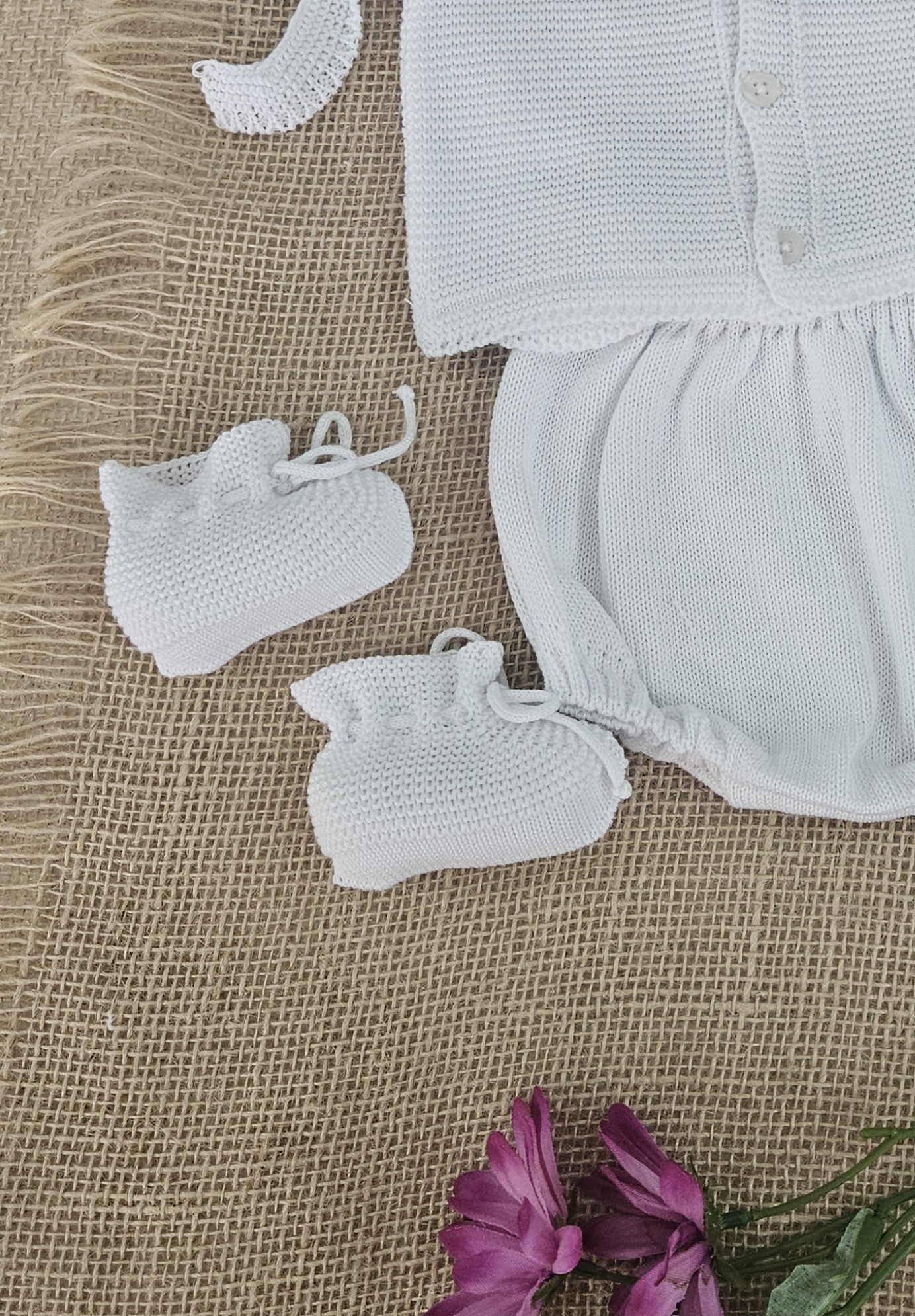 Conjunto para bebé 4 piezas color Blanco jubón tejido punto verano manga corta más cubrepañal, patucos y capota a juego Tacto muy agradable . 50% algodón, 50% acrílico.
