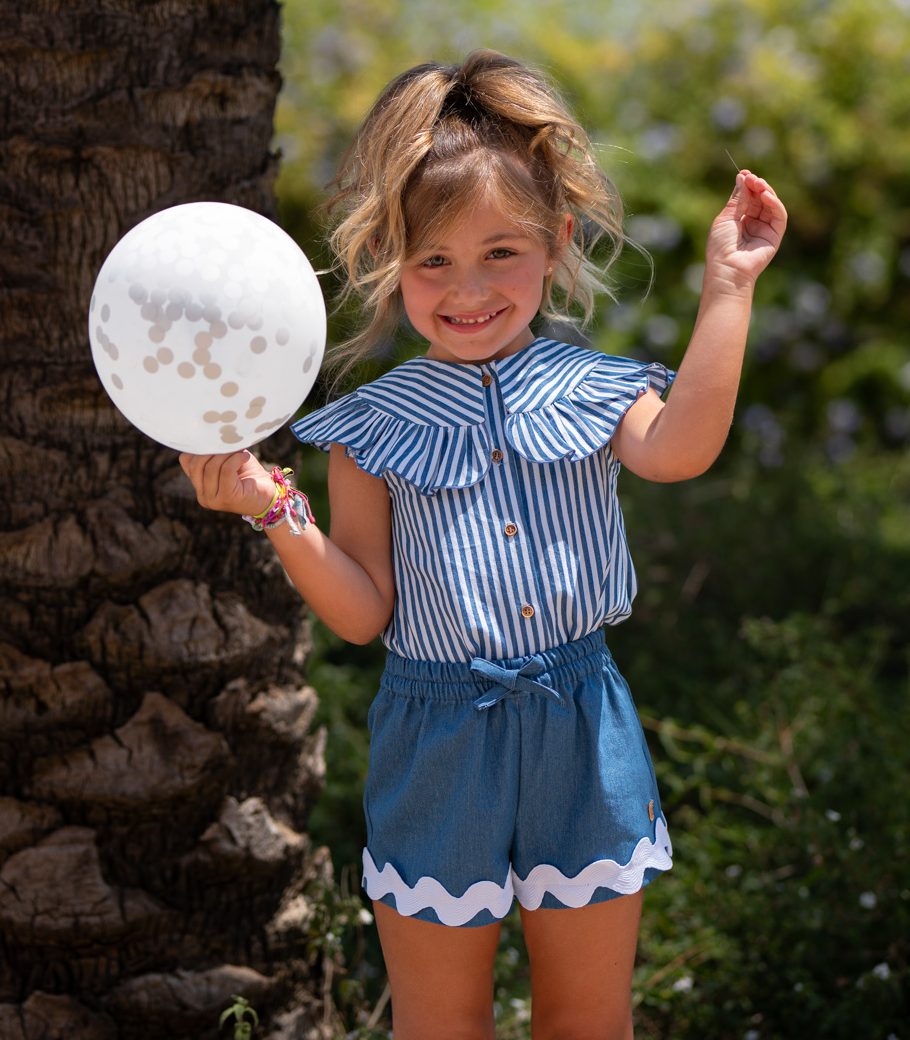 Conjunto para niña, short color azul denim detalle blanco en parte abajo combinado con blusa rayas azulón y blanco José Varón Moda infantil.   ref 58072  Colección coordinada para hermanos. Primavera Verano 2026