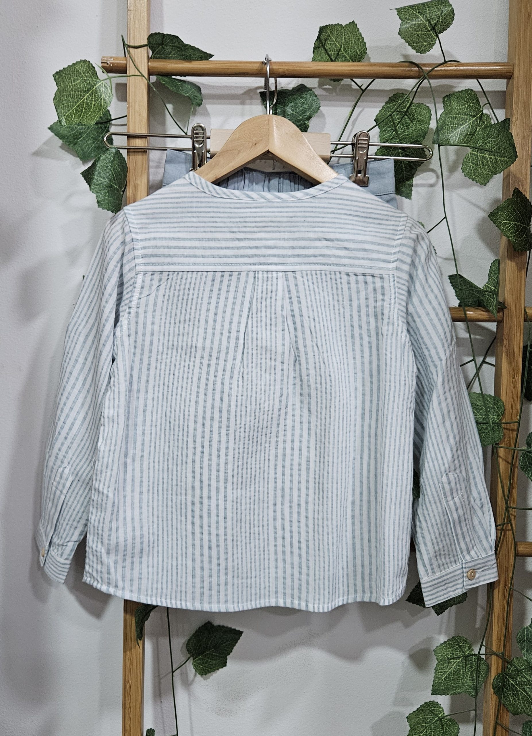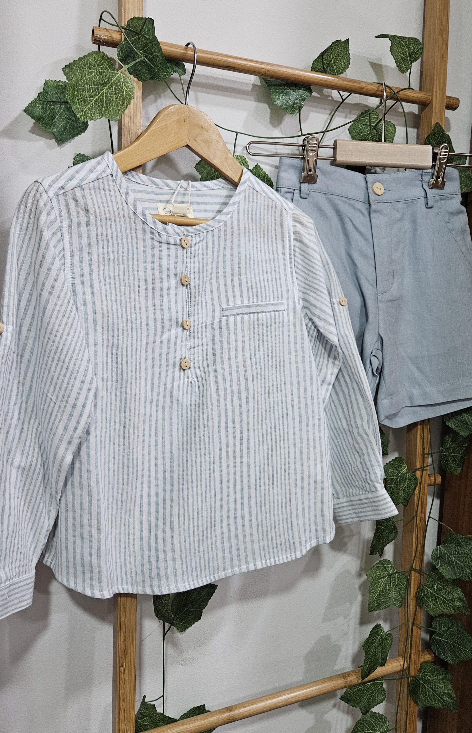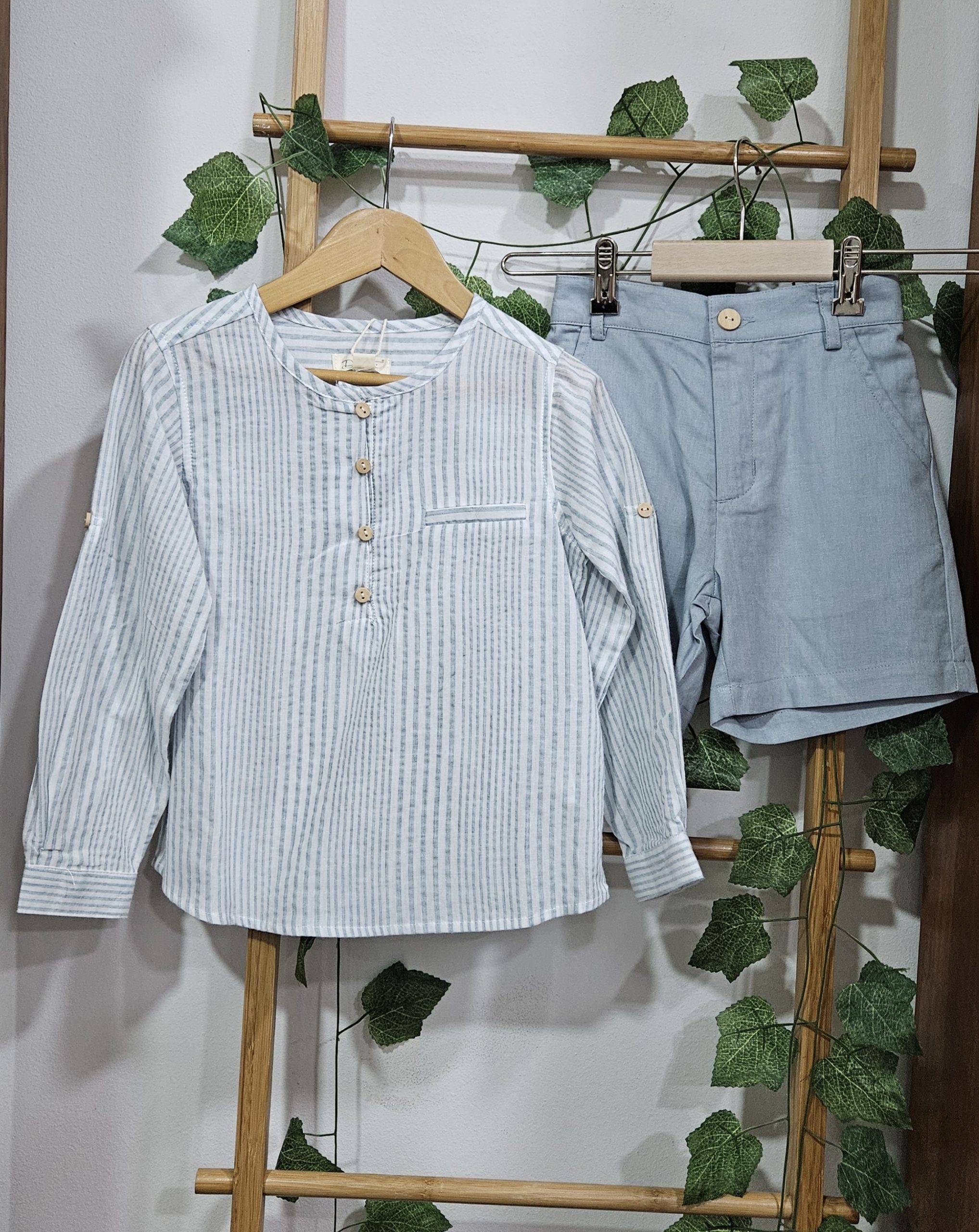 • Conjunto para niño compuesto por dos piezas, pantalón corto color azul empolvado a juego con camisa manga larga con botón para poder poner corta estampada a rayas al tono. Primavera verano Dadati.