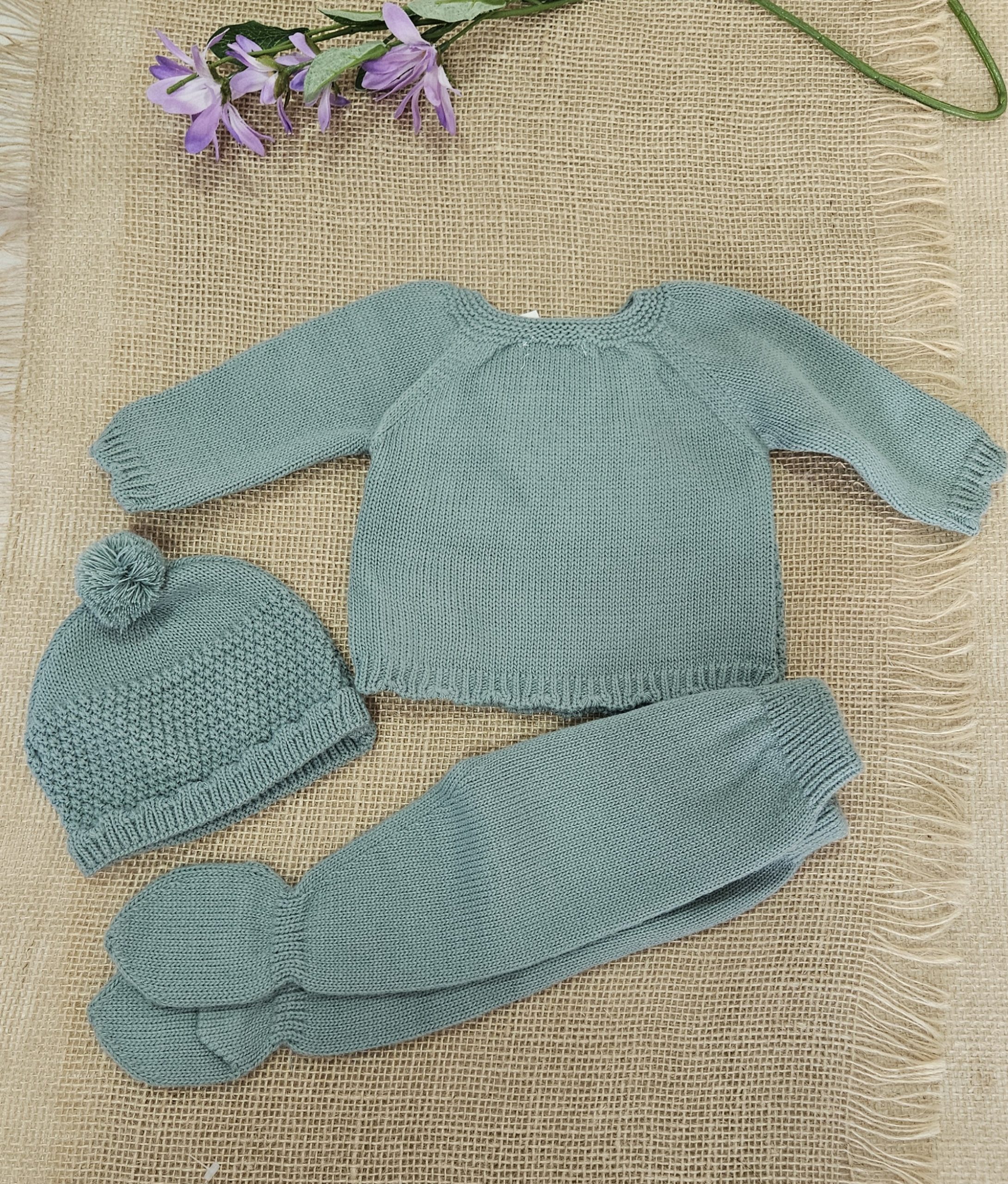 Conjunto polainas punto bebé  combinado punto liso y punto labrado con gorrito incluido a juego. Color Verde
