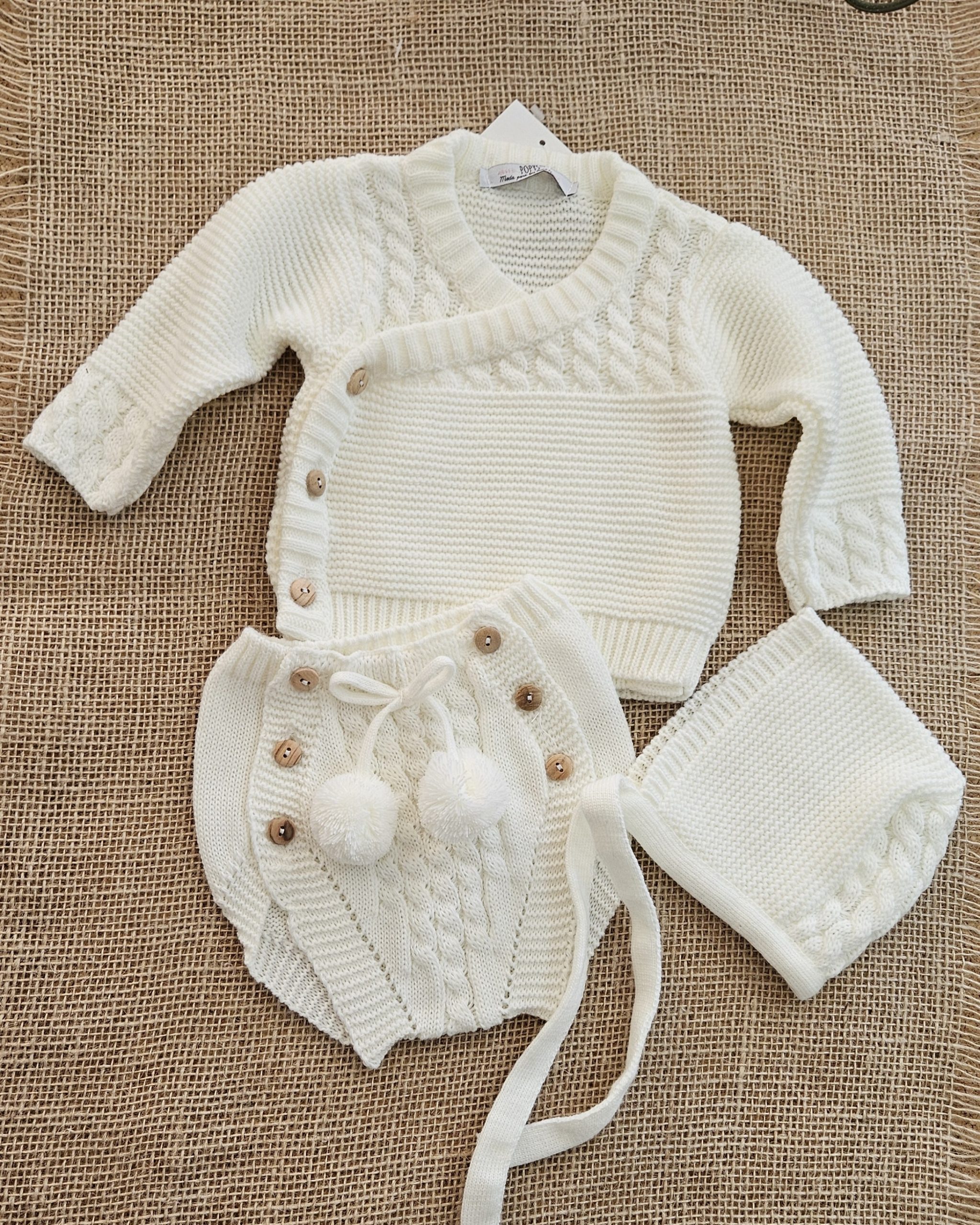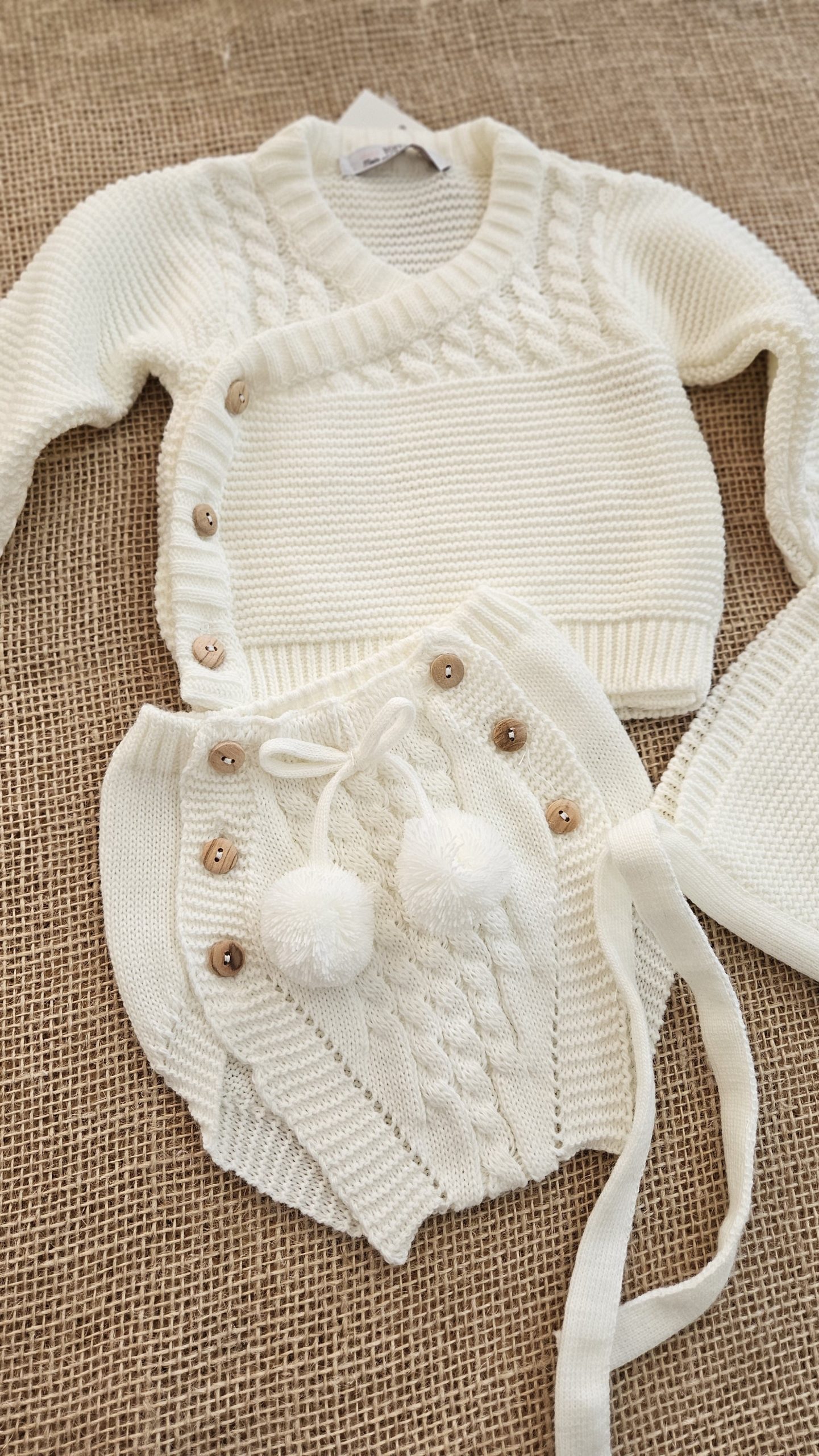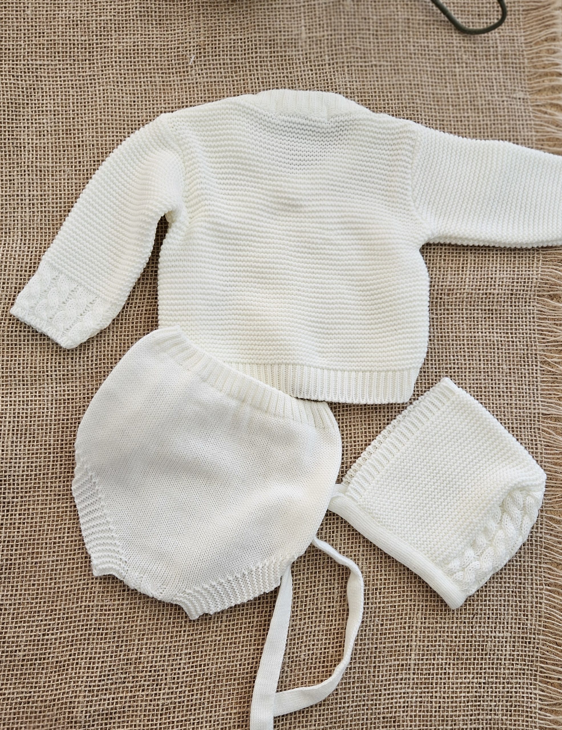 Conjunto punto bebé  tres piezas, cubrepañal , jersey y capota a juego a juego color Crudo.  Ideal para combinar con leotardos Cóndor o calcetin alto.