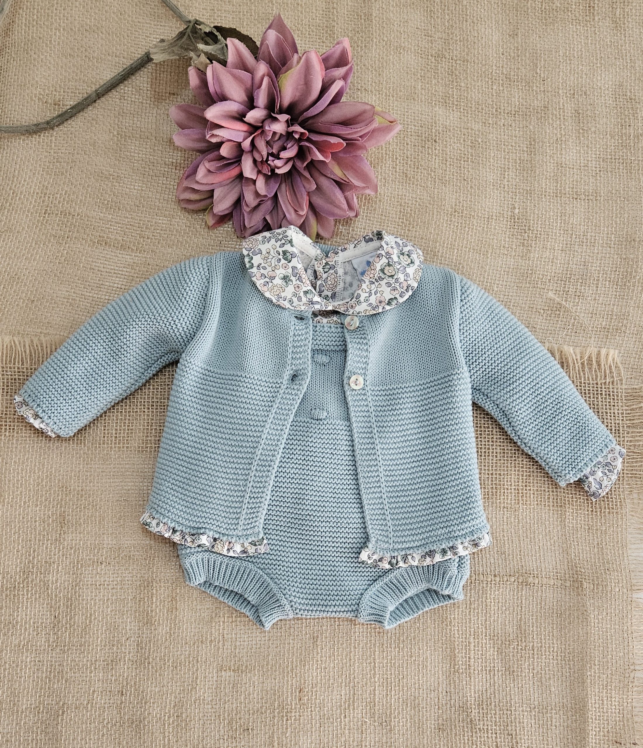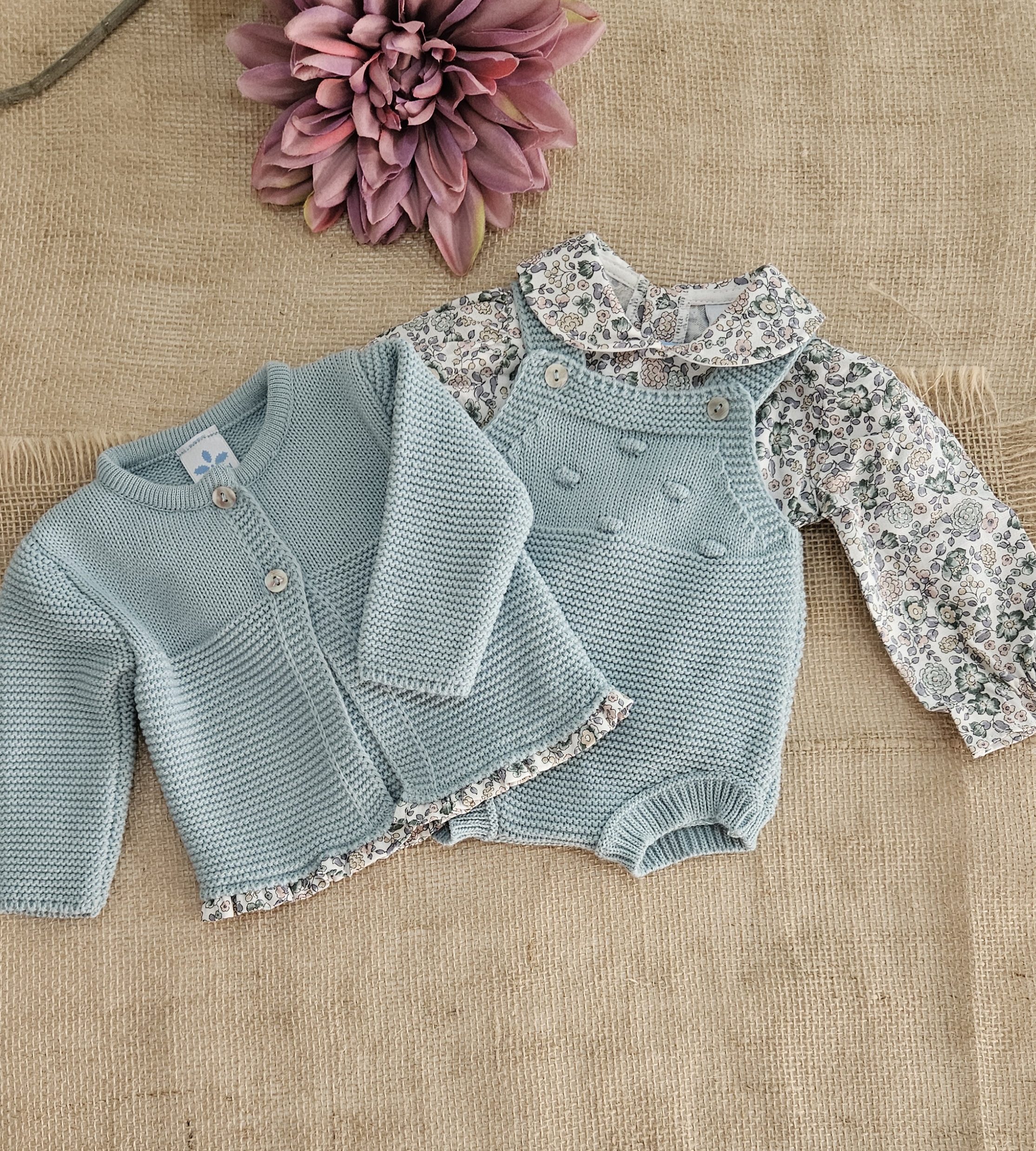 Conjunto punto bebé 3 piezas, pelele punto tirantes con blusa cuello bebé estampada al tono más chaqueta a juego  Color Verde