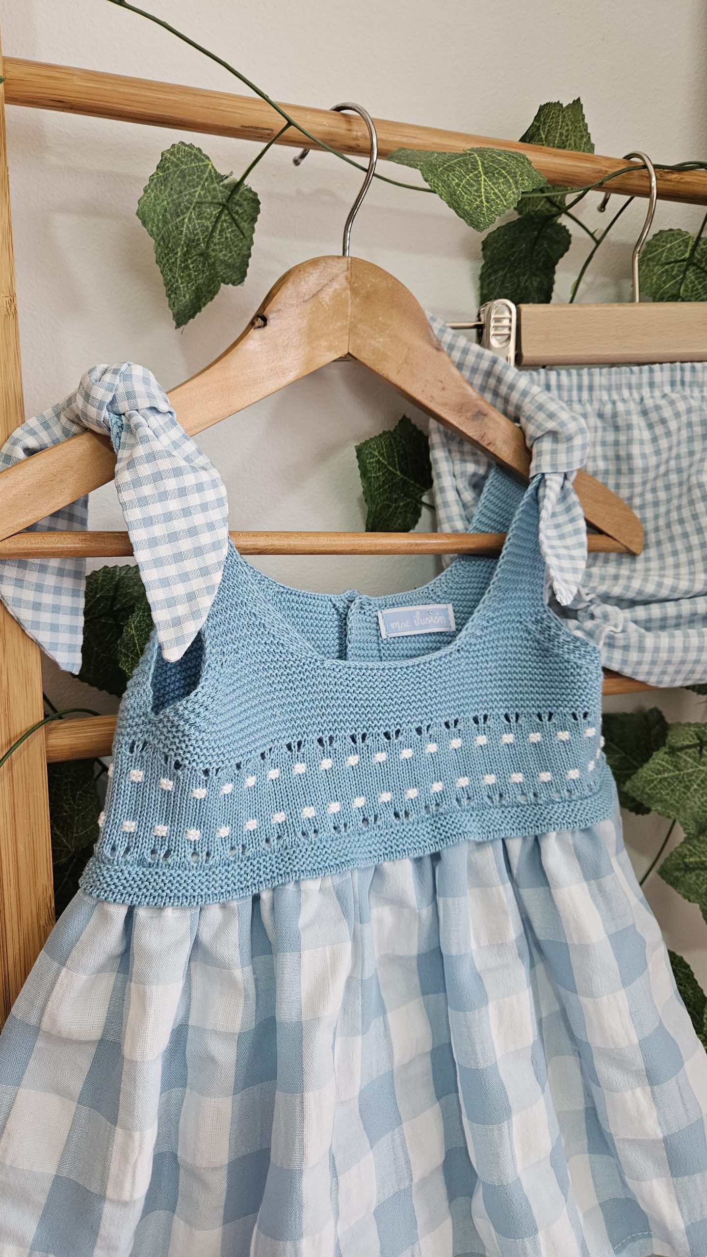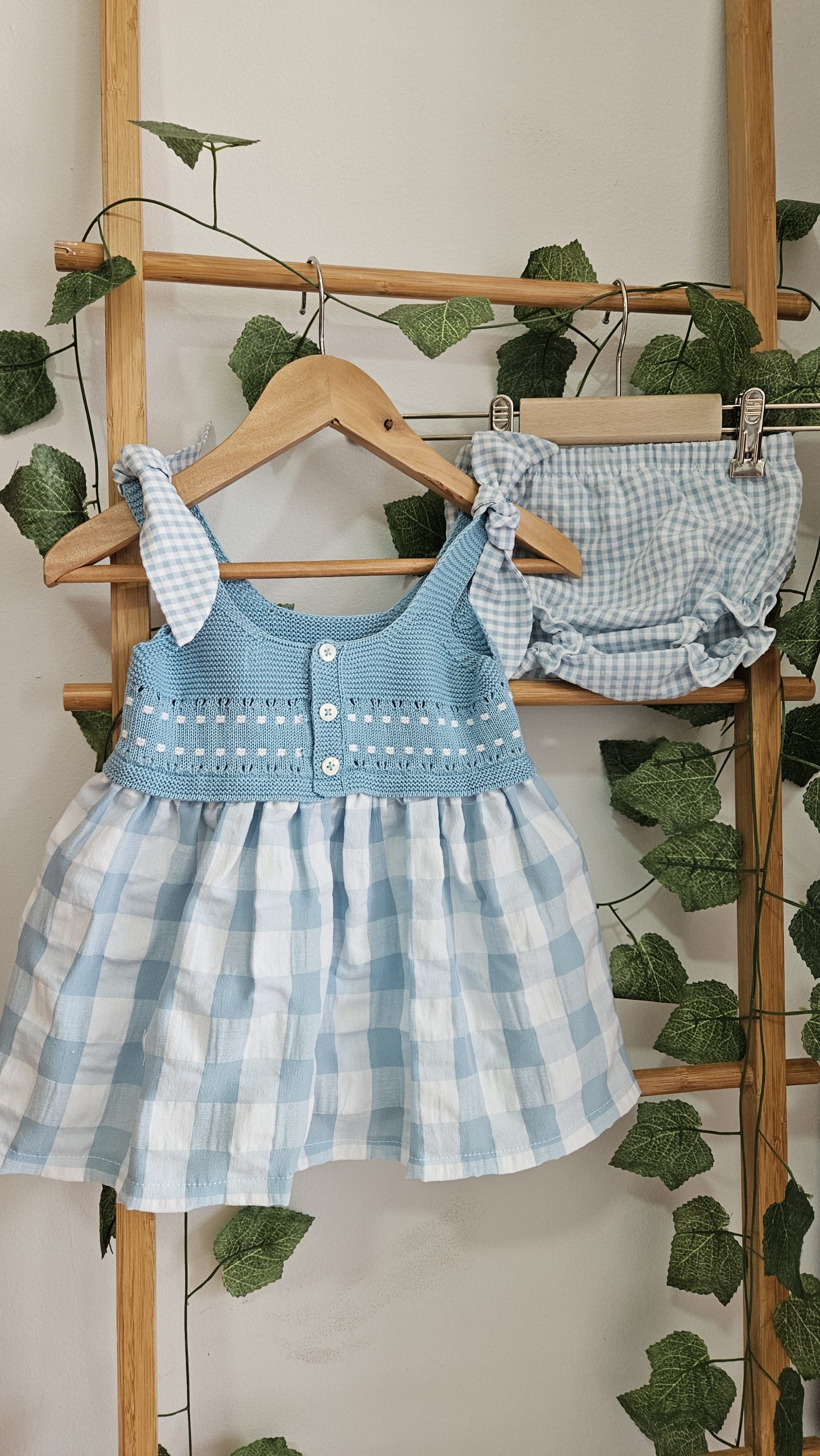 Jesusito para bebé 2 piezas,  estampado vichy grande turquesa y blanco  cuerpo punto al tono, braguita a juego vichy a juego lazos de la parte de los hombros . Tacto muy agradable . 50% algodón, 50% acrílico.