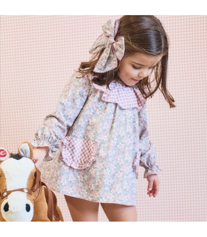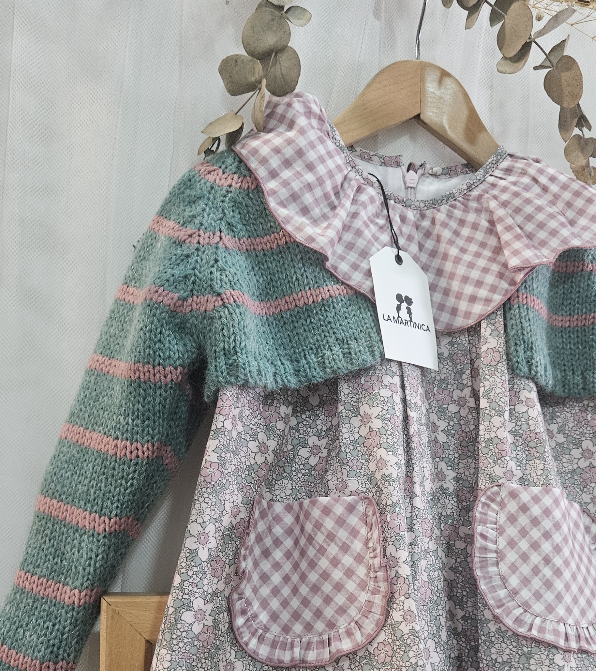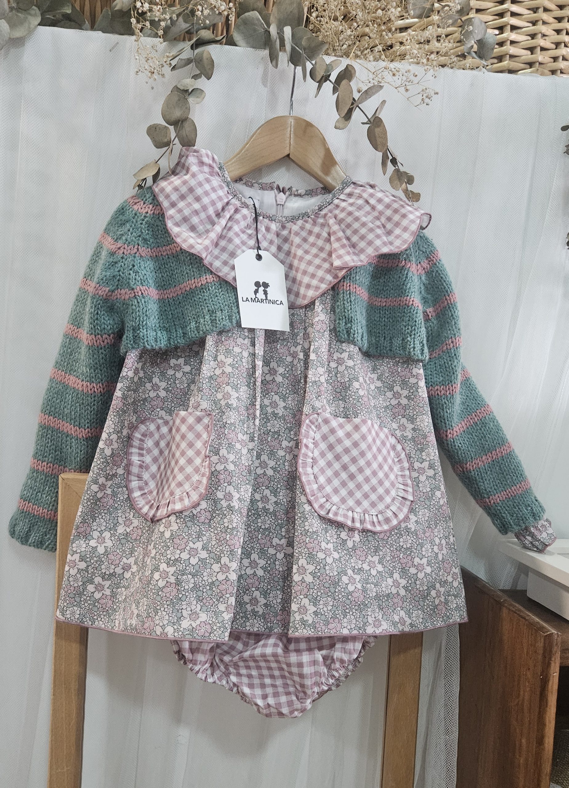 Jesusito para niña,   estampado flores rosa y verde combinado con vichy colección Viena  incluye braguita a juego + chaqueta de punto a juego.