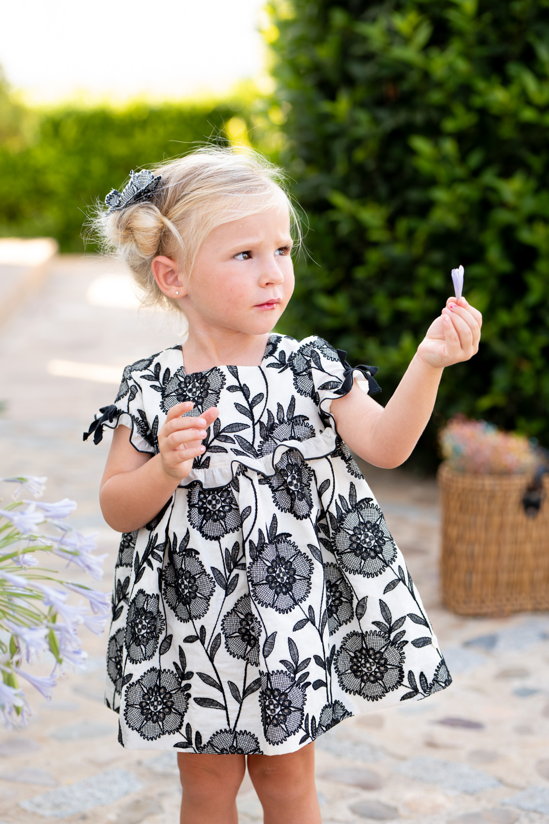 Jesusito para niña tejido bordado flores blanco y negro manga farol con lacito incluye braguita a juego colección , José Varón Moda infantil.   ref 58022  Colección coordinada para hermanos. Primavera Verano 2026
