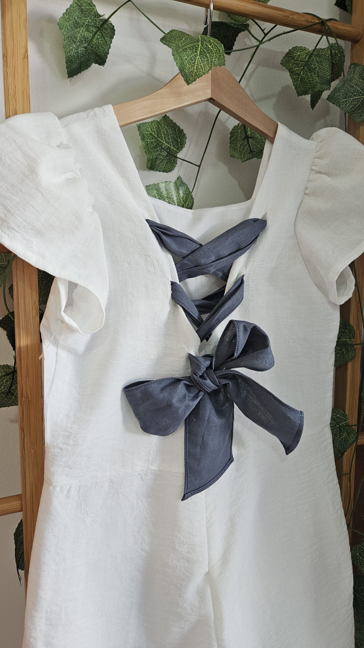 Mono para niña  color blanco roto espalda descubierta cerrada con lacitos y volantes en lino color gris carbón, ideal para bodas y eventos. Si necesitas otro color del volante puedes consultarnos a través de nuestro WhatsApp y te asesoramos en otros colores disponibles.
