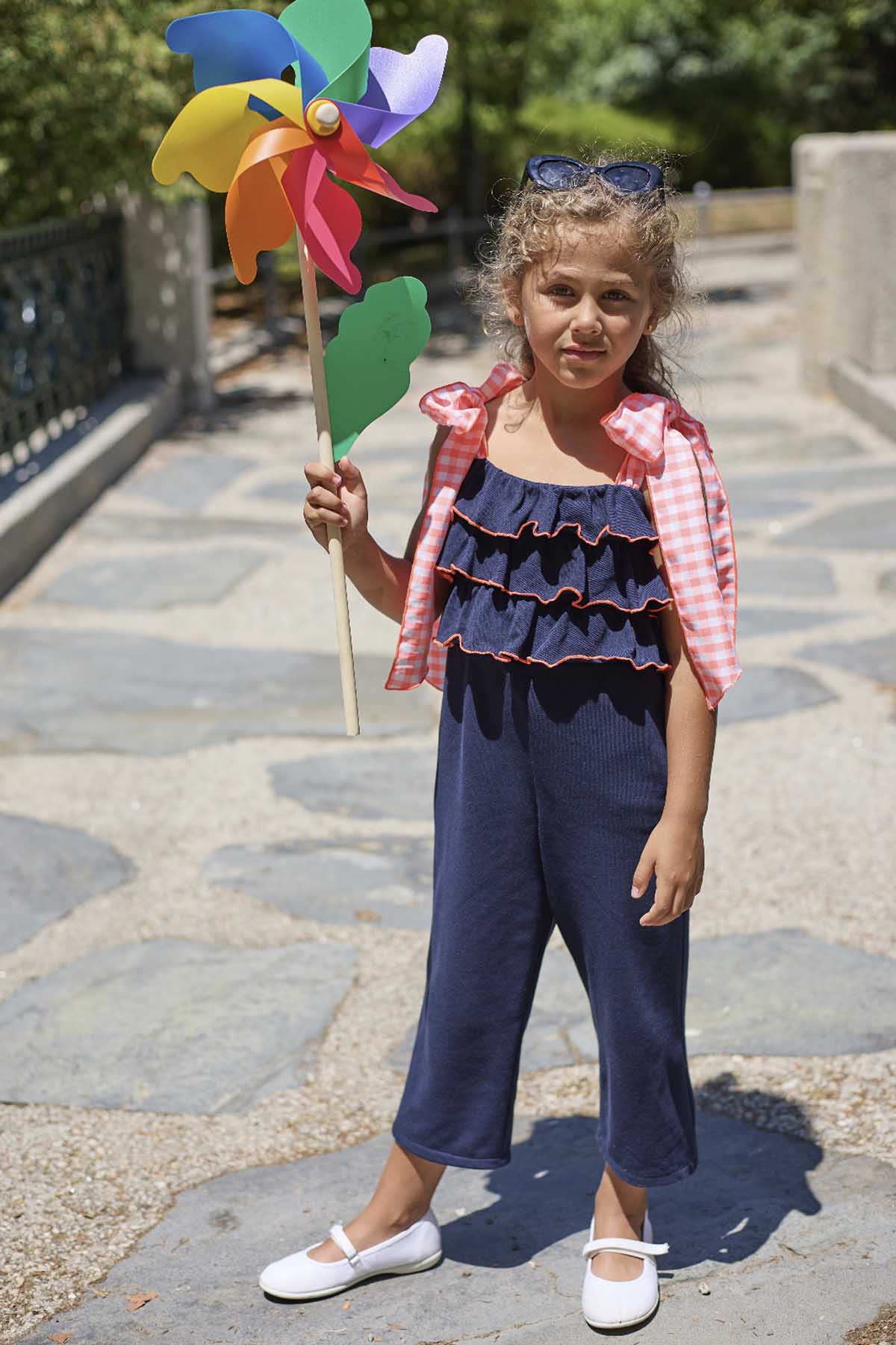 Mono para niña  confeccionado en algodón piqué azul marino con tirantes confeccionados en vichy coral y blanco para anudar en los hombros.   100% algodón