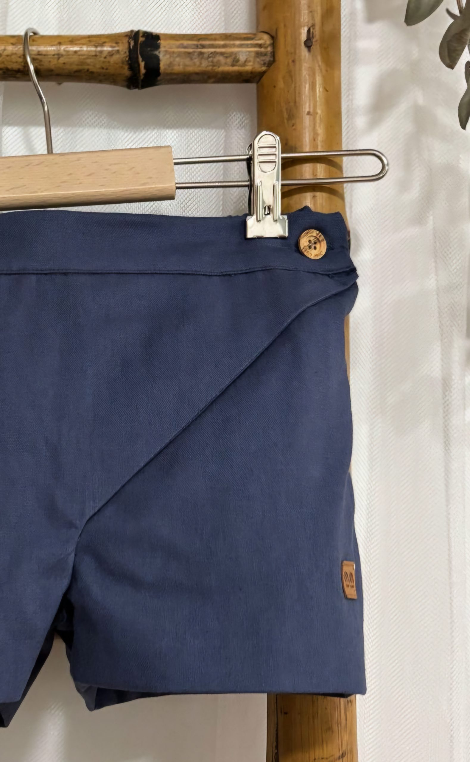 Pantalón corto para niño composición 60% lino 40% algodón con botones madera en los laterales, un básico ideal para combinar con diferentes modelos de camisas o polos para primavera/verano José Varón Moda infantil. Color Azul Tinta