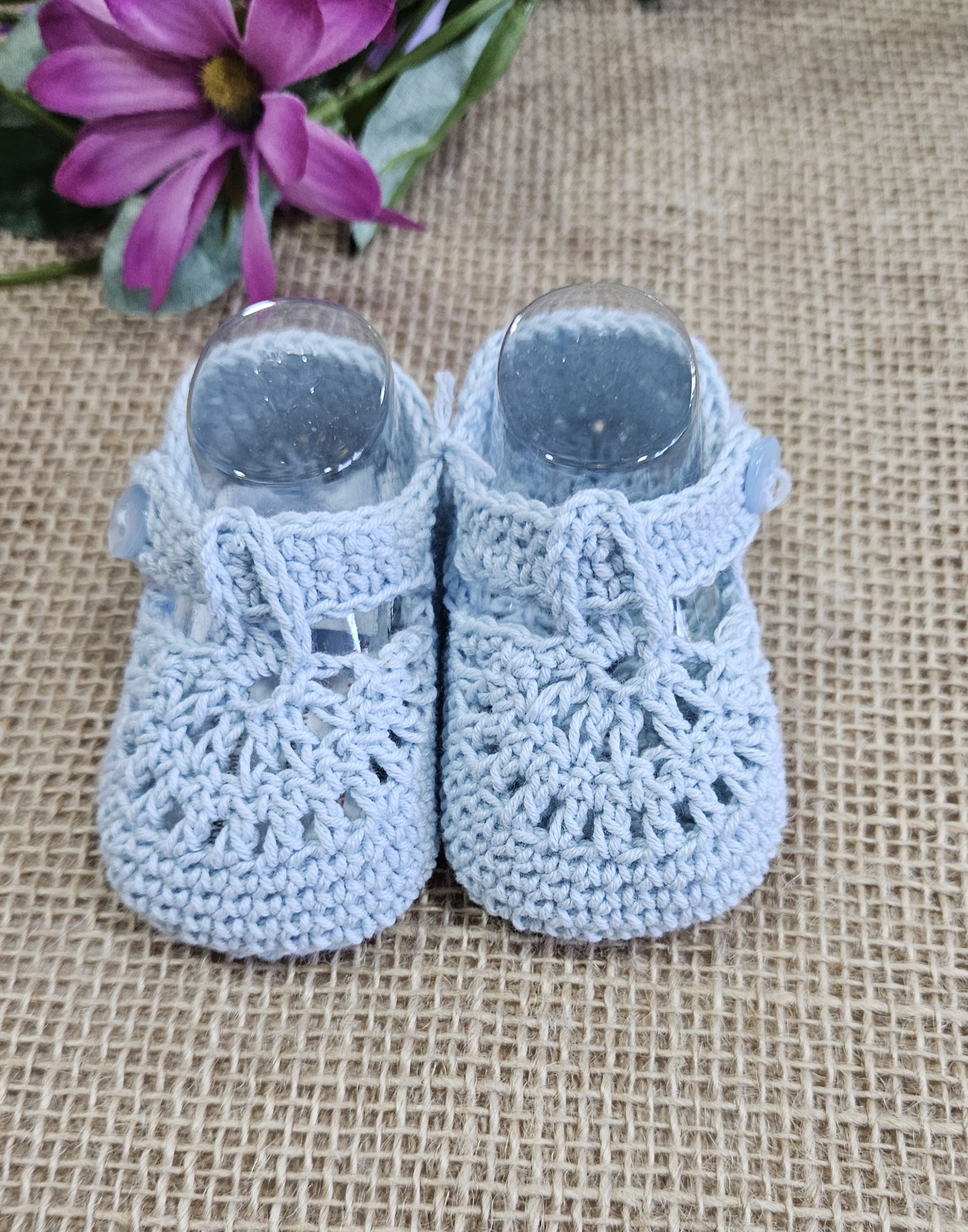 Patucos para bebés punto 100% algodón tipo Pepito color Celeste ,   punto Crochet, temporada Primavera- Verano Sardón.