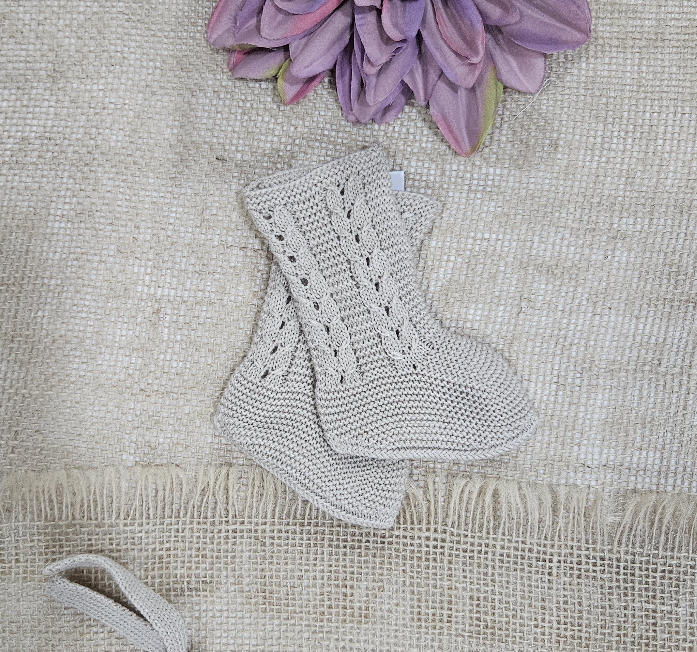Patucos de punto  bebé unisex – color  Beig . . Tipo botita, Composición 100% acriclico (Dralón), ideal para combinar con pelele a juego.  Hilatura de excelente calidad y tacto muy suave y confortable.  Marca Sigar.