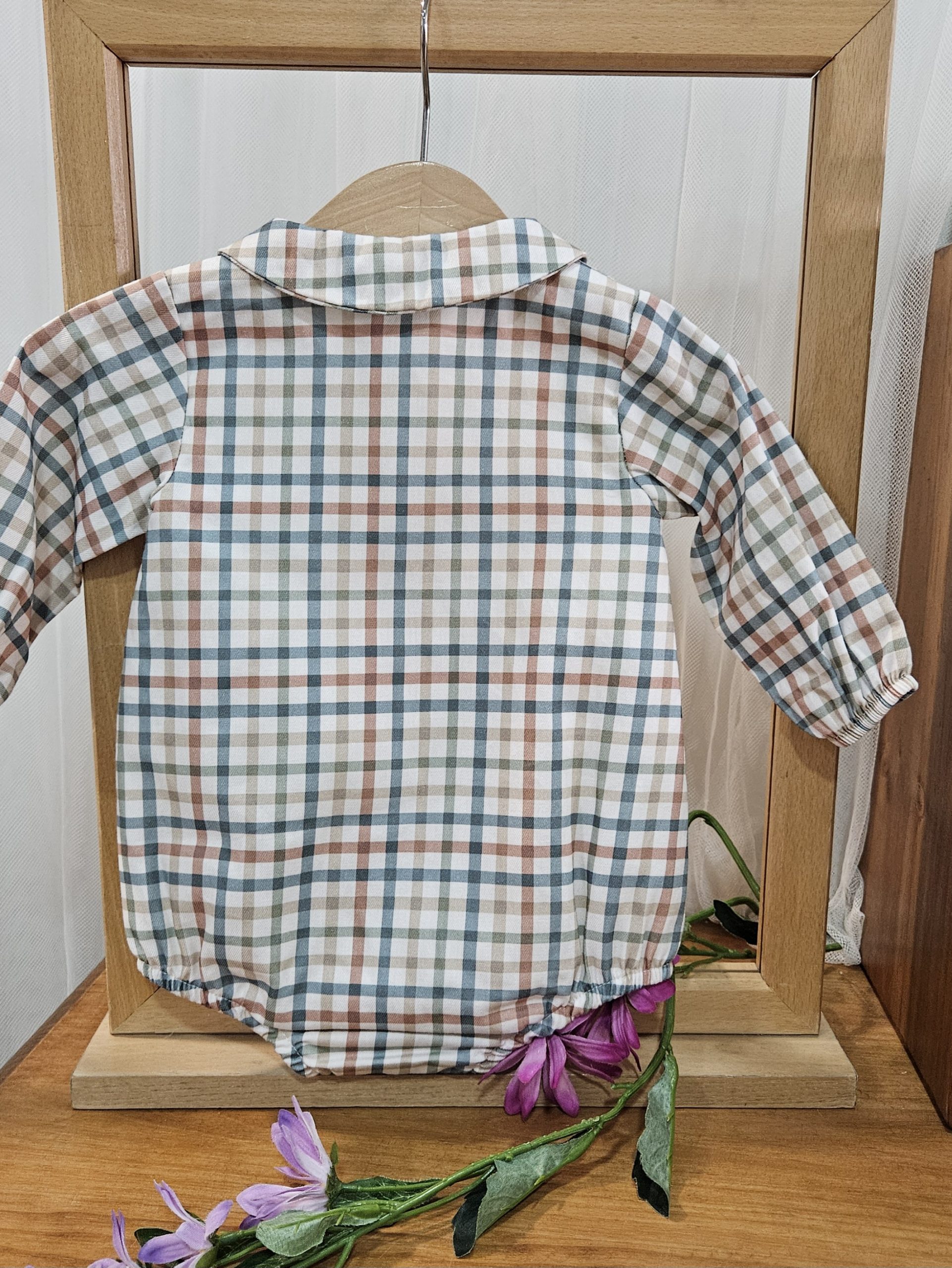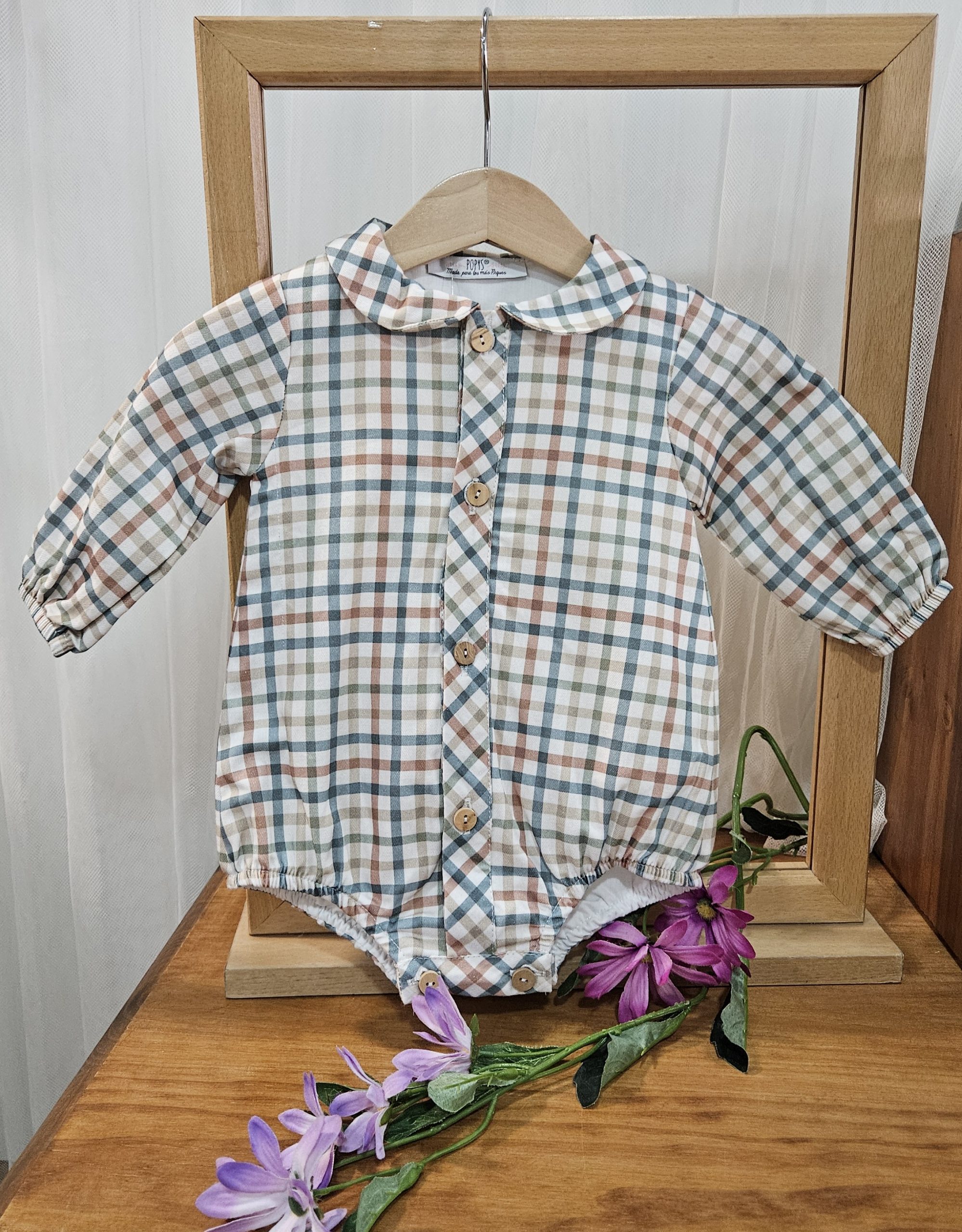 Pelele unisex bebé ,  estampado cuadros tonos verdes, camel.  Cuello bebé abertura con botones en parte delantera.