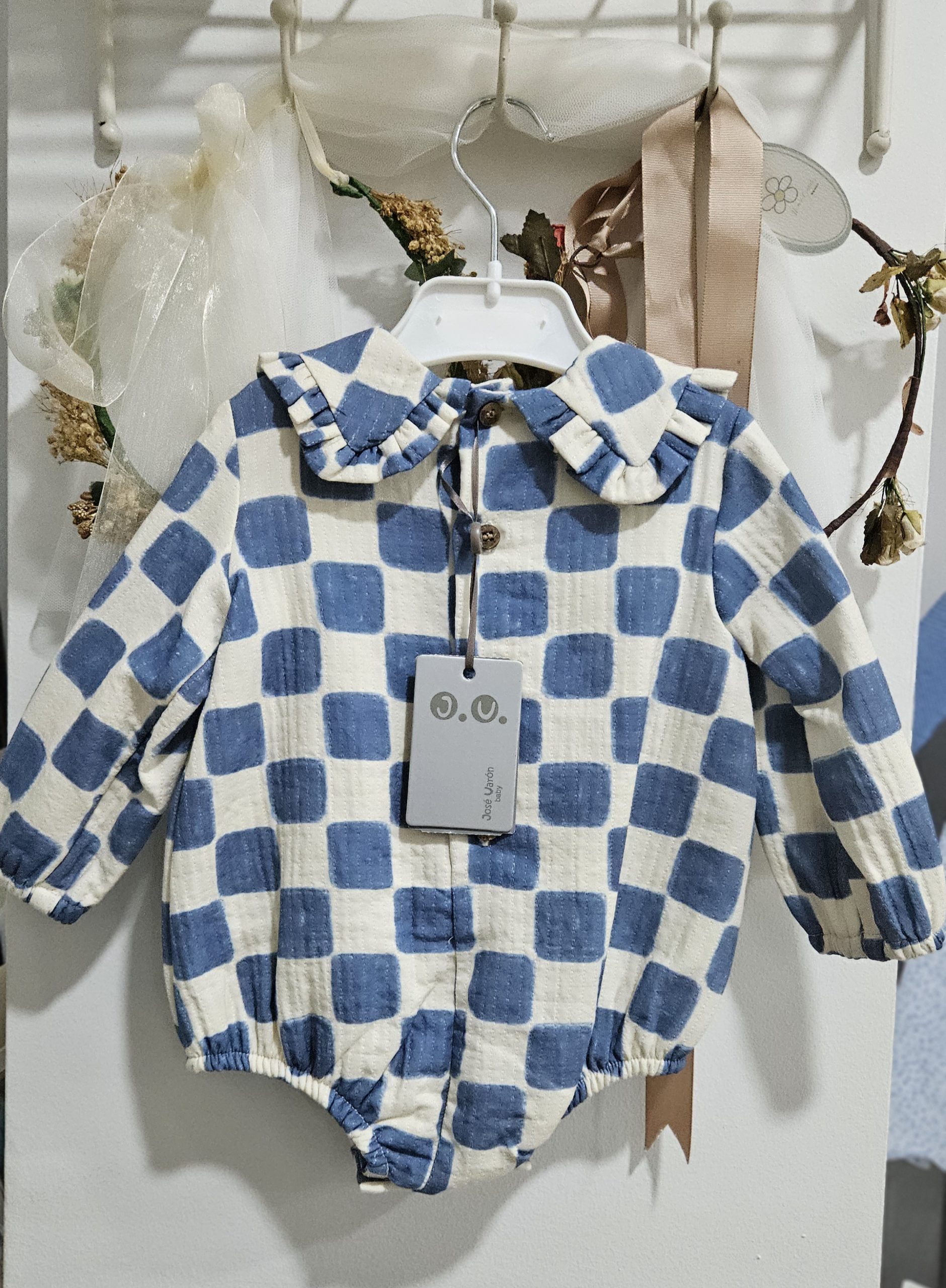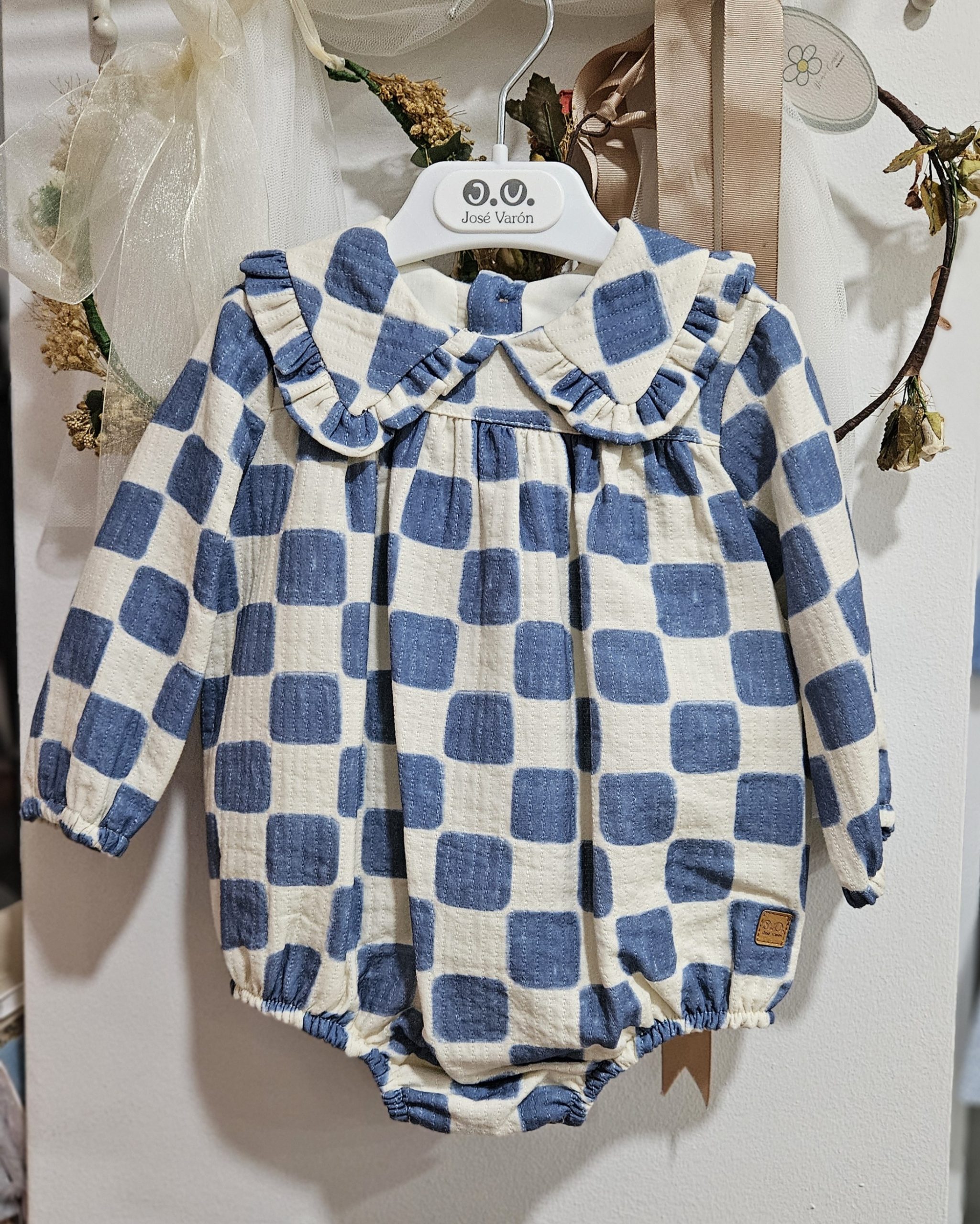 Pelele para bebé estampado damero color porcelana (azulón), ideal para reportajes navideños… José Varón Moda infantil.   ref 56063  Colección coordinada para hermanos.