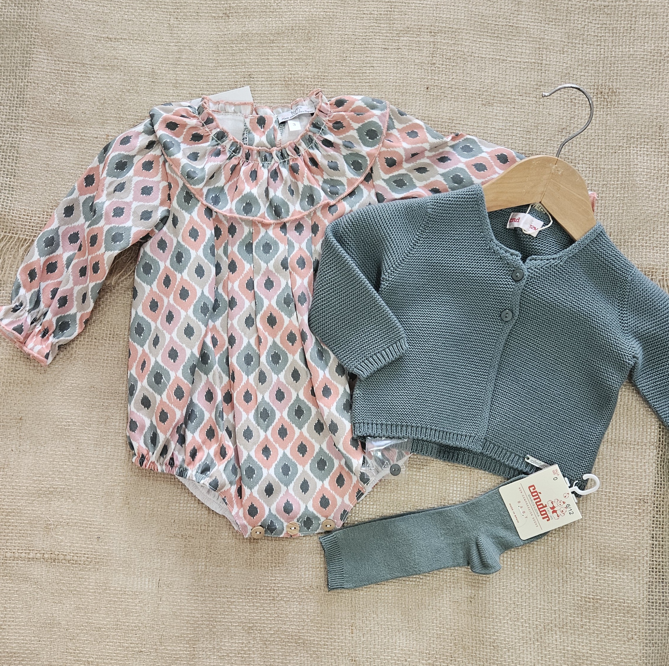 Pelele unisex bebé ,  estampado dibujos étnicos color verde y coral-  cuello volante (Calcetin de la foto no incluido, opcional número 761 Cóndor)
