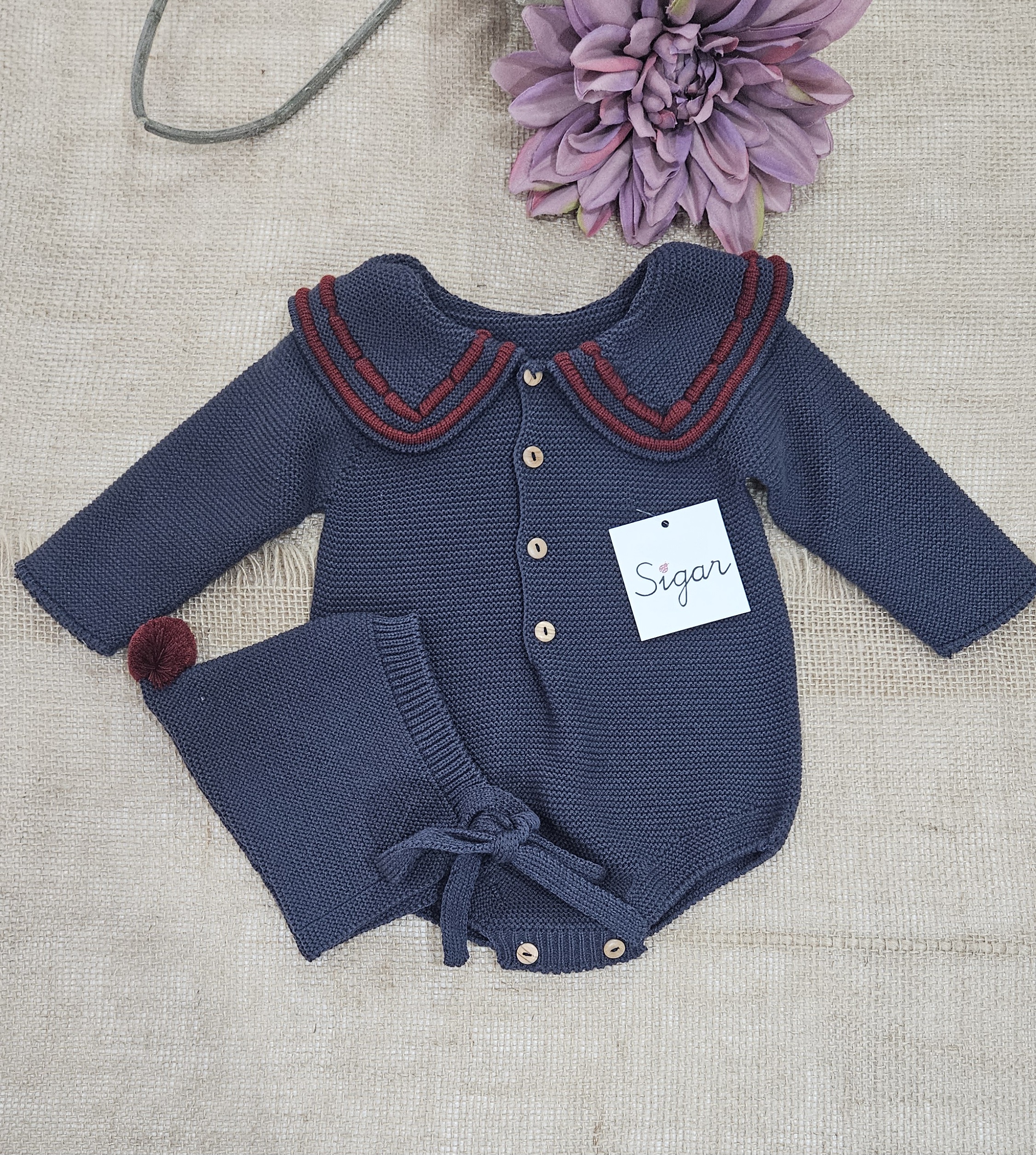 Pelele punto más capota bebé – color Carbón . Composición 100% acriclico (Dralón), punto bobo con botones en la parte delantera y cuello bebé grande ribete color burdeos. Hilatura de excelente calidad y tacto muy suave y confortable. Marca Sigar.