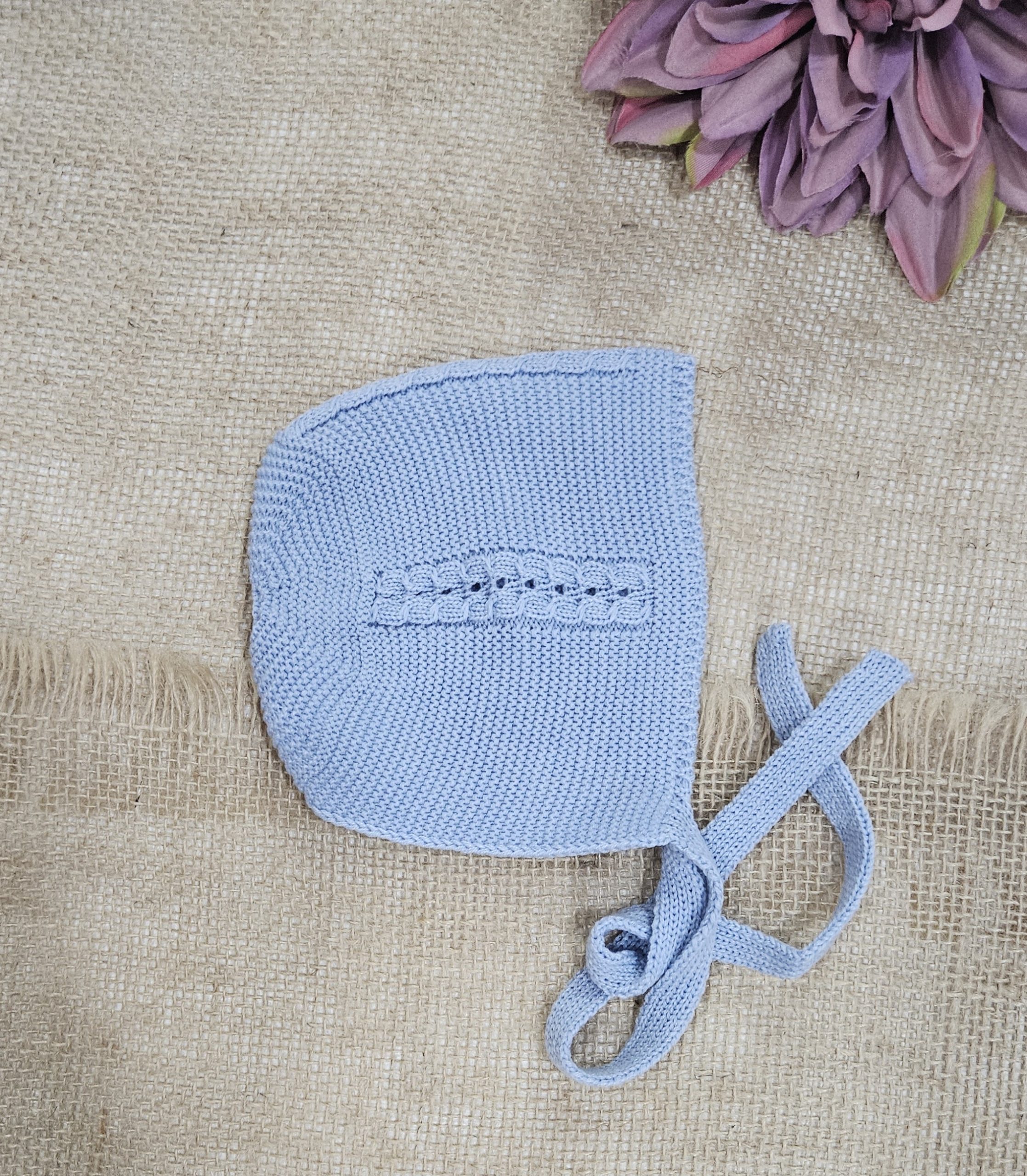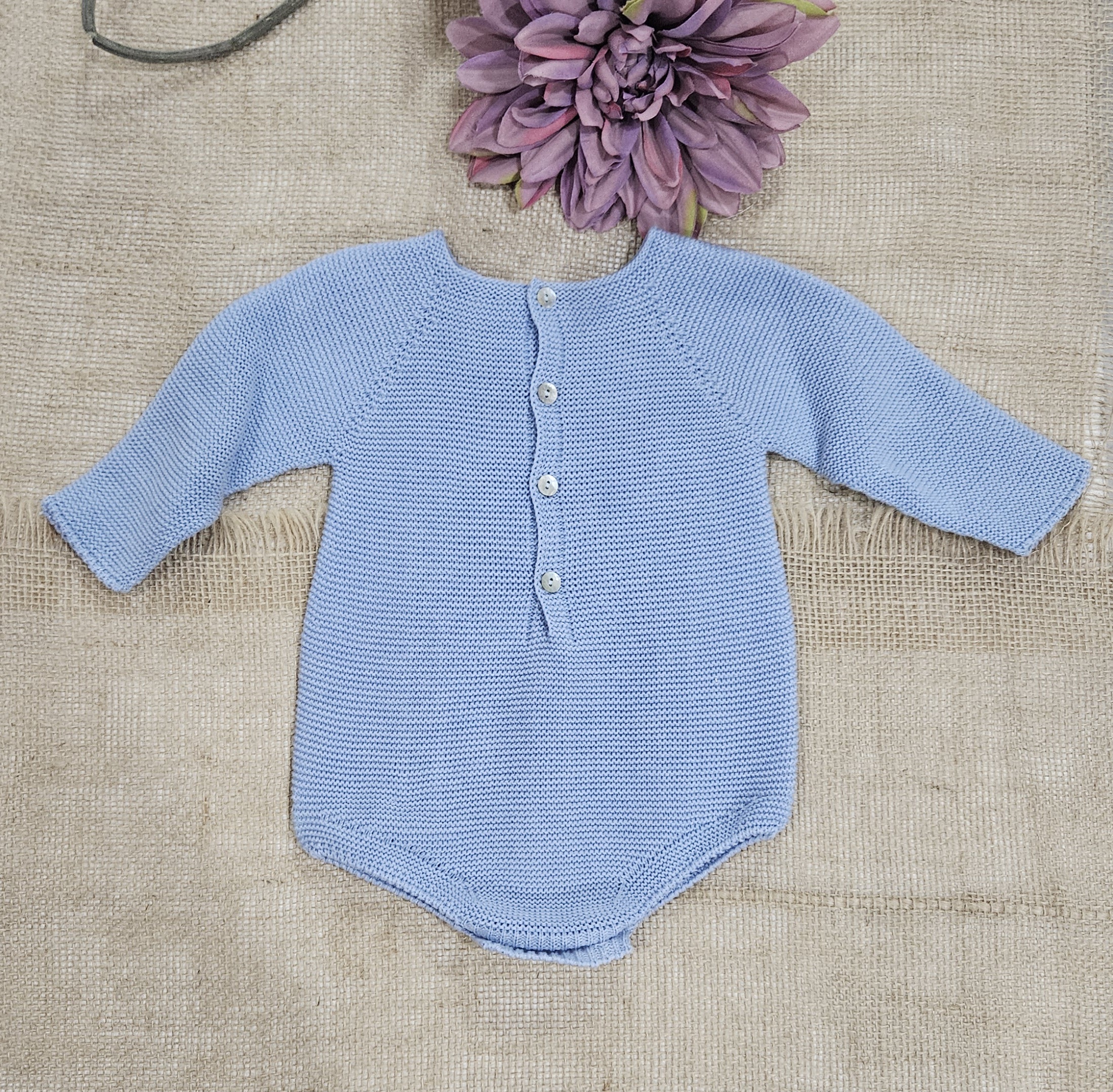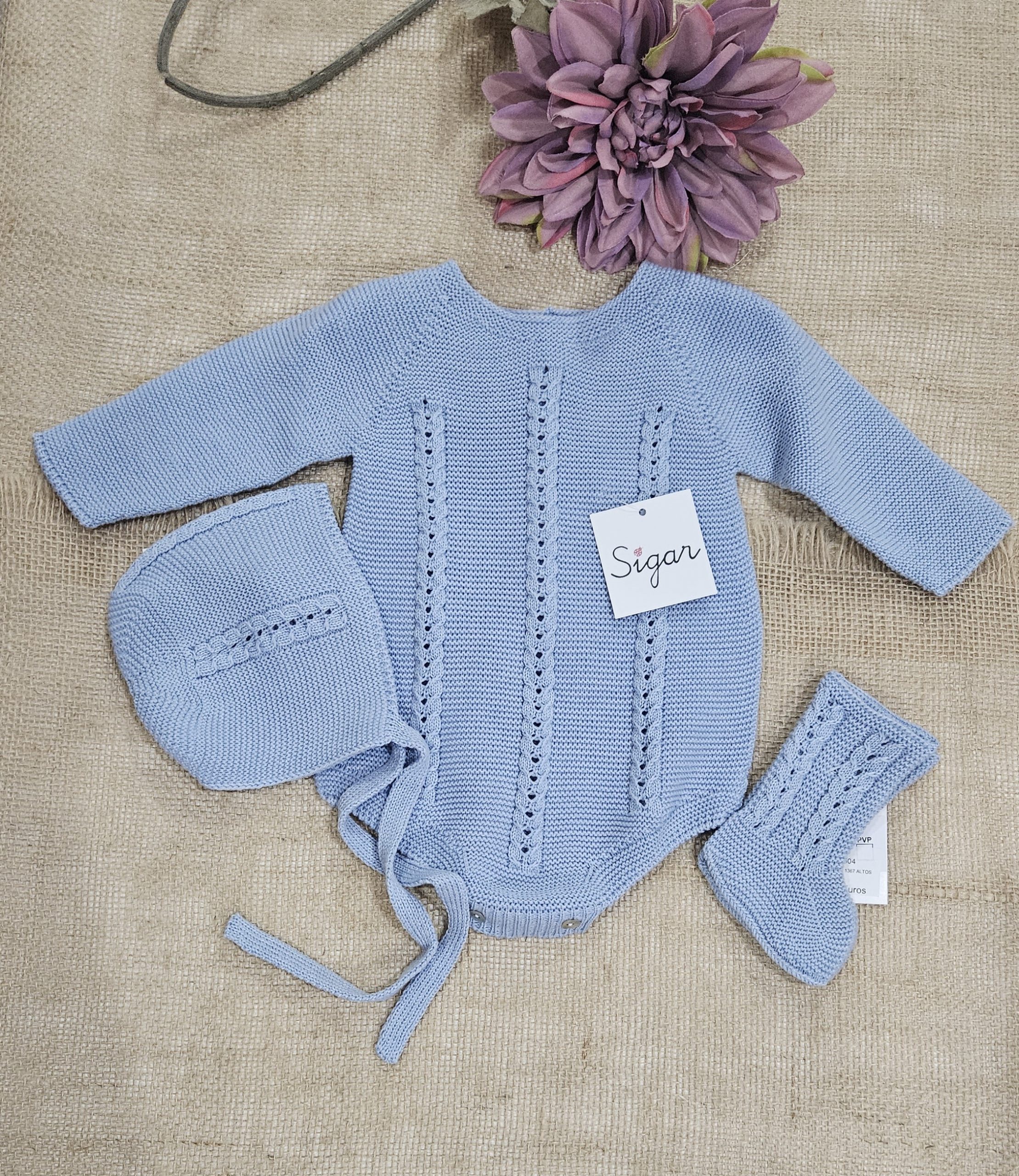 Pelele punto más capota bebé – color Cielo . Composición 100% acriclico (Dralón), punto bobo combinado con ochos con botones en la parte trasera. Hilatura de excelente calidad y tacto muy suave y confortable. Marca Sigar.