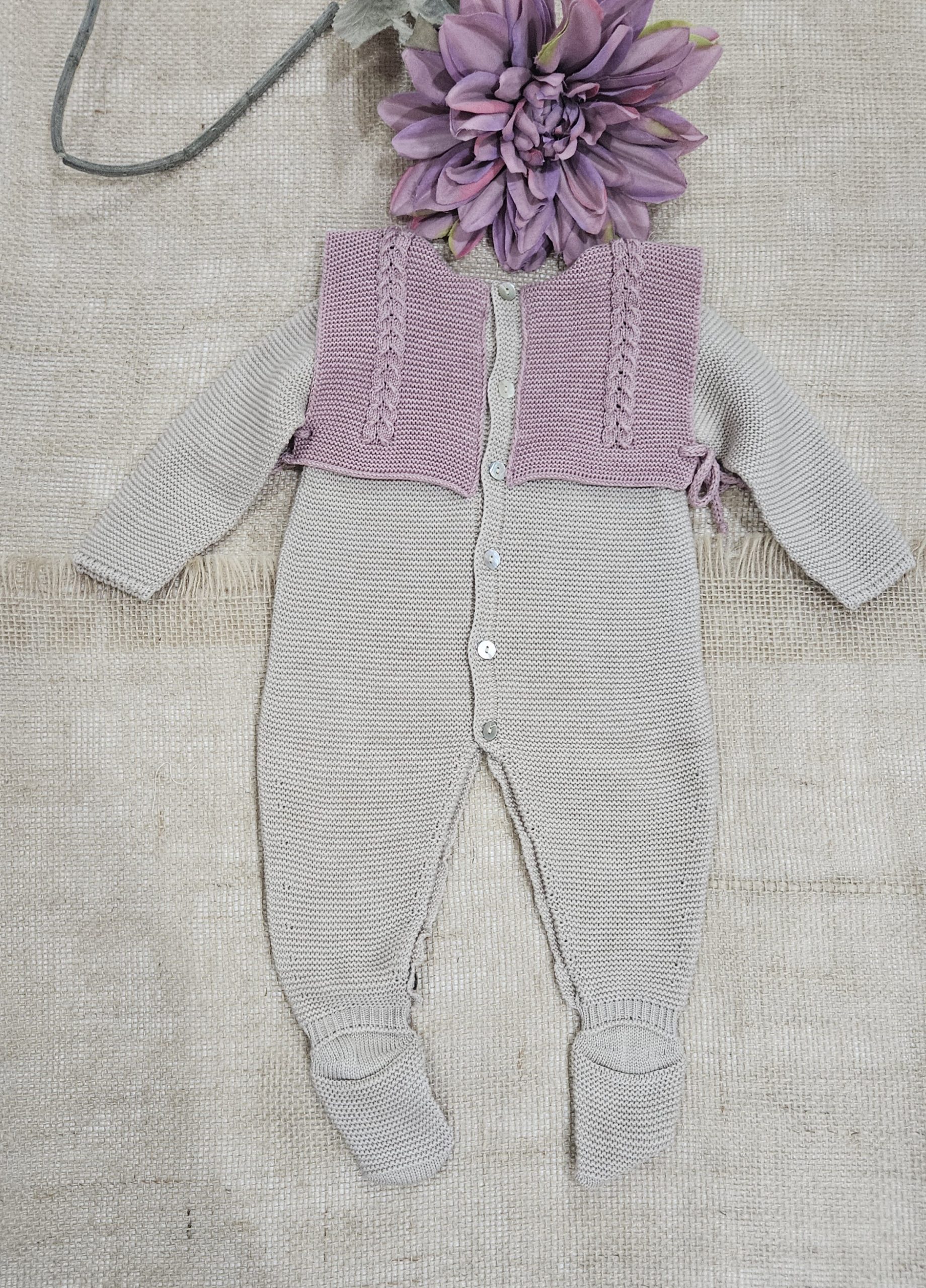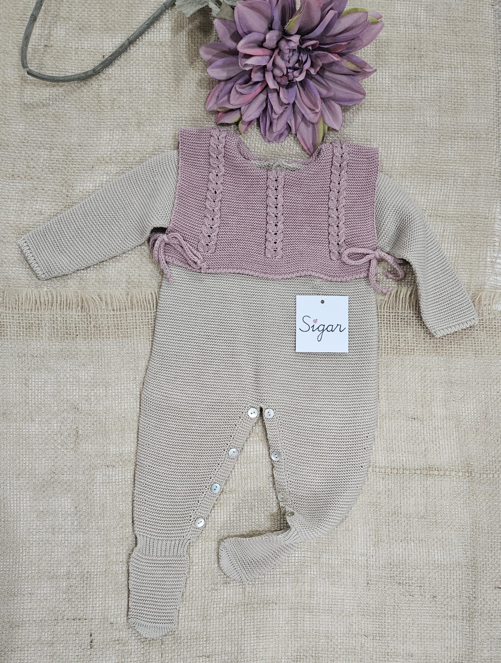 Pelele punto  bebé enterizo con pies – color Beig / Rosa pecherin tipo babero de punto   . Composición 100% acriclico (Dralón), punto bobo con botones en la parte trasera. Hilatura de excelente calidad y tacto muy suave y confortable.  Marca Sigar.