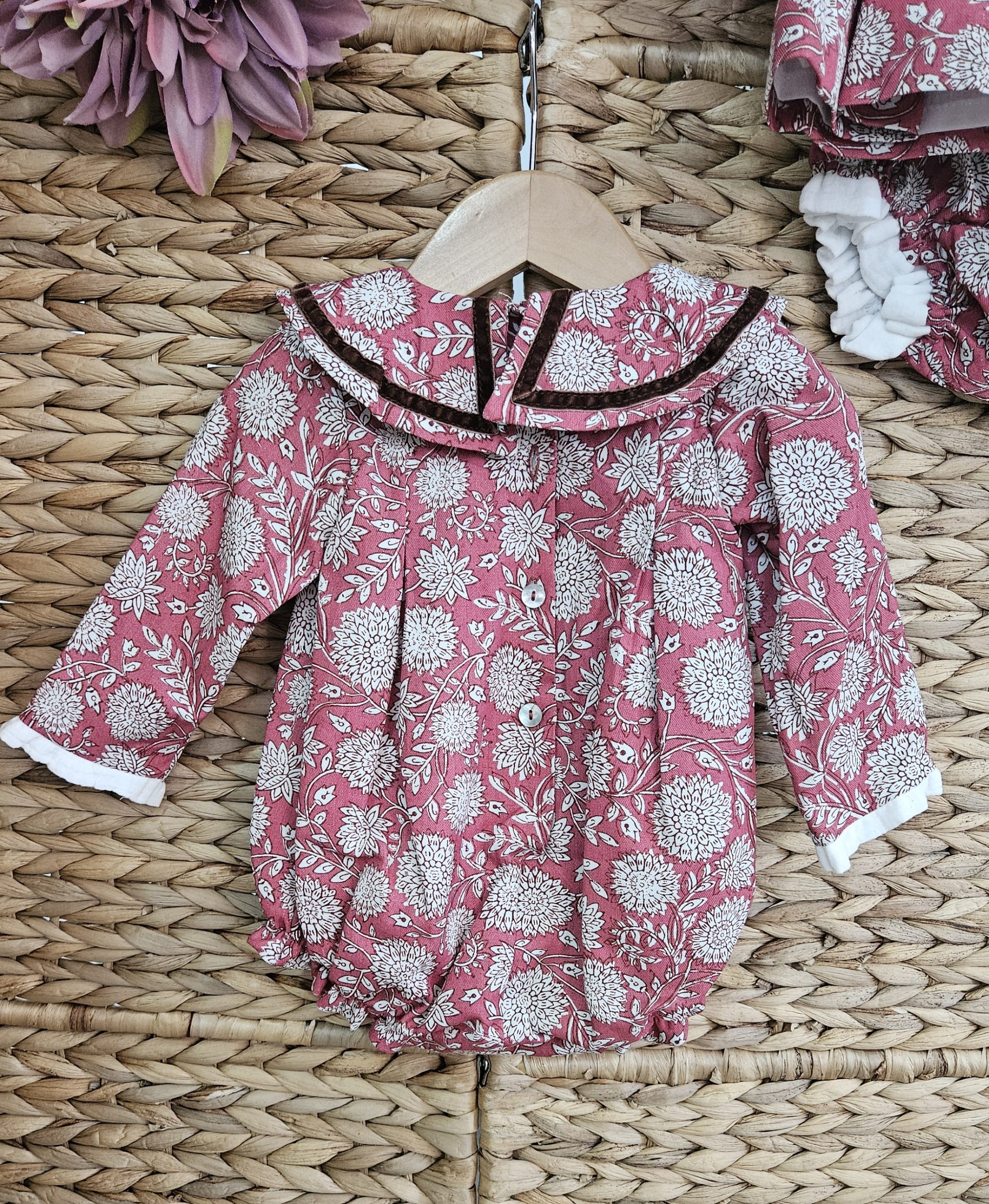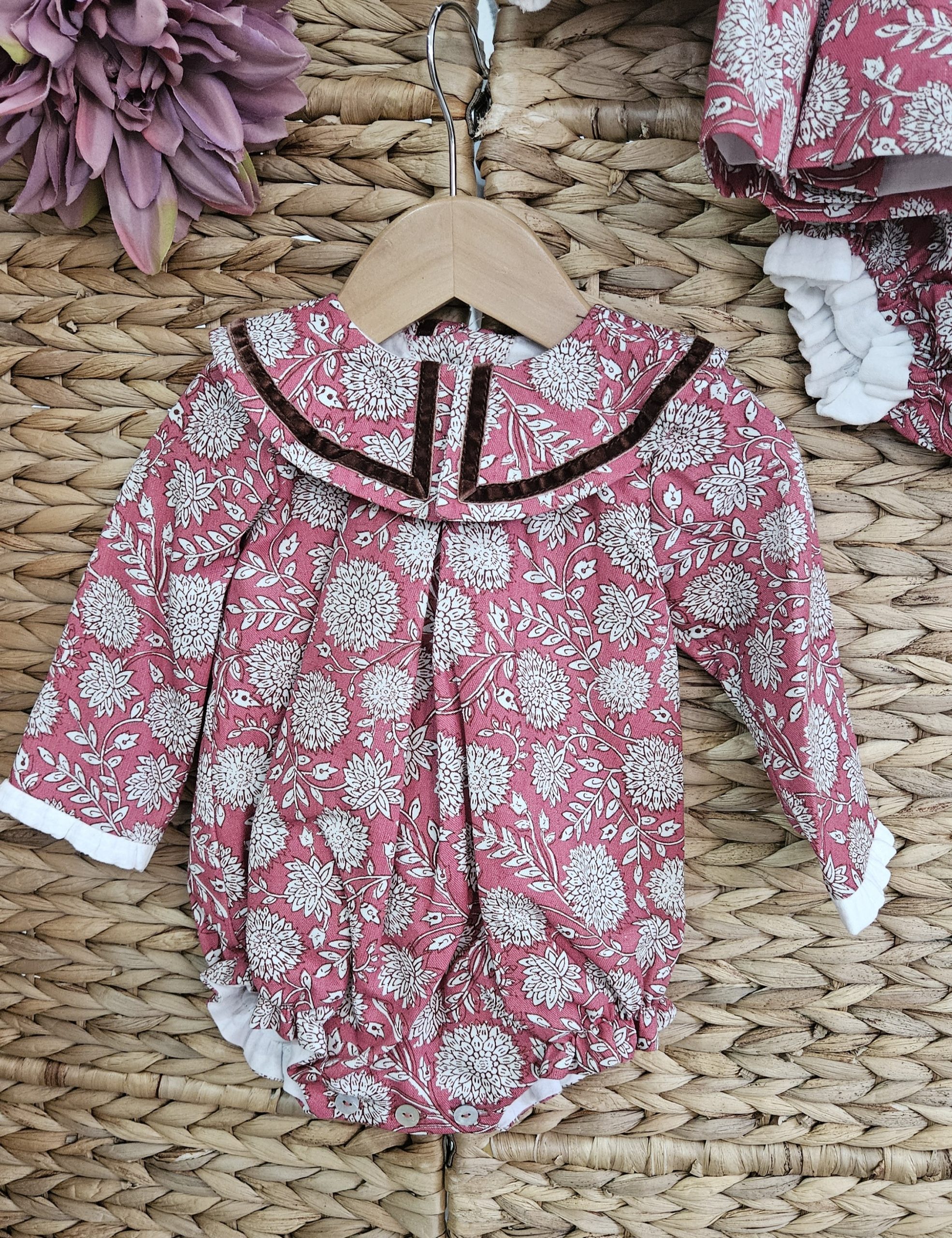 Pelele unisex , enterizo, manga larga estampado tonos burdeos y gris, cuellos grandes con ribete terciopelo al tono .
