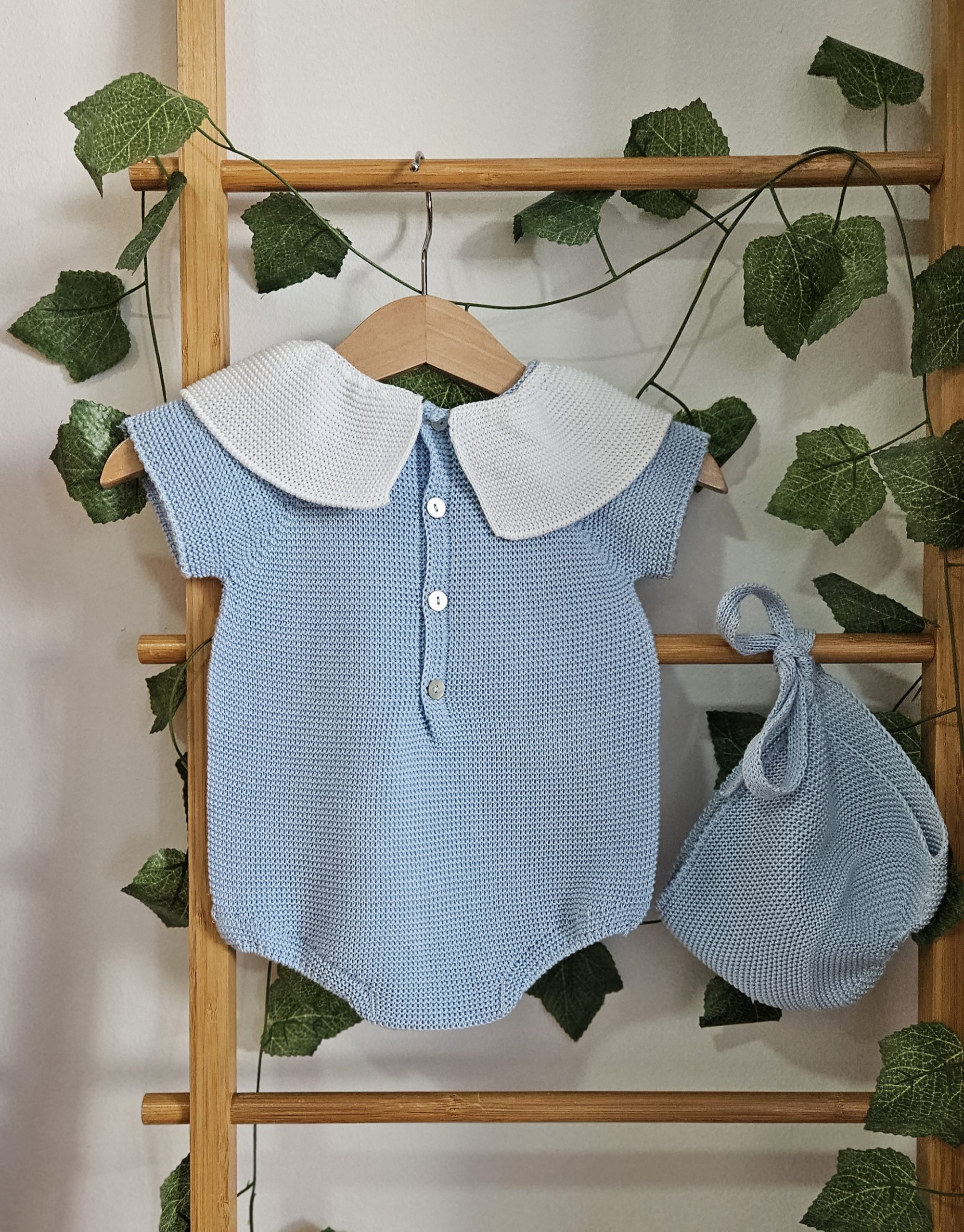Pelele para bebé  manga corta de punto de verano color cielo (azul claro) con capota a juego, modelo cuello volante blanco.   (patucos a juego opcional) Ref. R020038  Hilatura de excelente calidad y confort para el bebé.