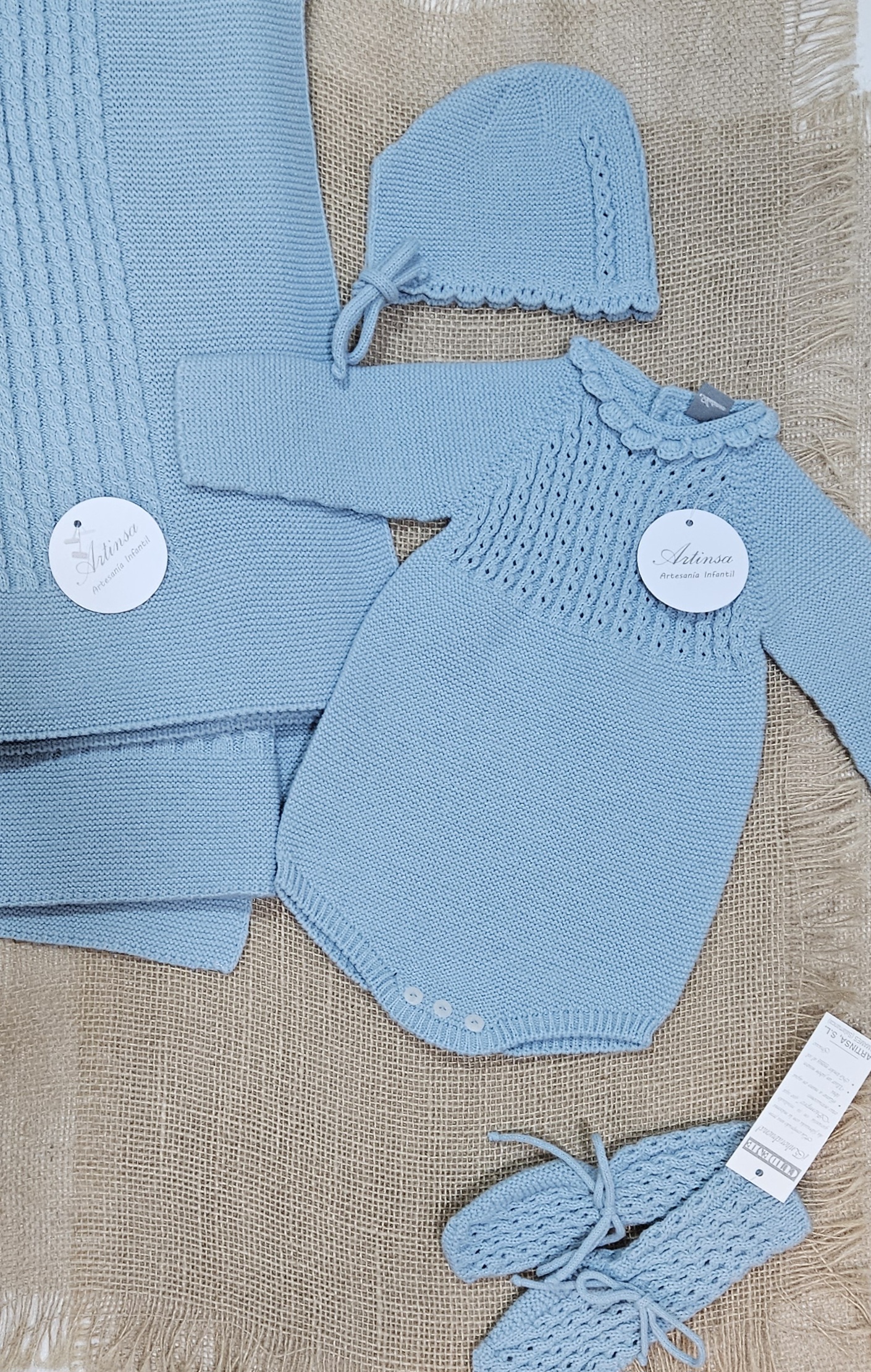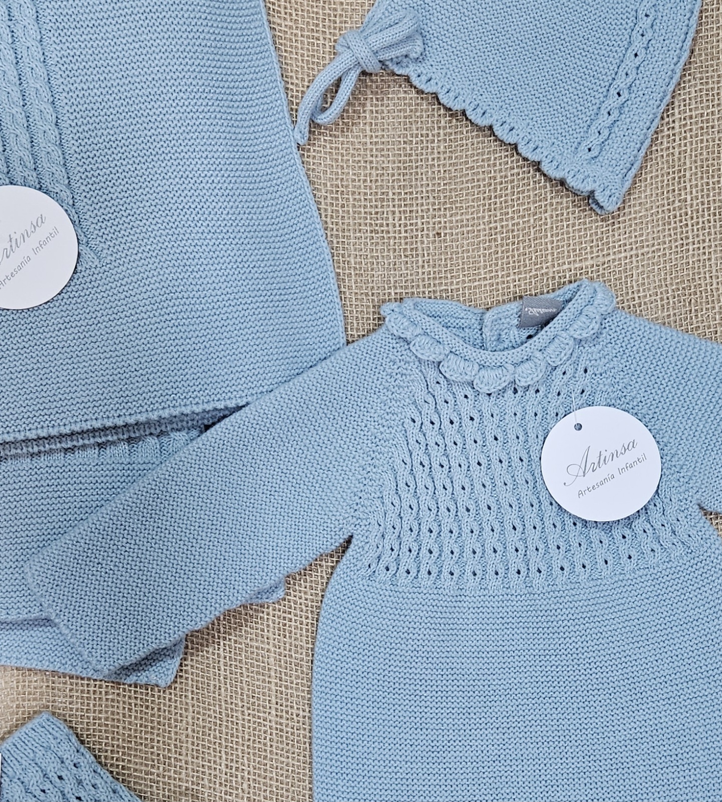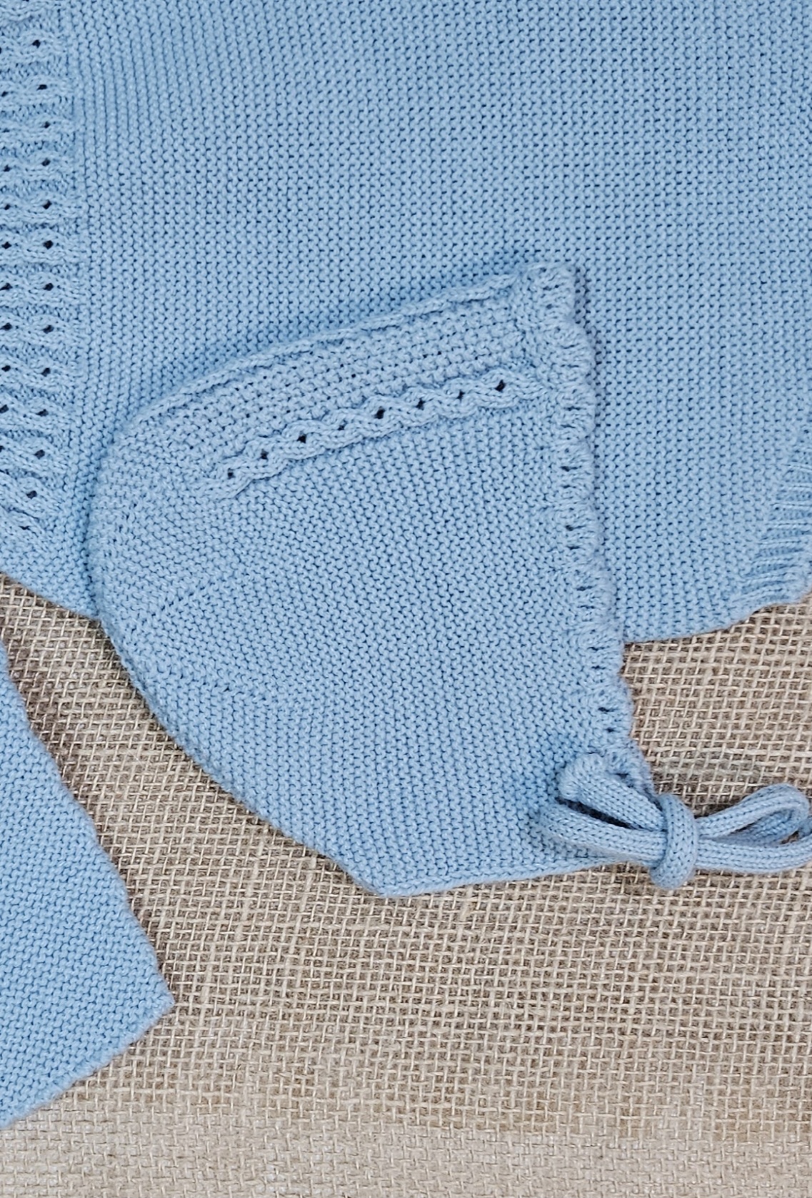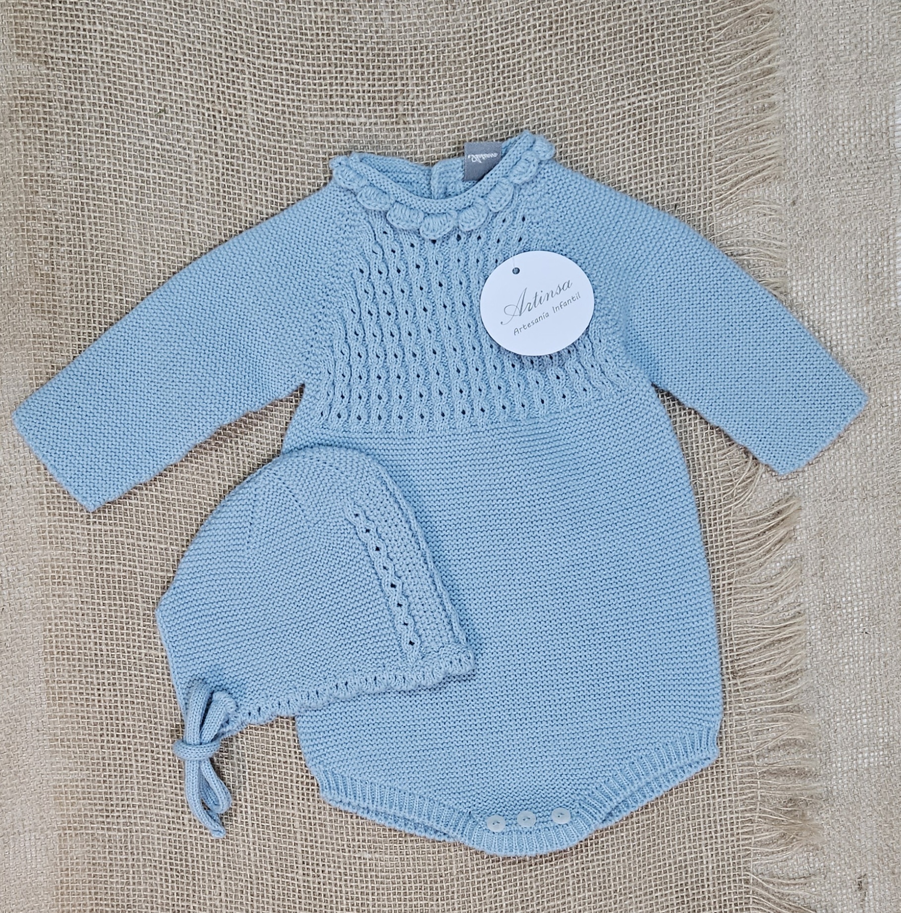 Pelele punto + capota  bebé  – color Azulón . Composición 100% acriclico (Dralón), punto bobo combinado con ochos abierto, con botones en la parte tasera   Hilatura de excelente calidad y tacto muy suave y confortable.  Marca Artinsa.