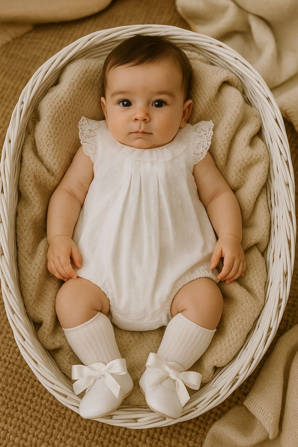 Pelele bebé en tejido plumeti beig (blanco roto) 100% algodón exterior, forro 100% algodón, adornado con encajes al tono, ideal para ceremonia.