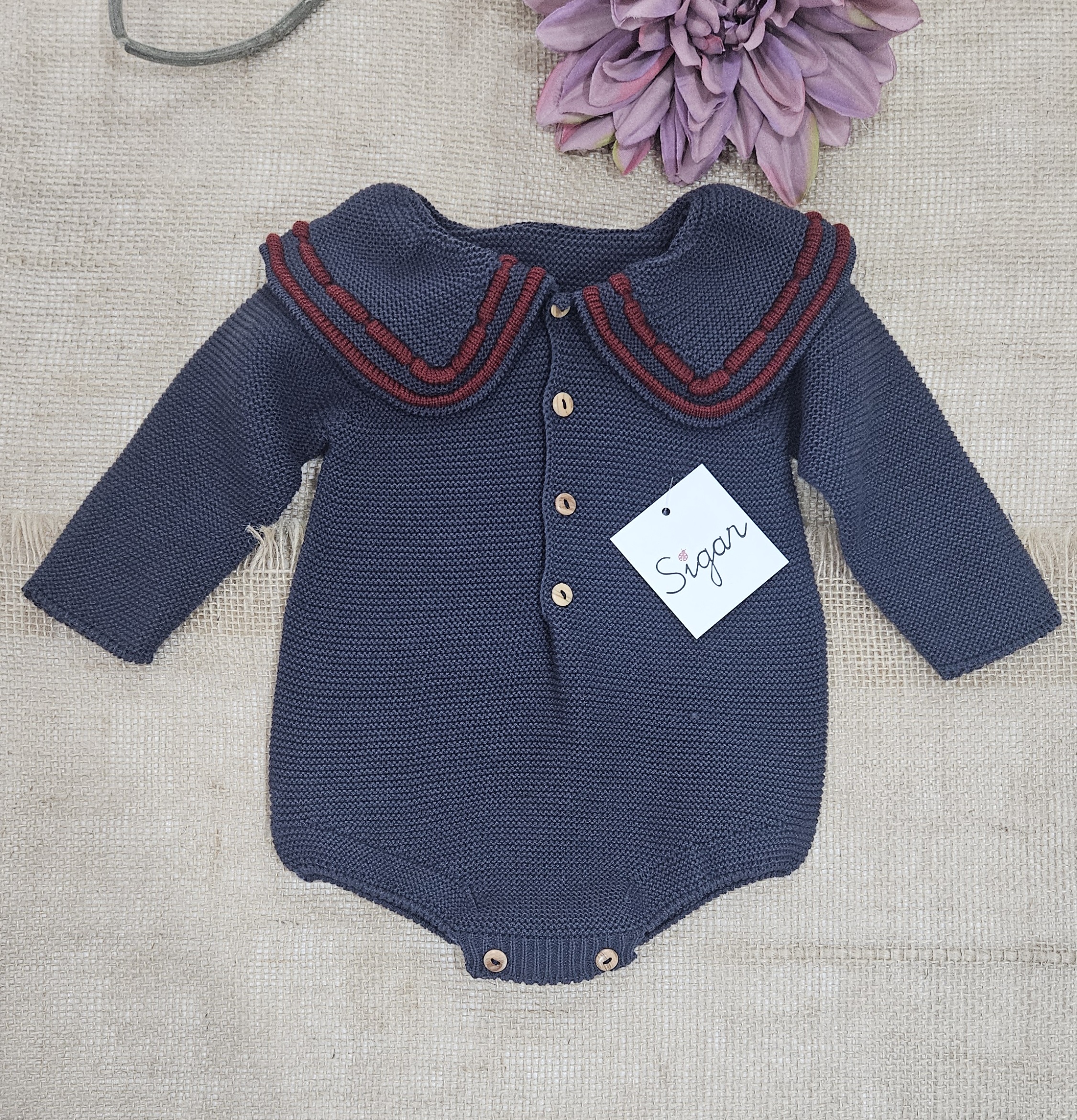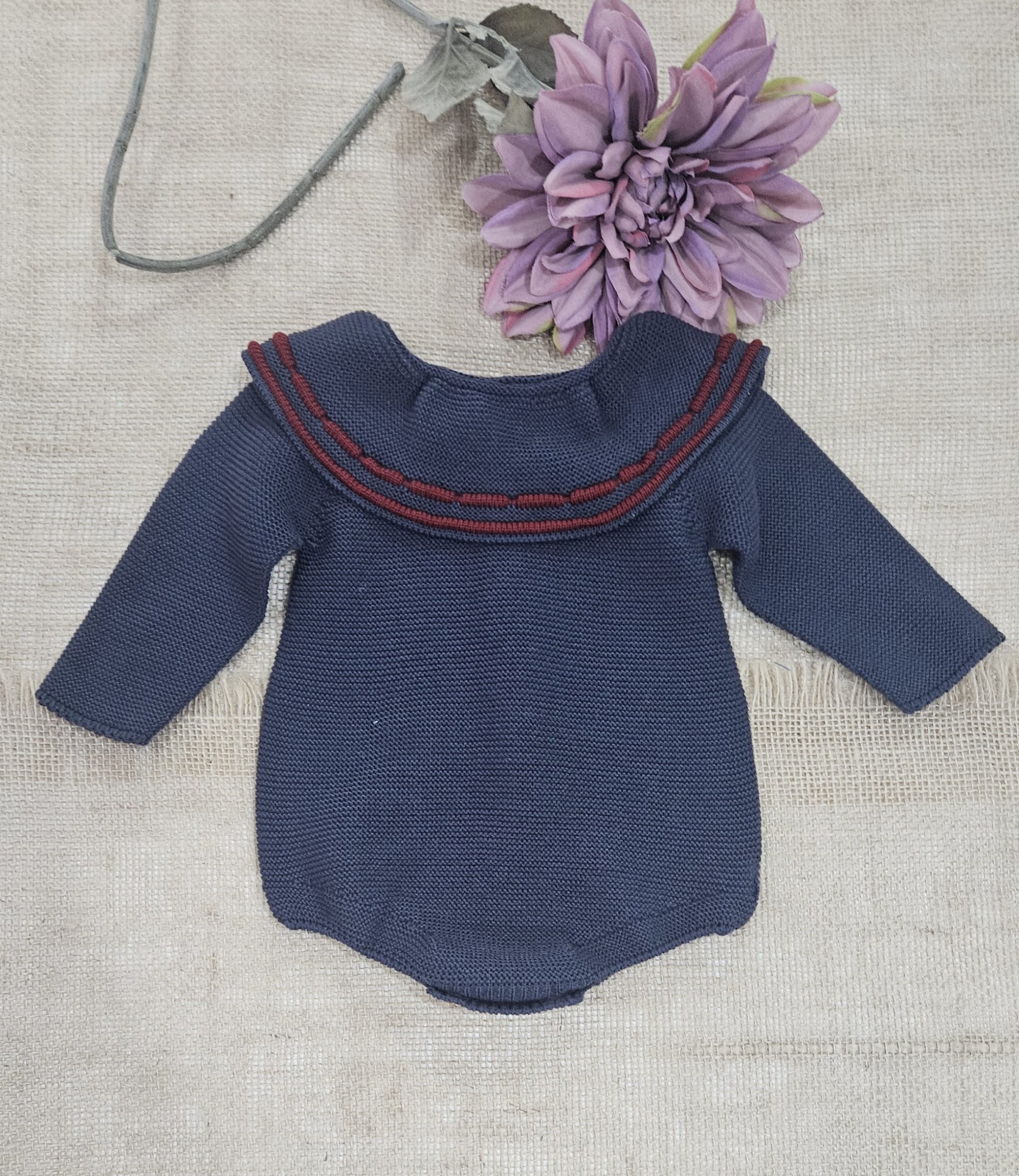 Pelele punto bebé – color Carbón . Composición 100% acriclico (Dralón), punto bobo con botones en la parte delantera y cuello bebé grande ribete color burdeos. Hilatura de excelente calidad y tacto muy suave y confortable. Marca Sigar.