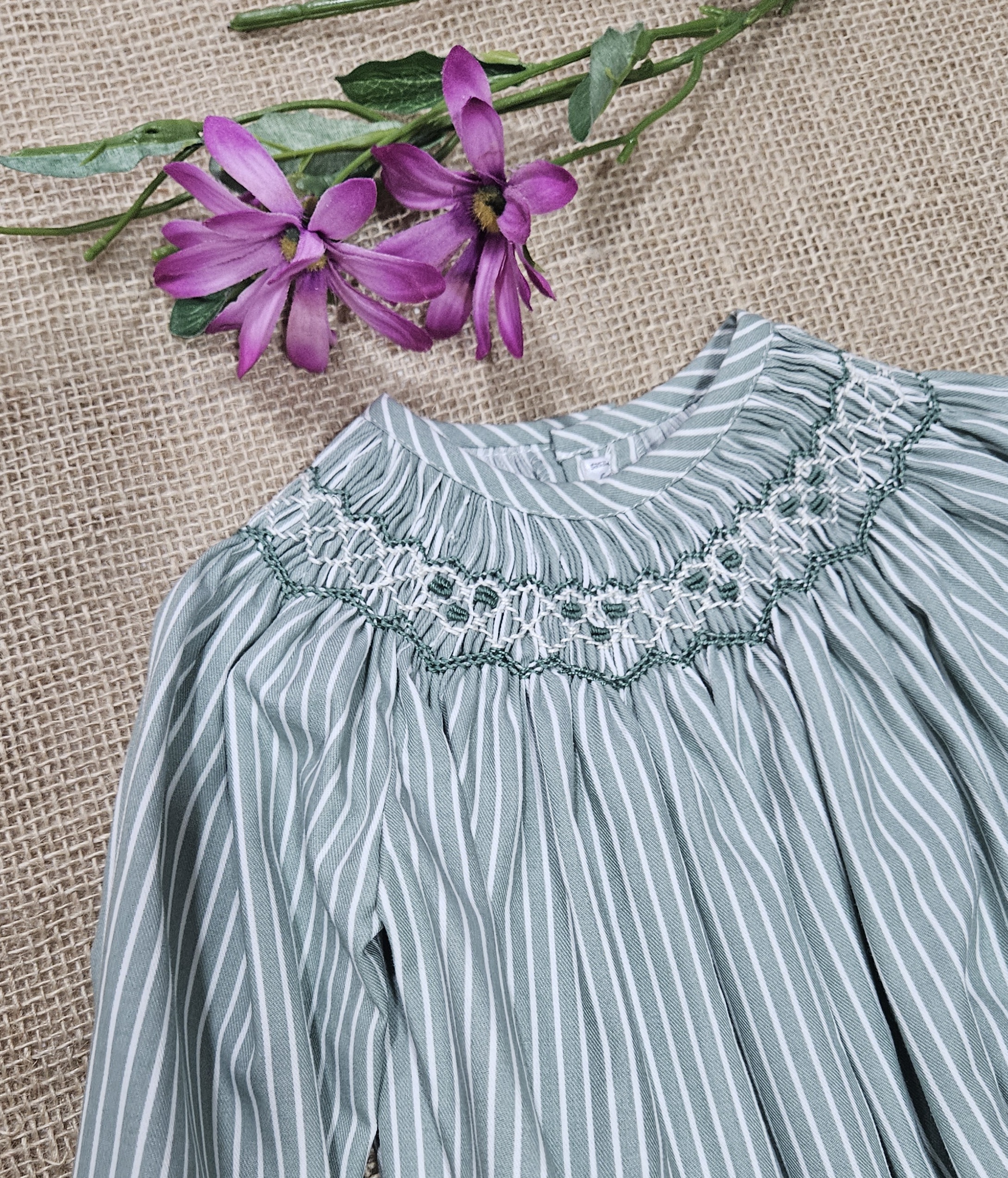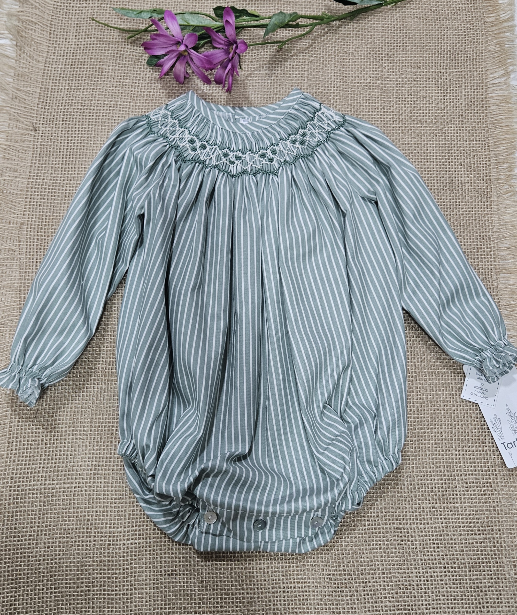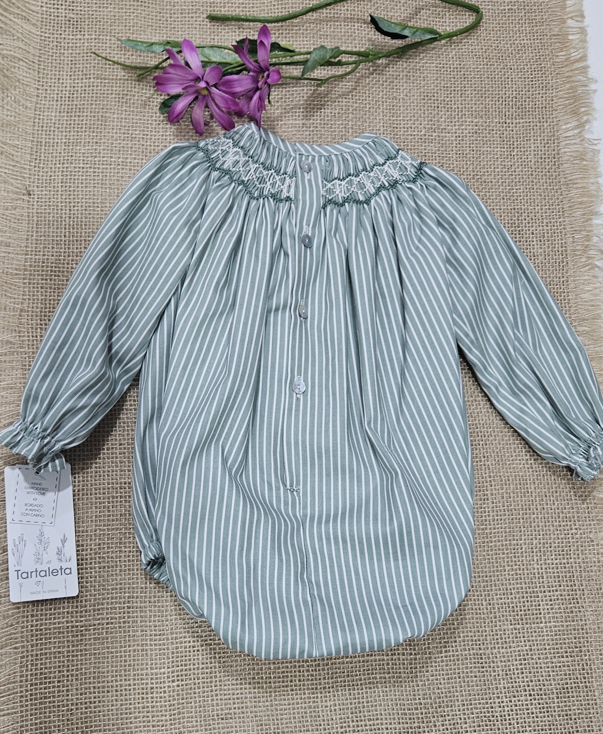 Pelele unisex , tejido estampado rayas verde punto smock. Composición 100% algodón. Bordado a mano. Marca Tartaleta. Fabricado en España.-