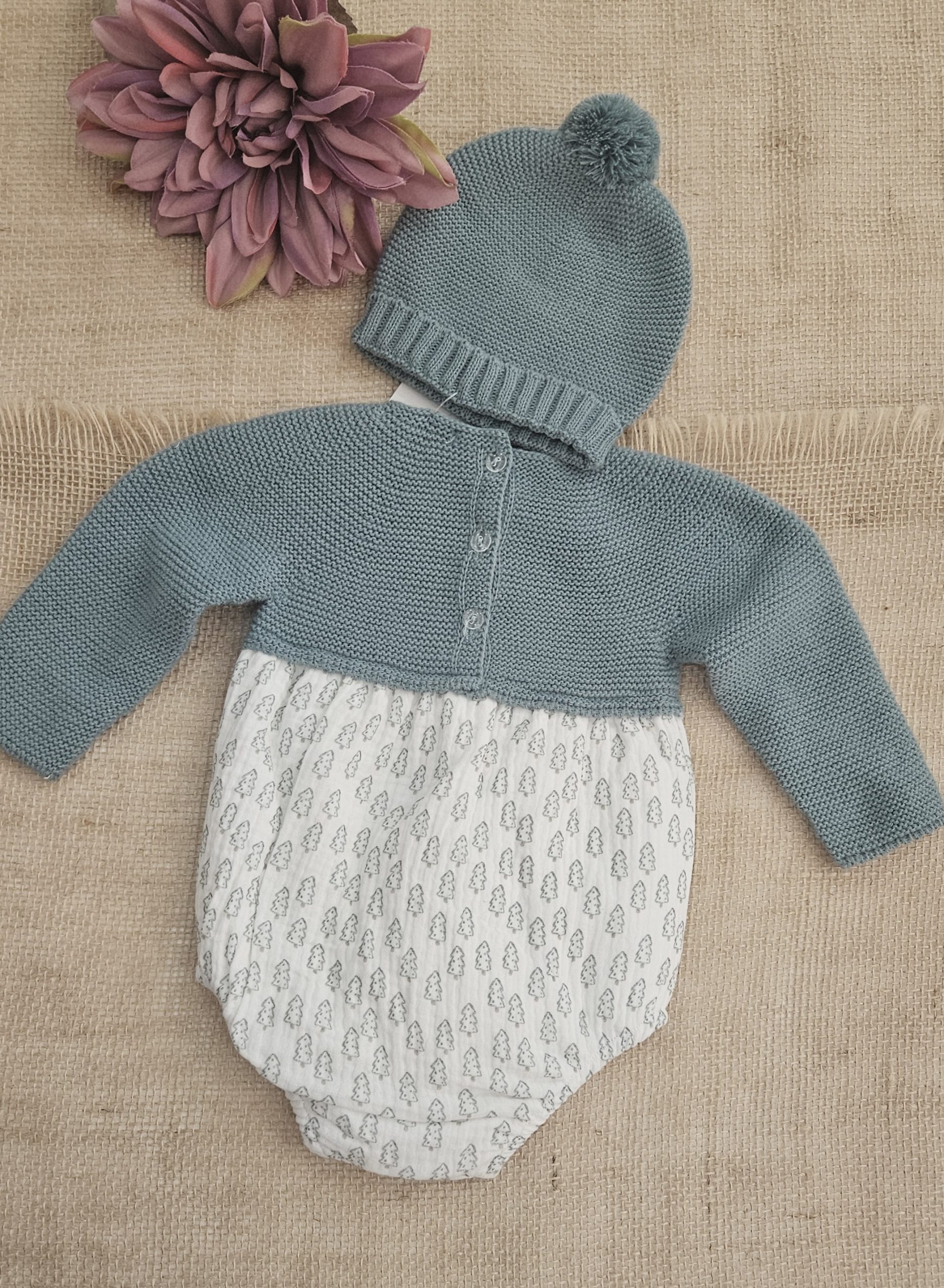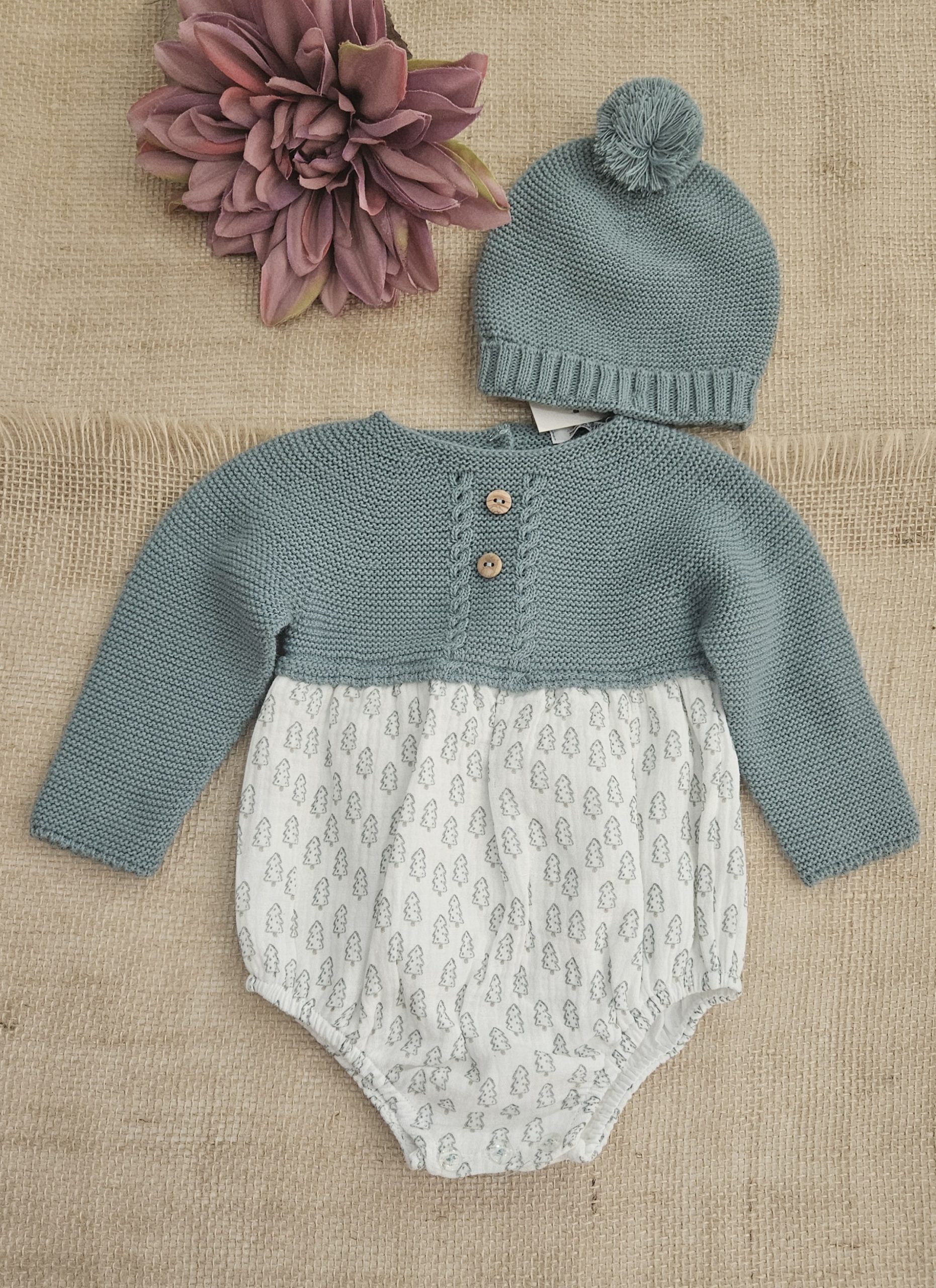 Pelele punto bebé  combinado con tela estampada arbolitos punto verde empolvado y gorrito de punto a juego.