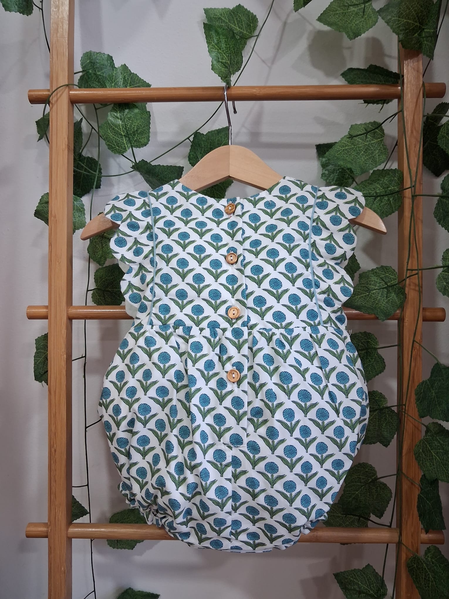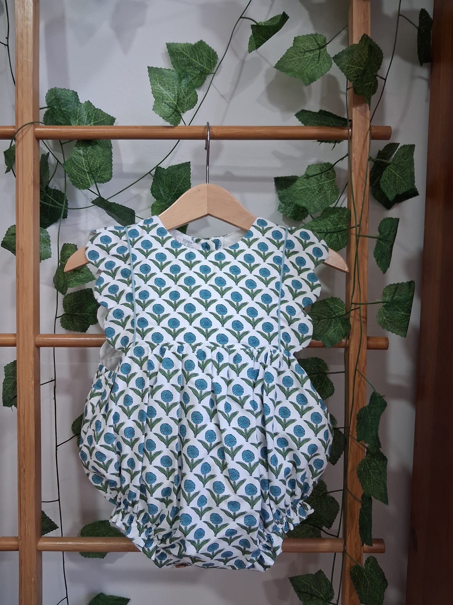 Pelele ranita  ,  tejido estampado flor tonos verde turquesa, ideal para llevar sólo o con blusa debajo .Popys