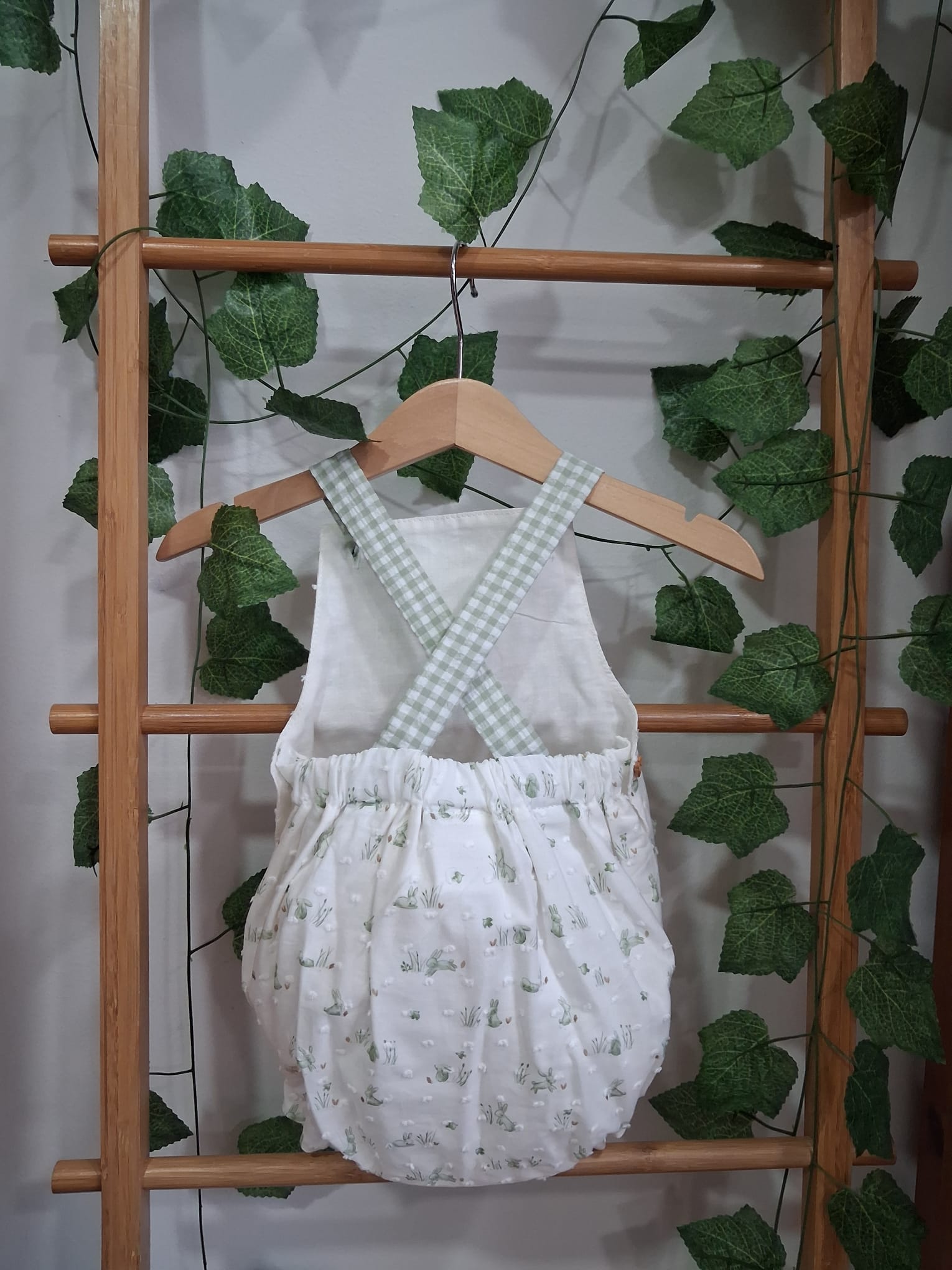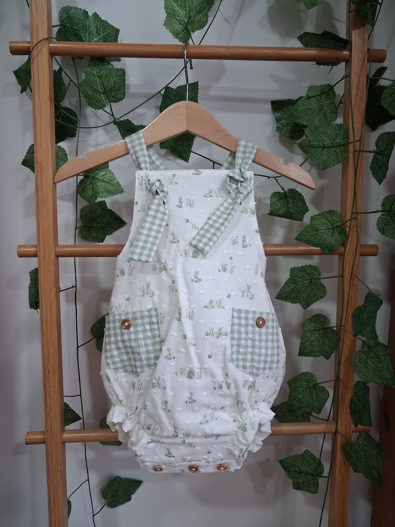 Ranita bebé  ,  tejido estampado conejitos combinado con vichy verde, ideal para llevar sólo o con blusa debajo .Popys