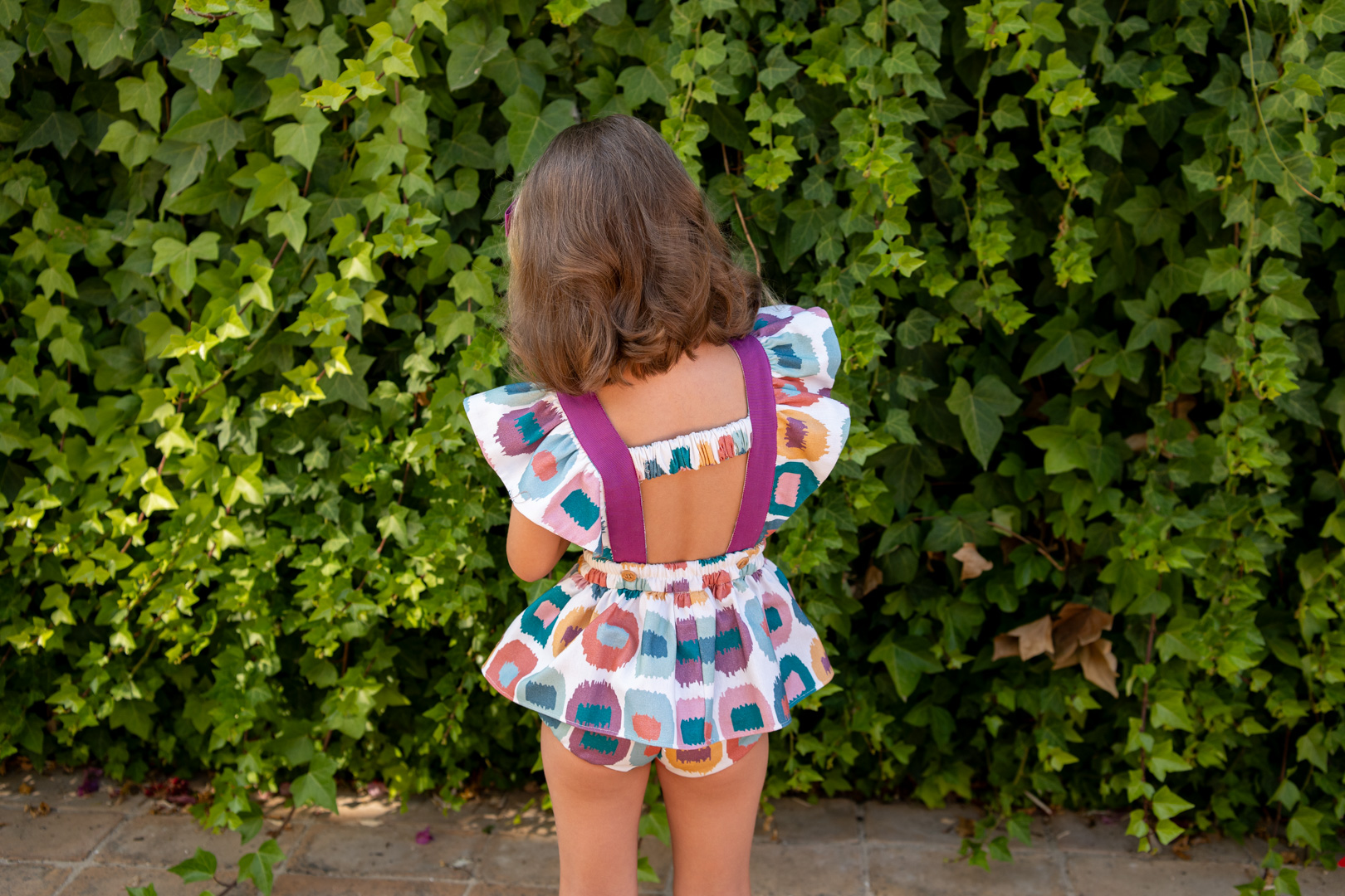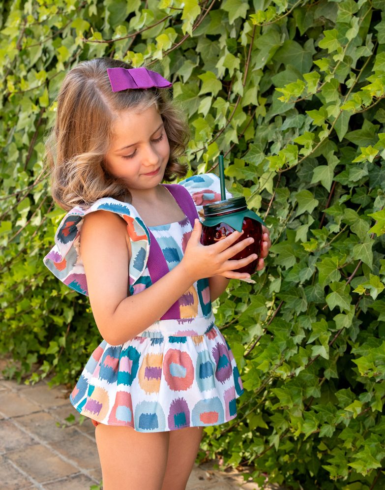 Ranita volante para niña estampado manchas colores rosa, verde,  incorpora en la parte de la cintura botones en parte delantera y trasera para poder ajustar el talle a la medida necesaria asi como tiran en la espalda para evitar que las tirantas de caigan del hombro , José Varón Moda infantil.   ref 58063 Colección coordinada para hermanos. Primavera Verano 2026