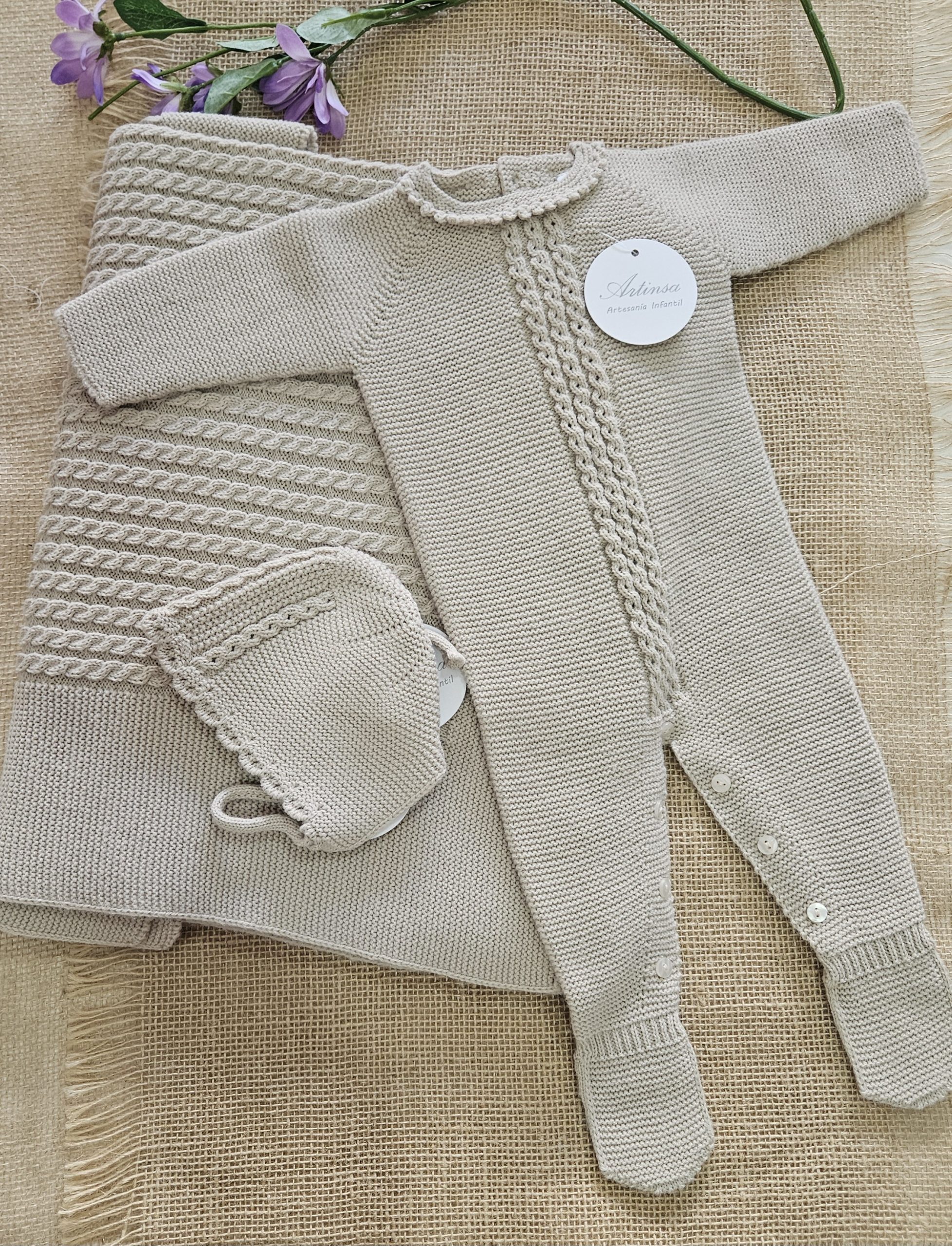 Set Mantita, Pelele punto + capota  bebé  – color Beig .  punto bobo combinado con ochos , con botones en la parte tasera , pelele enterizo con botones para facilitar el cambio del pañal del bebé Hilatura de excelente calidad y tacto muy suave y confortable.  Marca Artinsa.