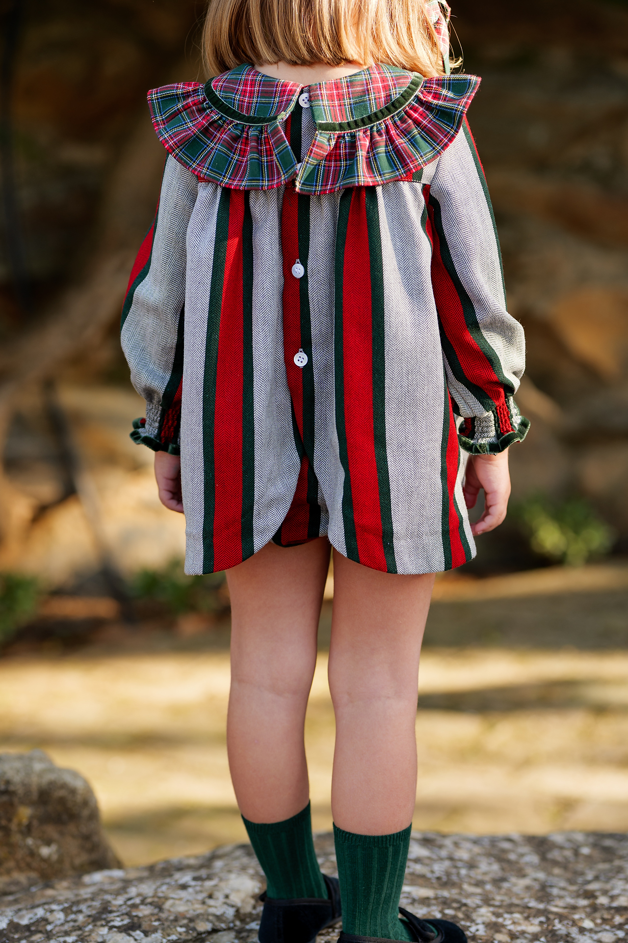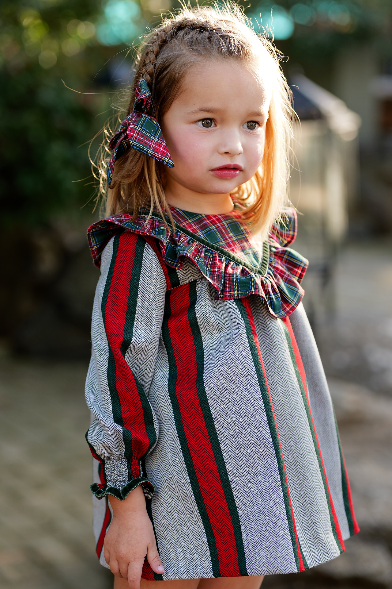 Vestido mas cubre para niña estampado rayas granate, verde combinado con cuello cuadros escocés, ideal para reportajes navideños… José Varón Moda infantil.   ref 56009 Colección coordinada para hermanos.