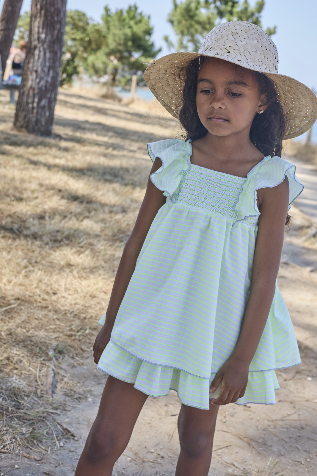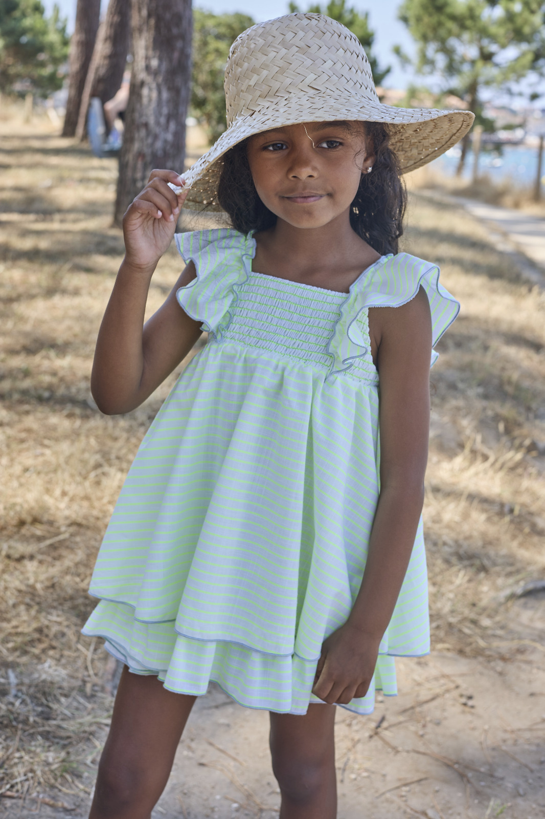 Vestido para niña  estampado rayas flúor estampadas en horizontal, de talla medio alto  con falda de vuelo,  pecherin engomado color grisáceo. Manga a la sisa volante.  Para completar conjunto disponible lazo a juego con la colección.  Marca La Martinica by Sobrino.-  Colección Pescardinos  Verano 2026