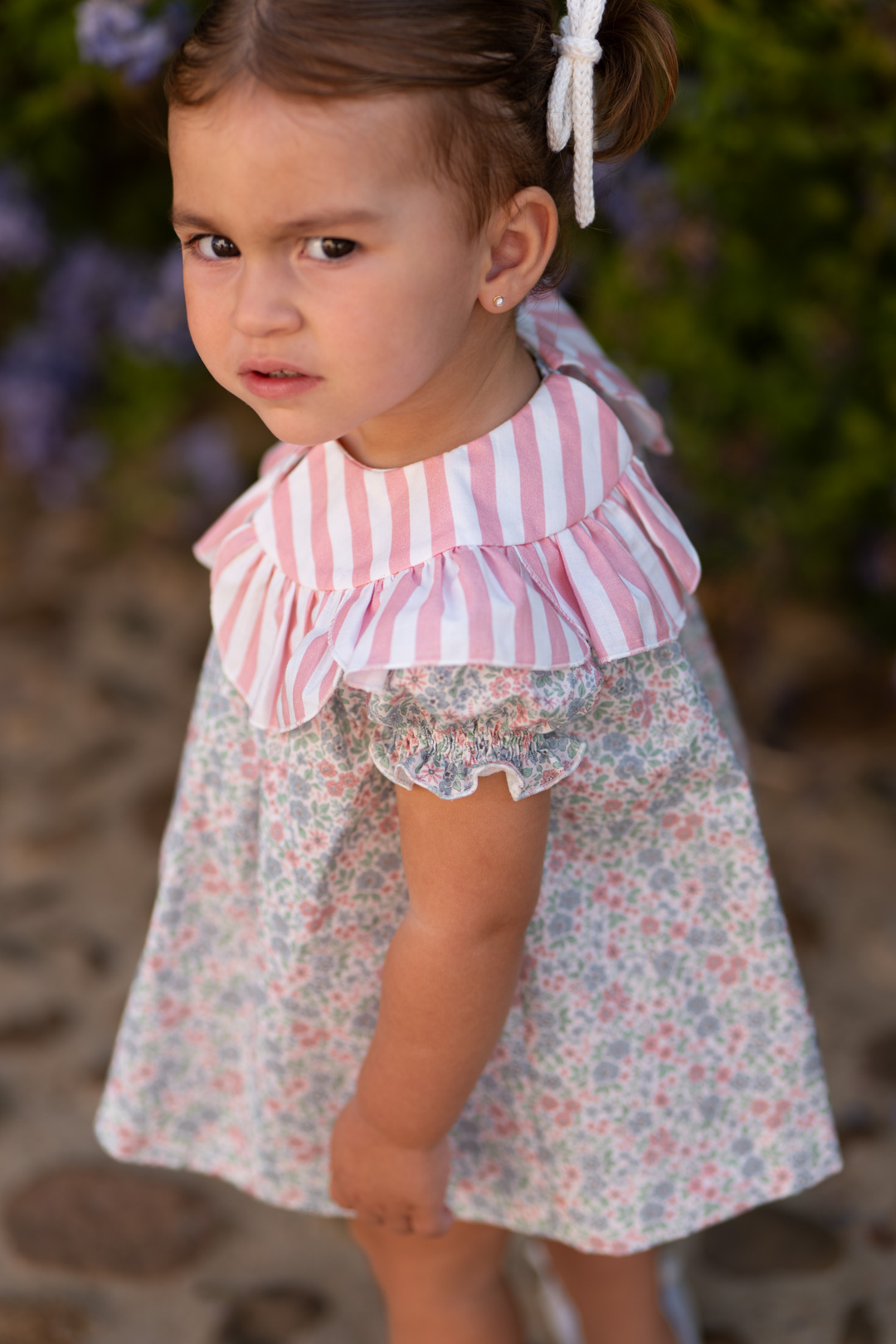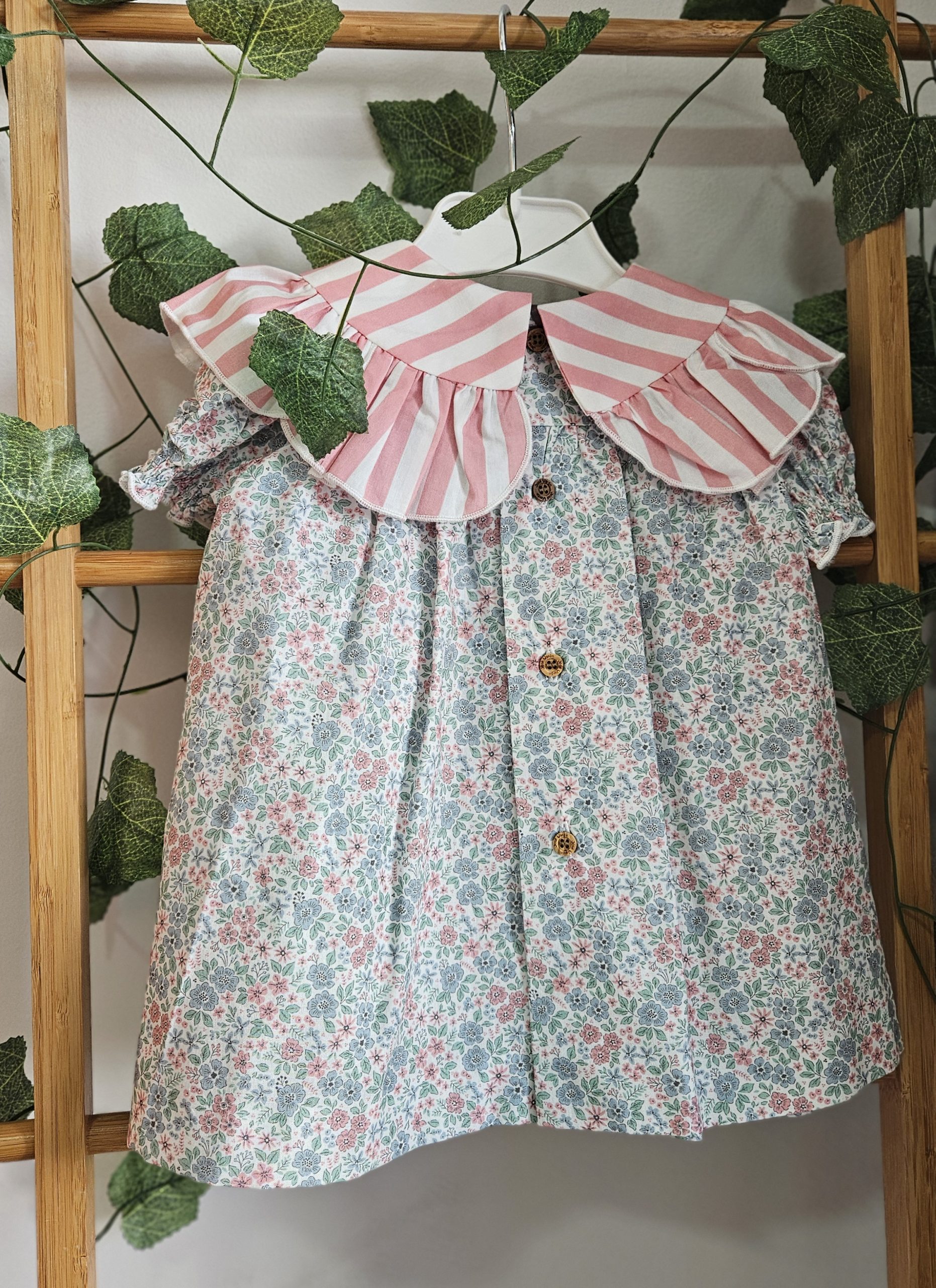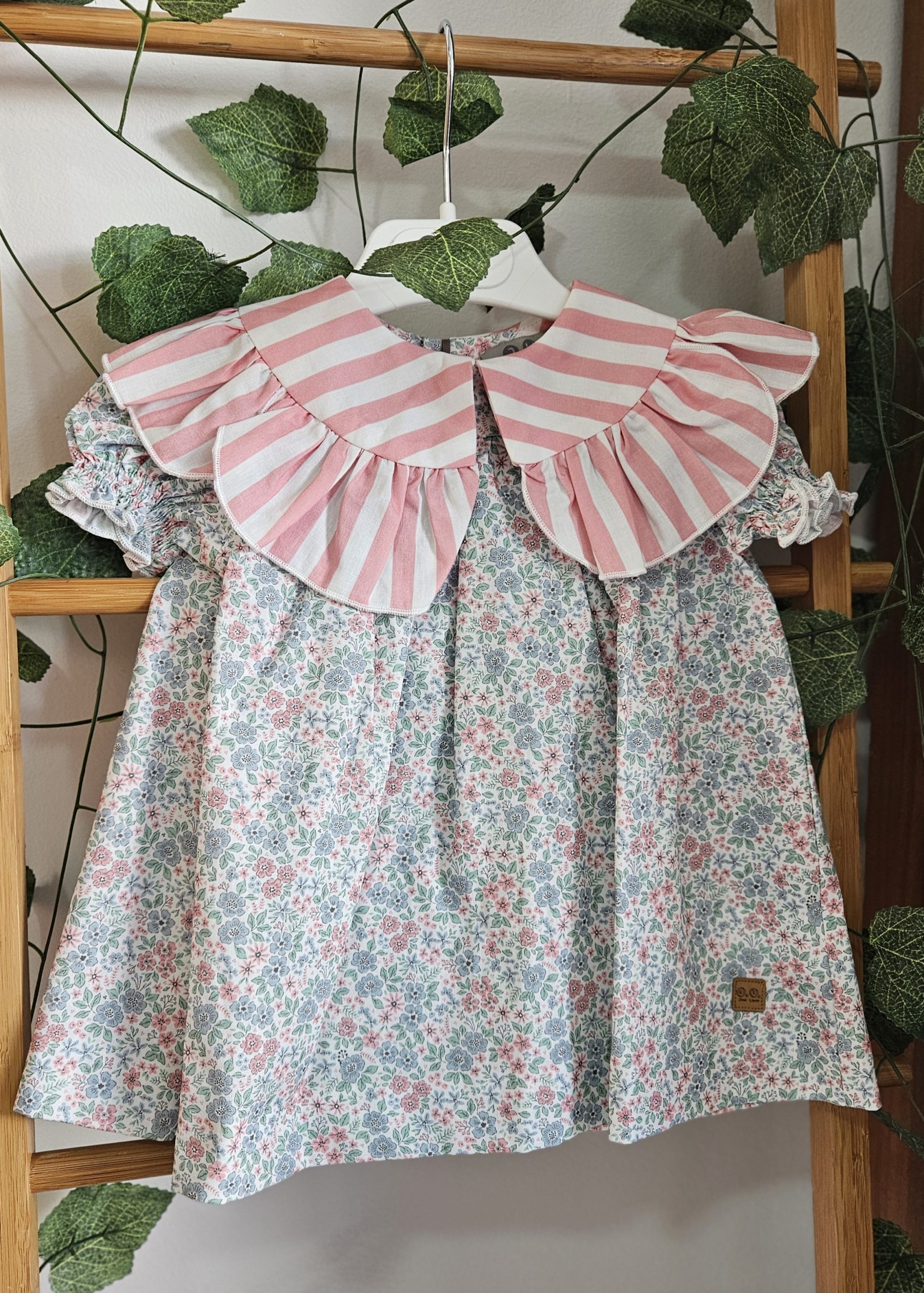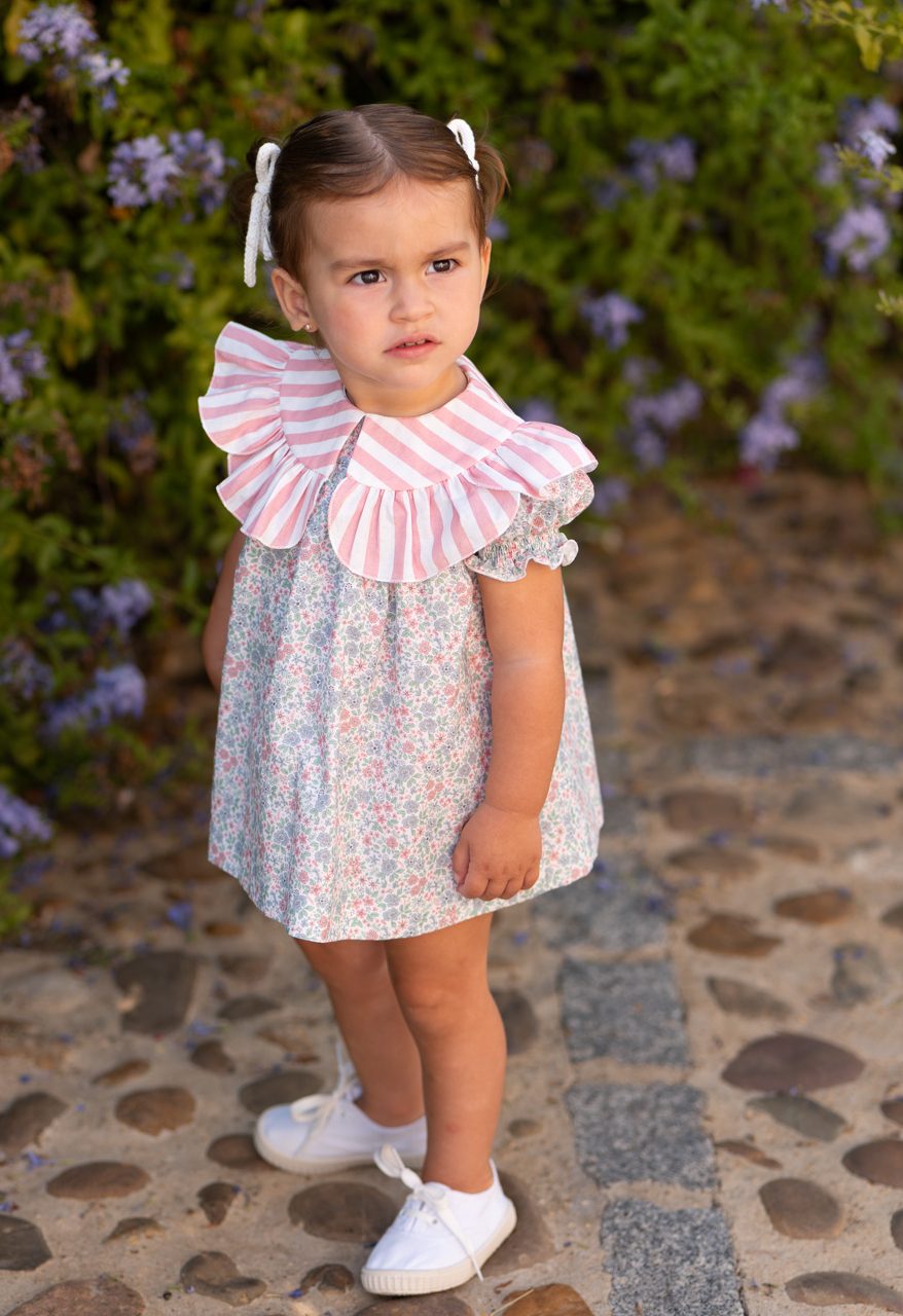 Vestido para niña estampado liberty tonos rosa y azules,  Cuello estampado rayas rosa , José Varón Moda infantil.   ref 58037  Colección coordinada para hermanos. Primavera Verano 2026