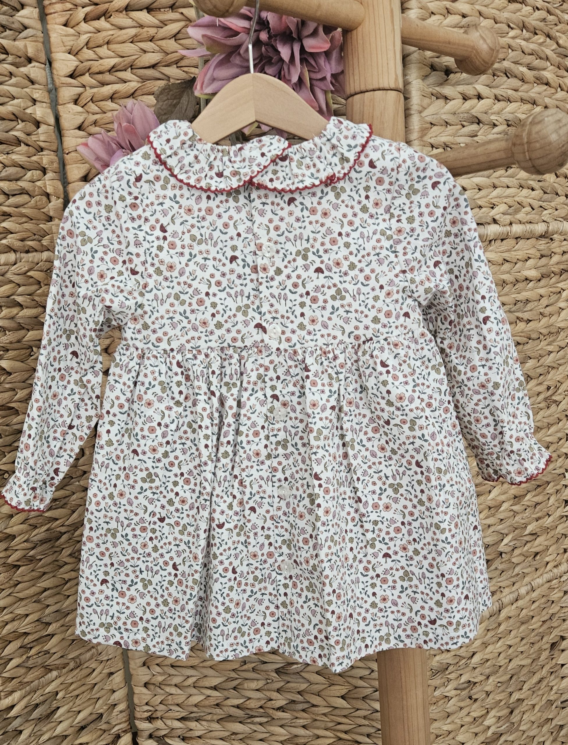 Vestido para niña bebé  estampado liberty cuello volante punto smock color cereza. Nueva colección Otoño Invierno, disponible pelele a juego para combinar a hermanos.