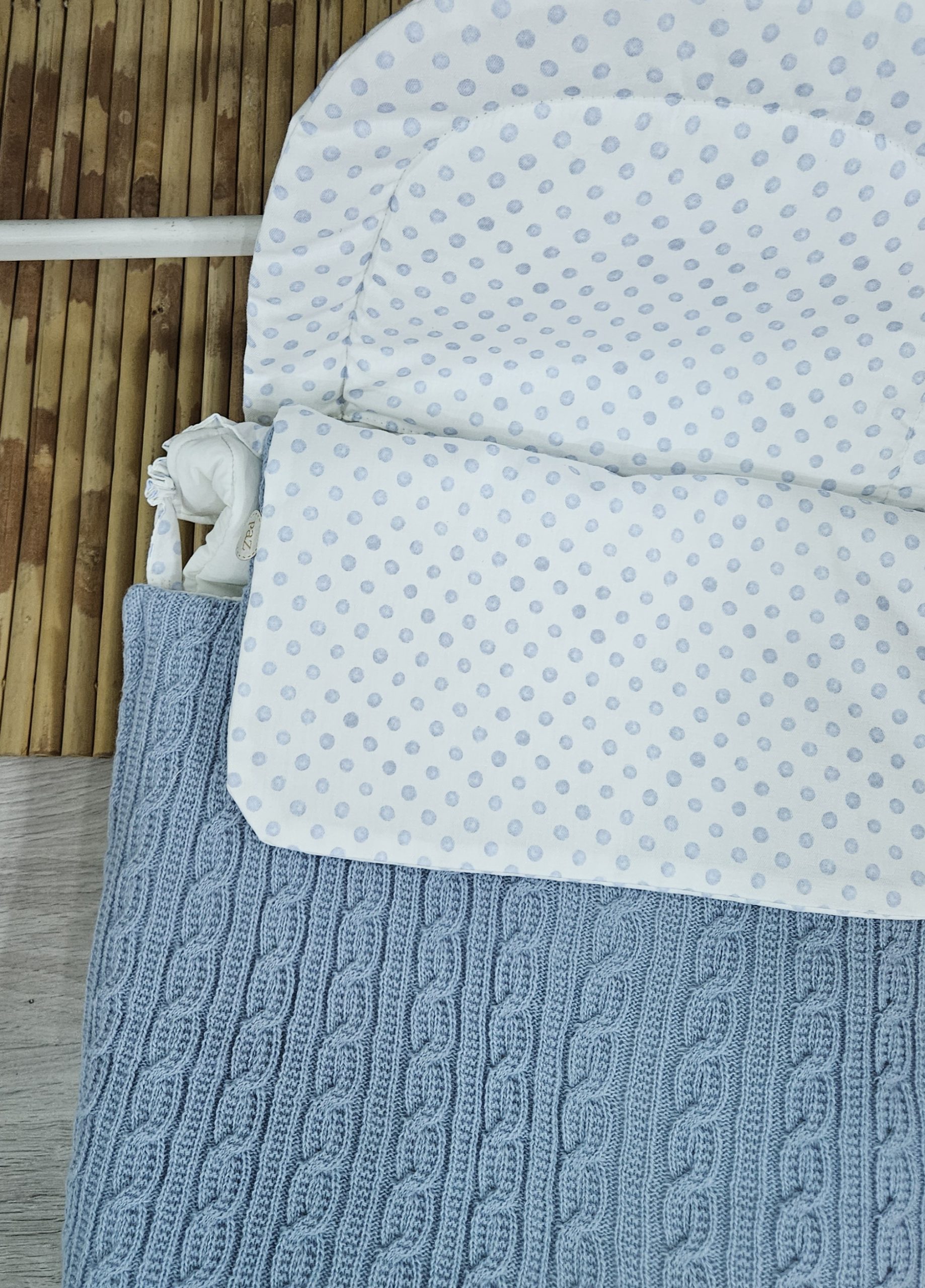 Colcha coche ajustable confeccionada en punto color azul amanecer y tejido estampado topos al tono. Dos piezas colcha punto con vuelta tela más pieza suelta en estampada para poner debajo de la cabeza del bebé a modo de almohada.
