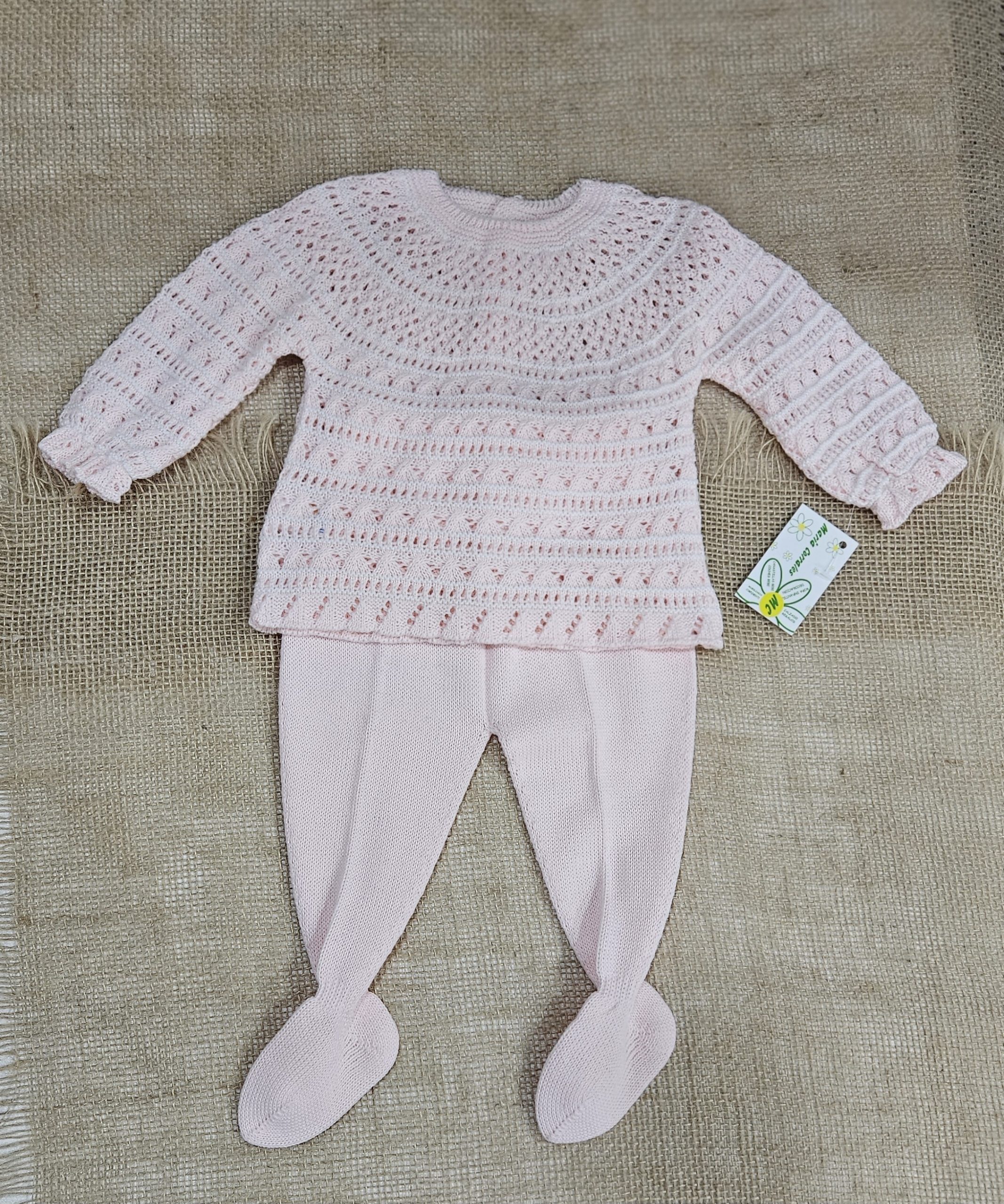 Conjunto de punto de primavera / verano compuesto por  jersey manga larga calada combinado en rosa bebé y blanco  + polaina a juego 50% algodón  50% acrílico
