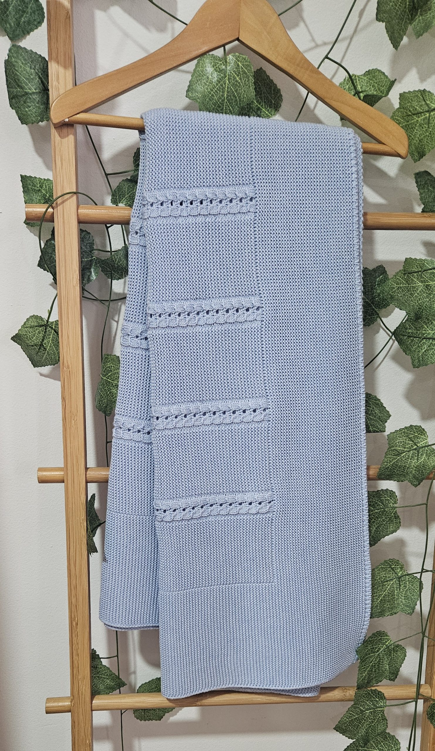Toquilla mantita de punto  bebé unisex – color Cielo. Composición 100% acriclico (Dralón), punto bobo combinado con punto ochitos.   Hilatura de excelente calidad y tacto muy suave y confortable.  Marca Sigar.