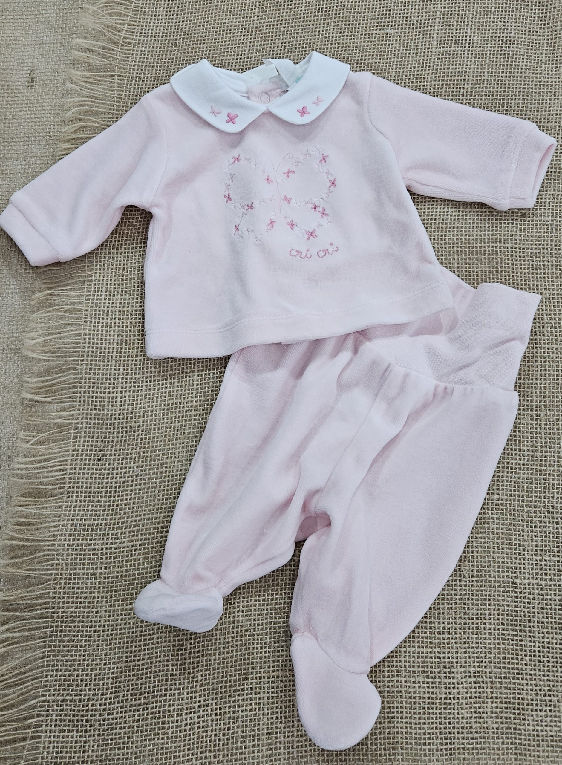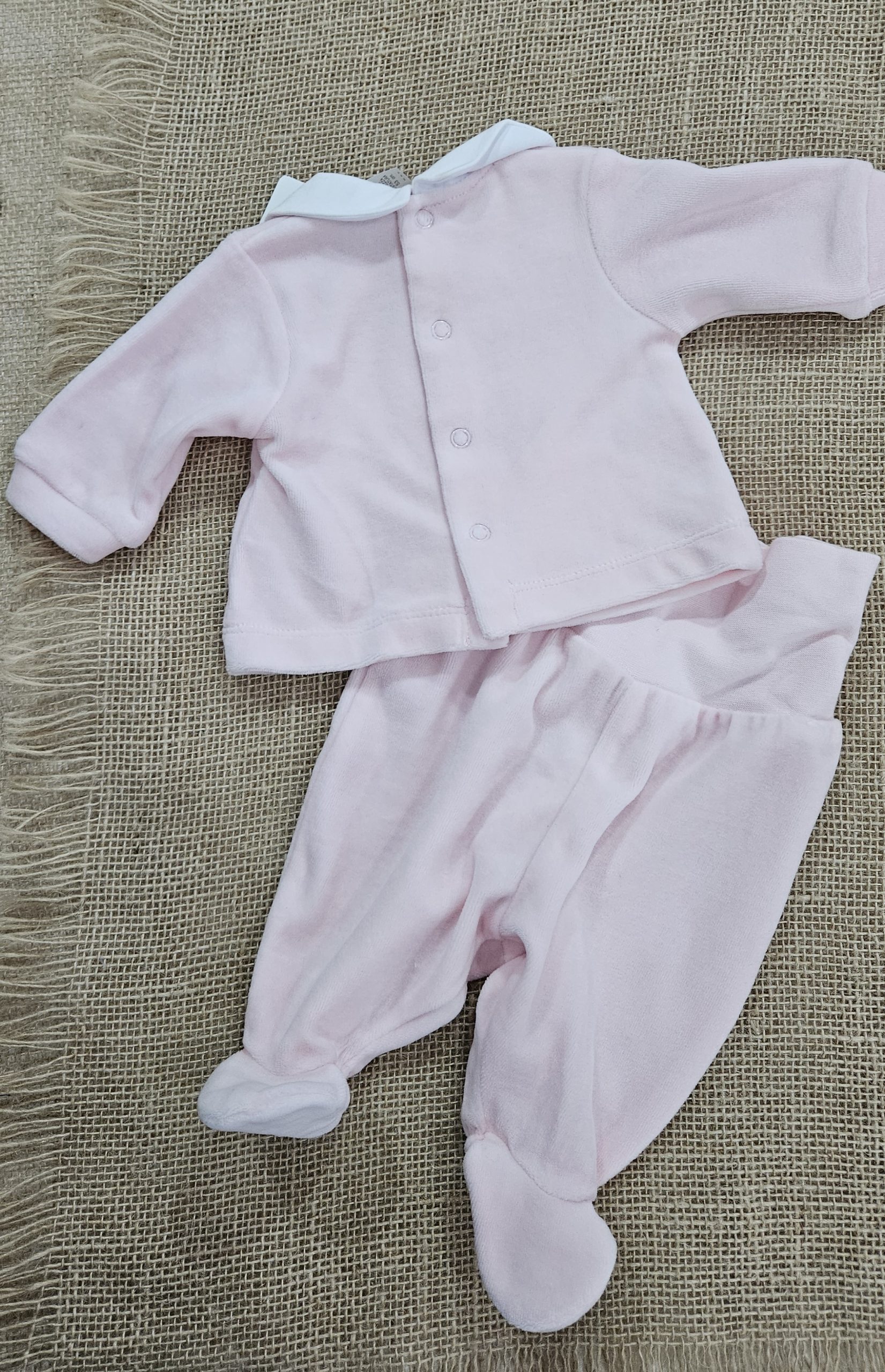 Pijama para bebé terciopelo tundosado  80% algodón, 20 poliester, dos piezas manga larga con pies. Adorno cuello tela blanco