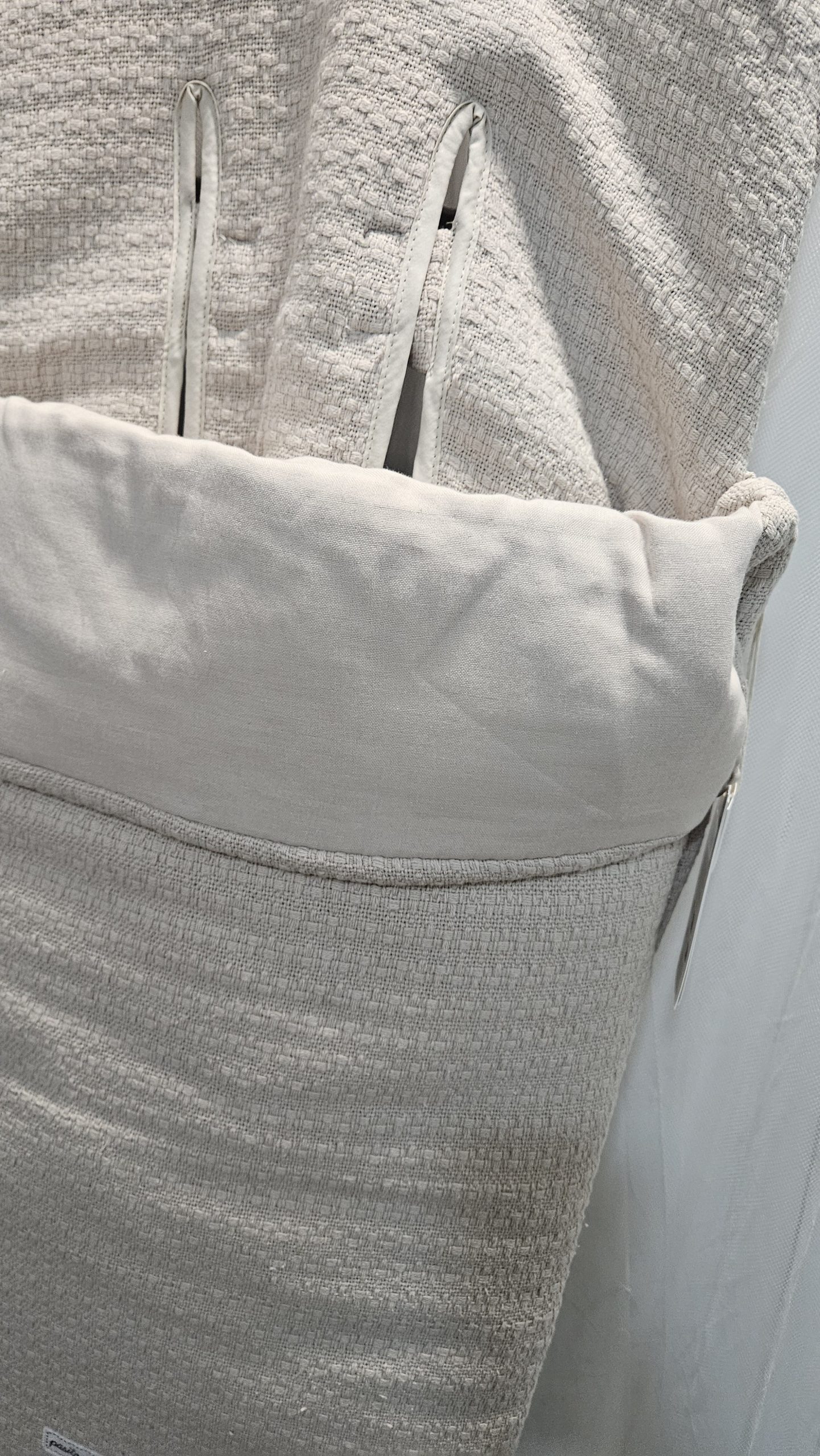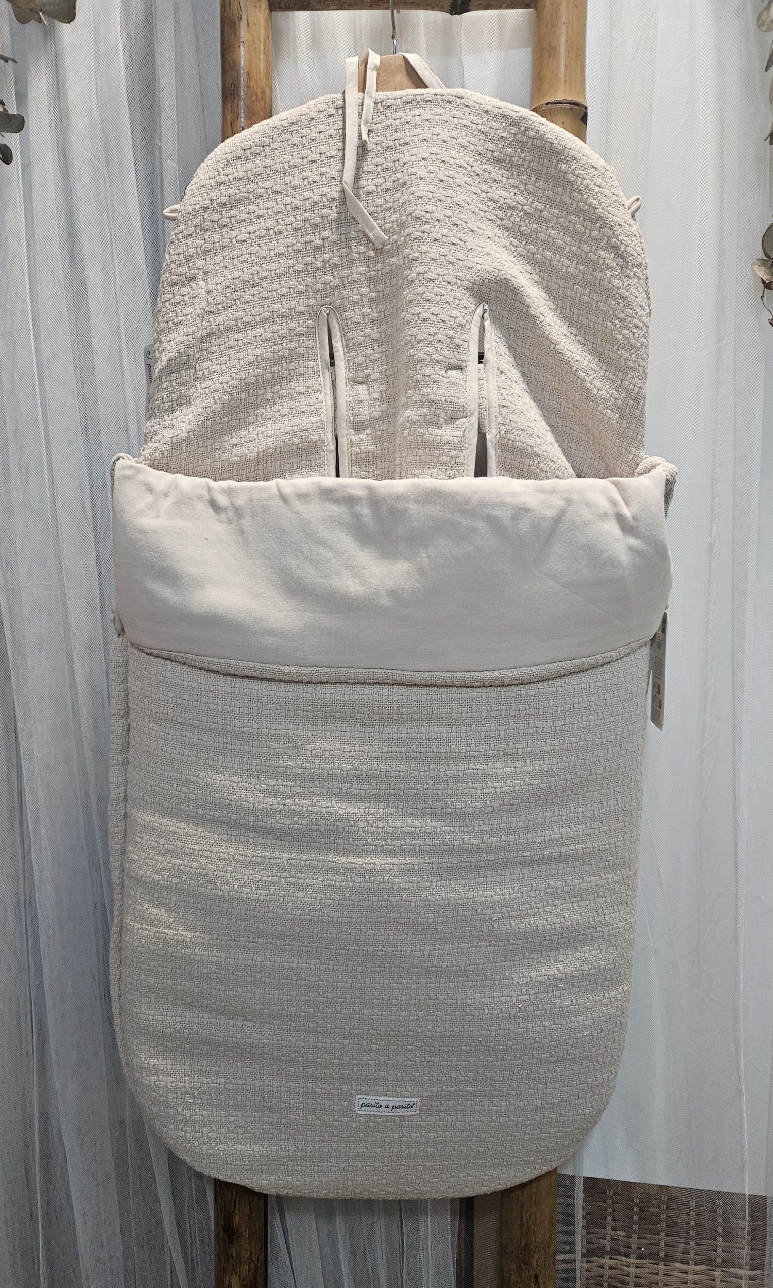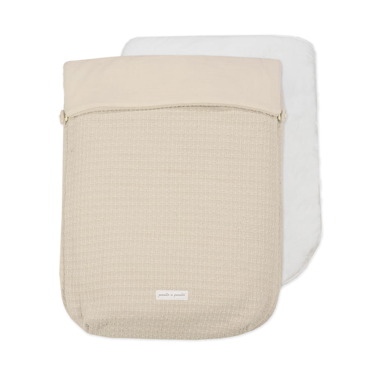 Saco silla Icon Cream de Pasito a pasito en tejido leno y bambula muy suave ideal para cubrir la silla de paseo provista de saco. Está diseñado en el respaldar con una capa de tejido en material transpirable que aísla la humedad y evita la sudoración excesiva del bebe haciendo el paseo más confortable. Relleno de fibra hueca extraíble. Reposapiés en poliéster para facilitar la limpieza. Dispone de varias aperturas (ojales) y ajustes para adaptarla a la mayoría de la sillitas de paseo, convirtiendo el paseo de tu bebé seguro y confortable. Es un diseño bonito, simple y cómodo que crea un nido para tu bebé manteniéndolo arropado y protegido en días de brisa. El saco se adapta sin problemas a cualquier coche para darle la comodidad que necesita. Acabados de calidad. Todas nuestras fundas están fabricadas conforme a las más exigentes normativas europeas, con materiales de gran calidad, libres de colorantes azoicos, ftalatos y sustancias nocivas para la salud. Tela de fácil limpieza, se recomienda lavar a máquina a 30º. Los productos para bebé de Pasito a Pasito cuentan con un diseño muy diferente a todas las demás. Sus colecciones se caracterizan por el trabajo al detallada, pensadas siempre desde un punto de vista práctico. Utilizan materiales de primera calidad para remarcar la elegancia y la armonía en cada una de sus piezas. Nuestros modelos son exclusivos y de estilo inconfundible, pensados en las madres actuales que gozan de buen gusto y que aprecian los detalles tanto como nosotros. Materiales: 100% algodón. Color: Beige. Tamaño universal.