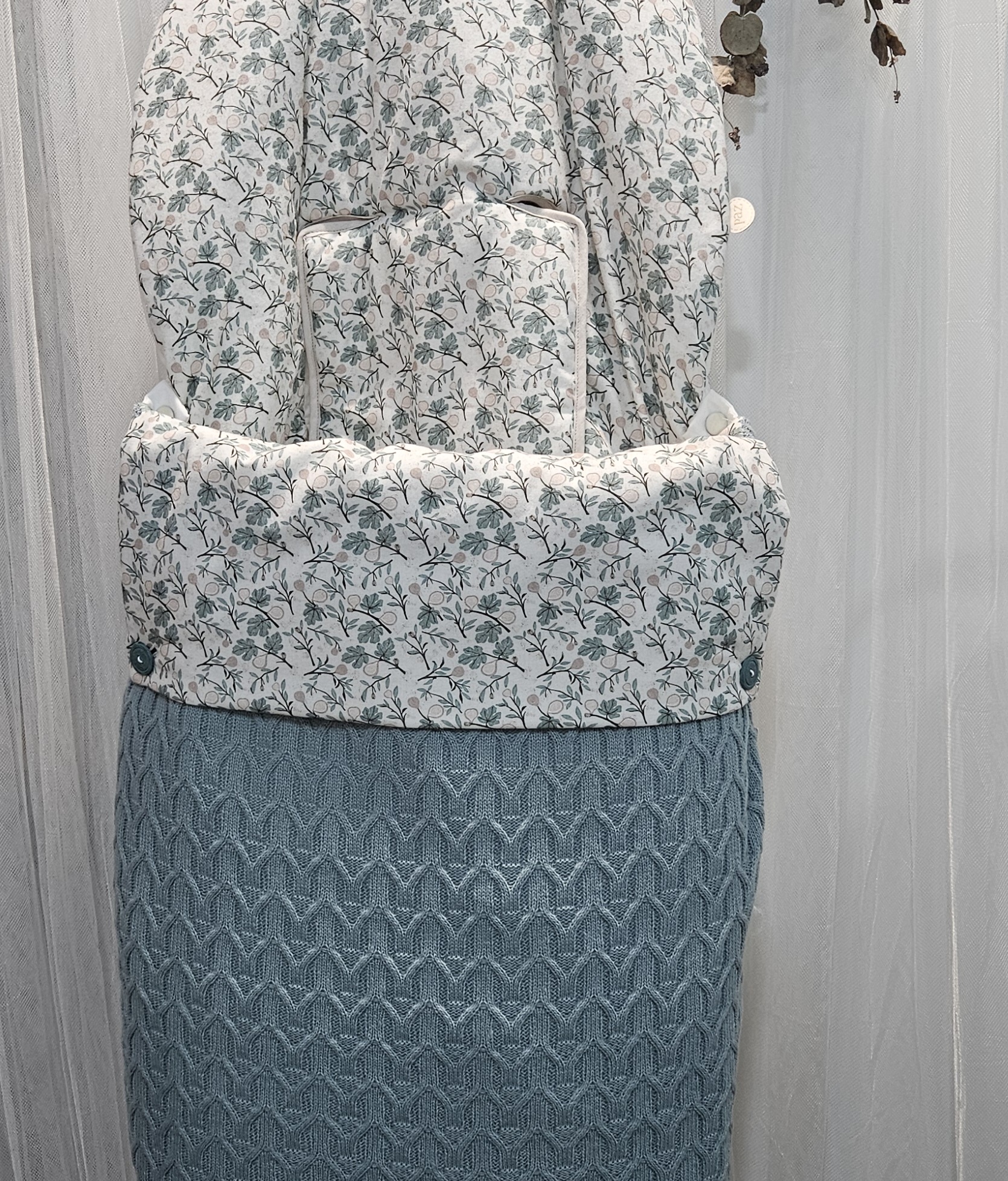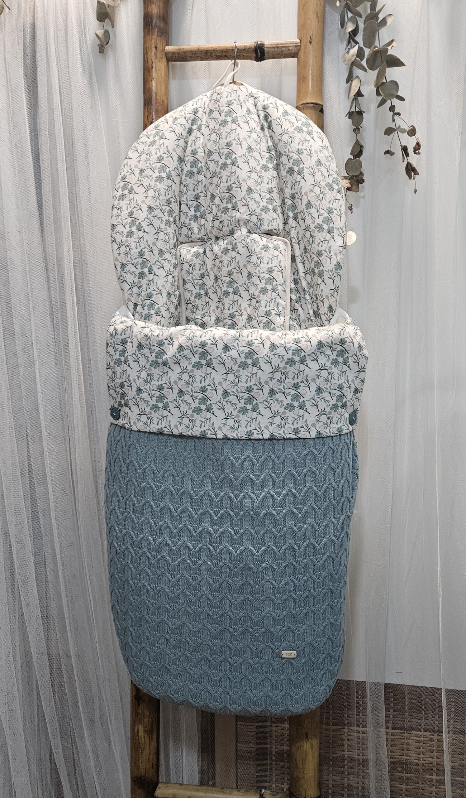 Saco universal para sillas bebé confeccionado en punto exterior estampado tonos verde y arena. Cremalleras laterales para convertir el saco en colchoneta. Relleno extraíble.