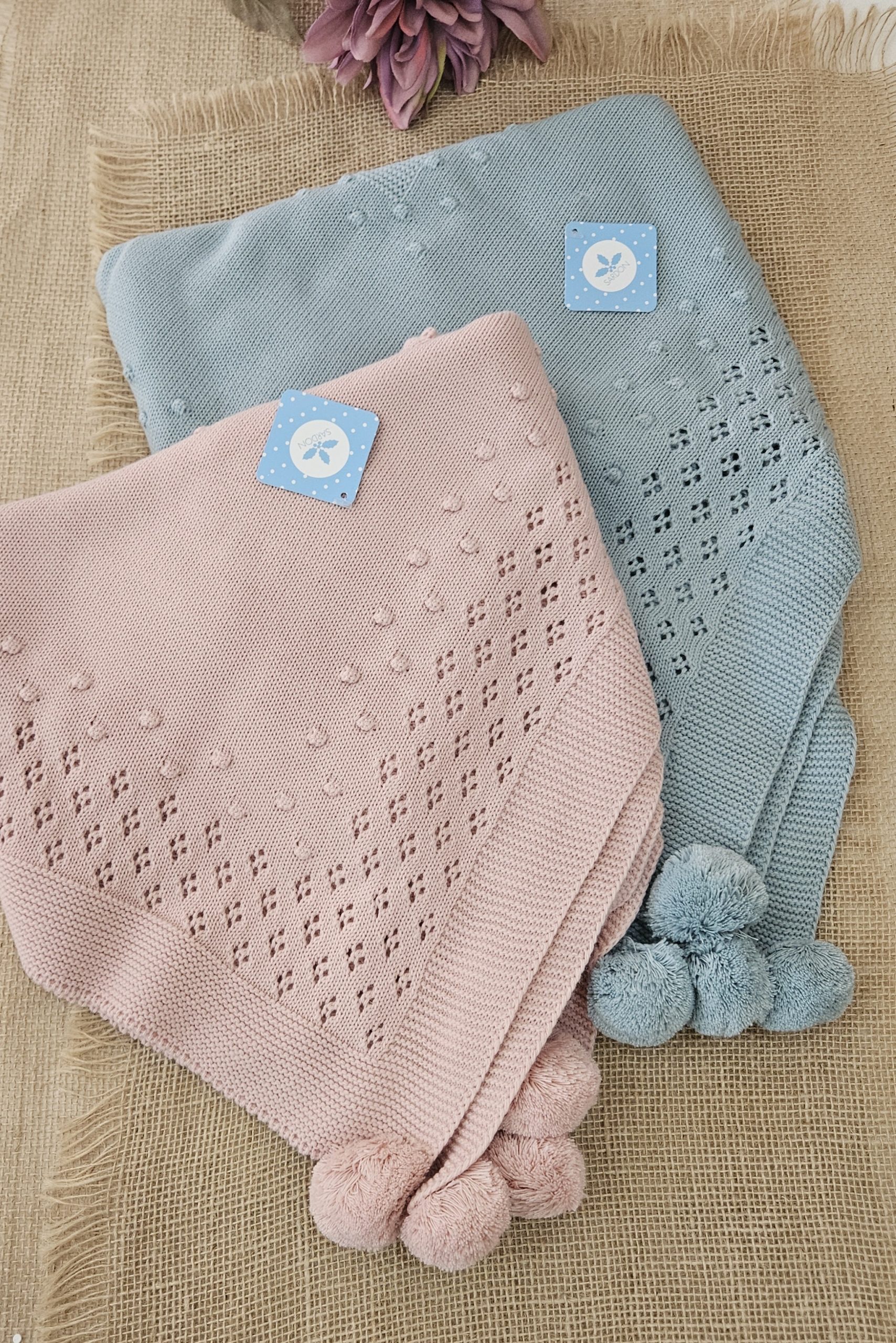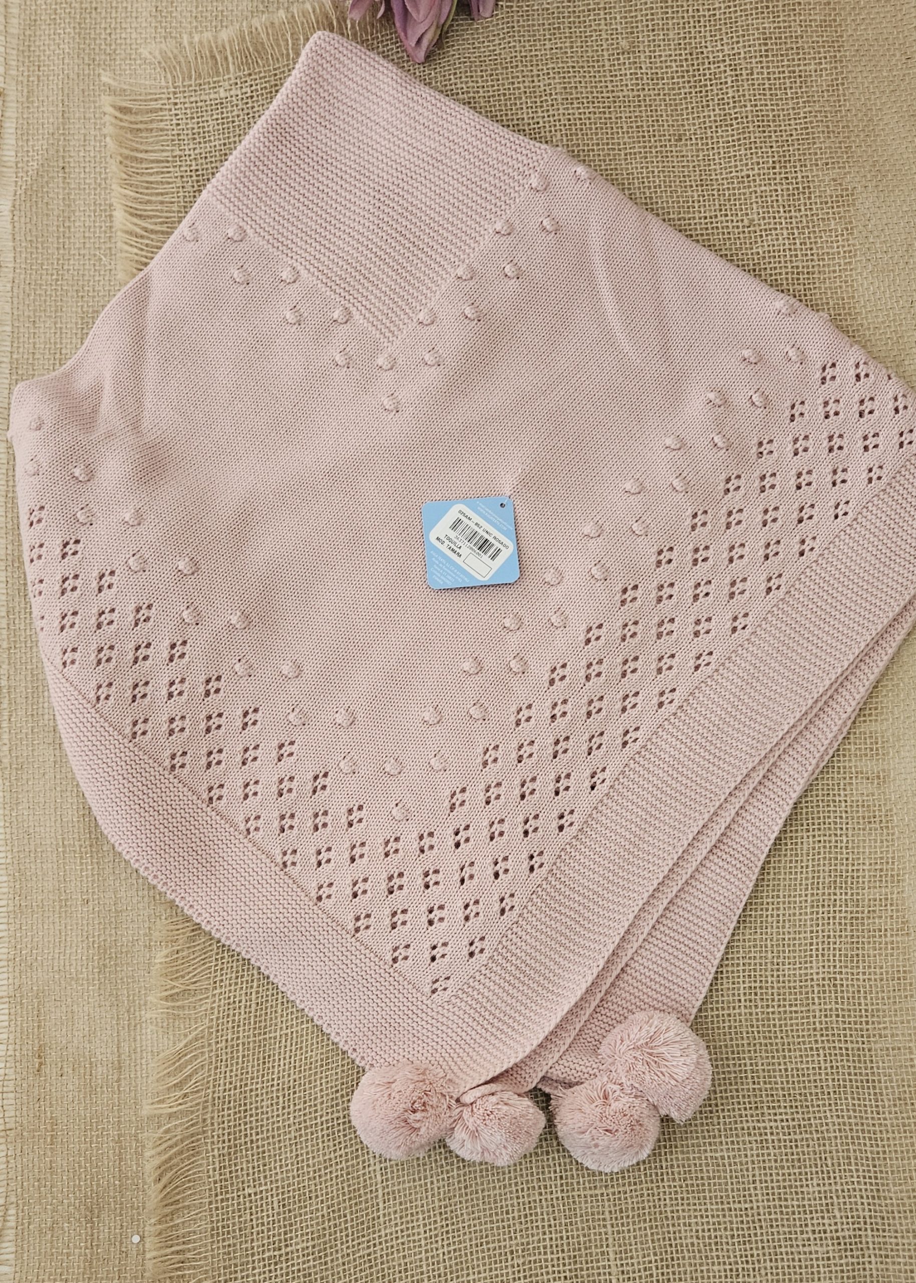 Toquilla / chal bebé ideal para la canastilla de tu bebé, punto liso con pequeños bodoques del mismo punto y calado con adorno borlones. Color Rosado