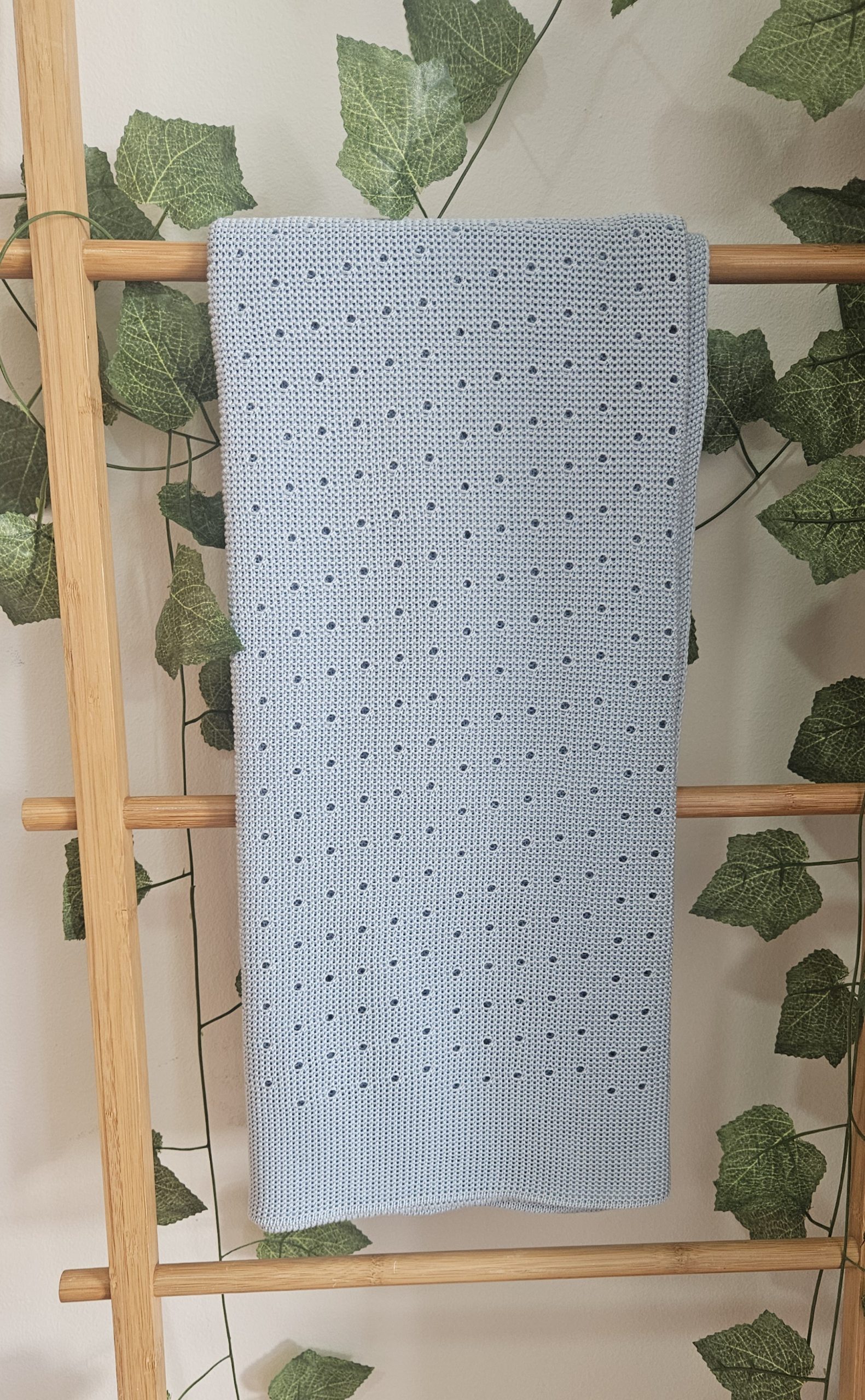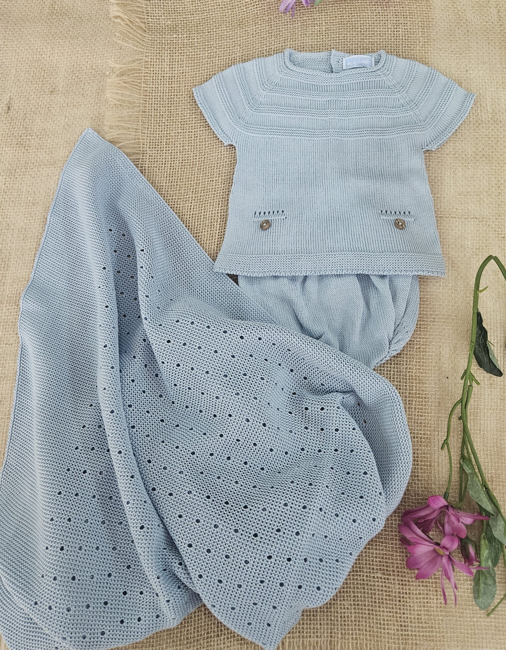 Toquilla chal de punto para bebés Mac Ilusión  . Color Brisa (azulón) calado tupido circulos.